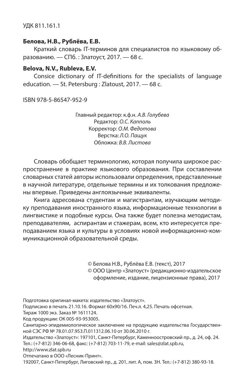 Словарь обобщает терминологию, которая получила широкое распространение в практике языкового образования. При составлении словарных статей авторы использовали определения, представленныет в научной литературе, отдельные термины и их толкования предложены впервые. Приведены англоязычные эквиваленты.