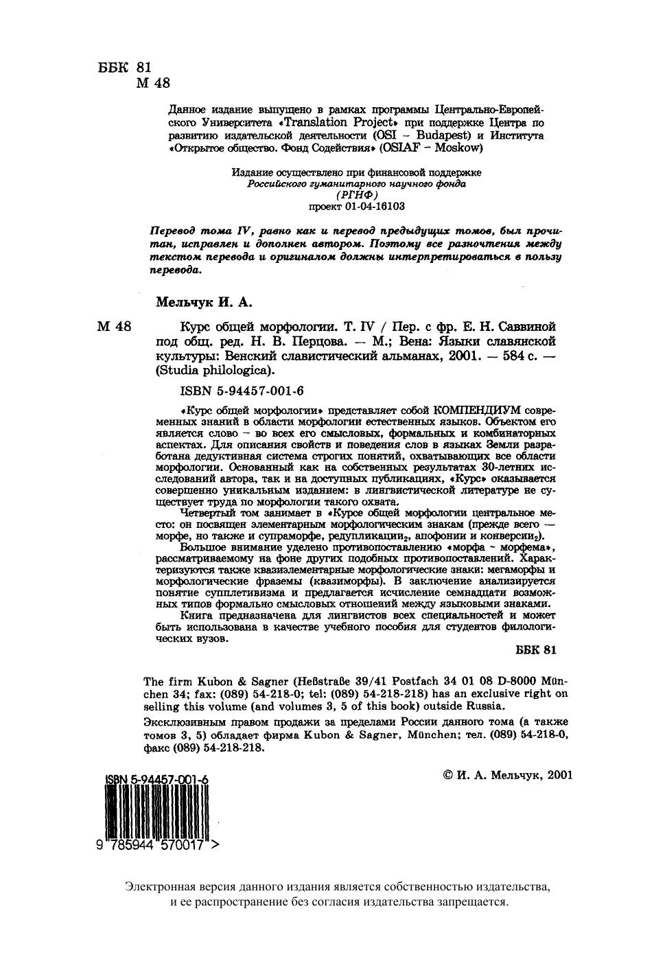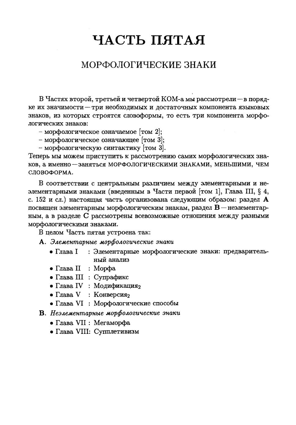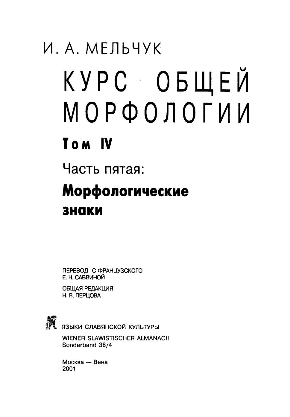 Курс общей морфологии» представляет собой КОМПЕНДИУМ современных знании в области морфологии естественных языков. Объектом его является слово - во всех его смысловых, формальных и комбинаторных аспектах. Для описания свойств и поведения слов в языках Земли разработана дедуктивная система строгих понятий, охватывающих все области морфологии. Основанный как на собственных результатах 30-летних исследований автора, так и на доступных публикациях, «Курс» оказывается совершенно уникальным изданием: в лингвистической литературе не существует труда по морфологии такого охвата. Четвертый том занимает в «Курсе общей морфологии центральное место: он посвящен элементарным морфологическим знакам (прежде всего — морфе, но также и супраморфе, редупликации2, апофонии и конверсии2). Большое внимание уделено противопоставлению «морфа - морфема», рассматриваемому на фоне других подобных противопоставлений. Характеризуются также квазиэлементарные морфологические знаки: мегаморфы и морфологические фраземы (квазиморфы). В заключение анализируется понятие супплетивизма и предлагается исчисление семнадцати возможных типов формально смысловых отношений между языковыми знаками. Книга предназначена для лингвистов всех специальностей и может быть использована в качестве учебного пособия для студентов филологических вузов.