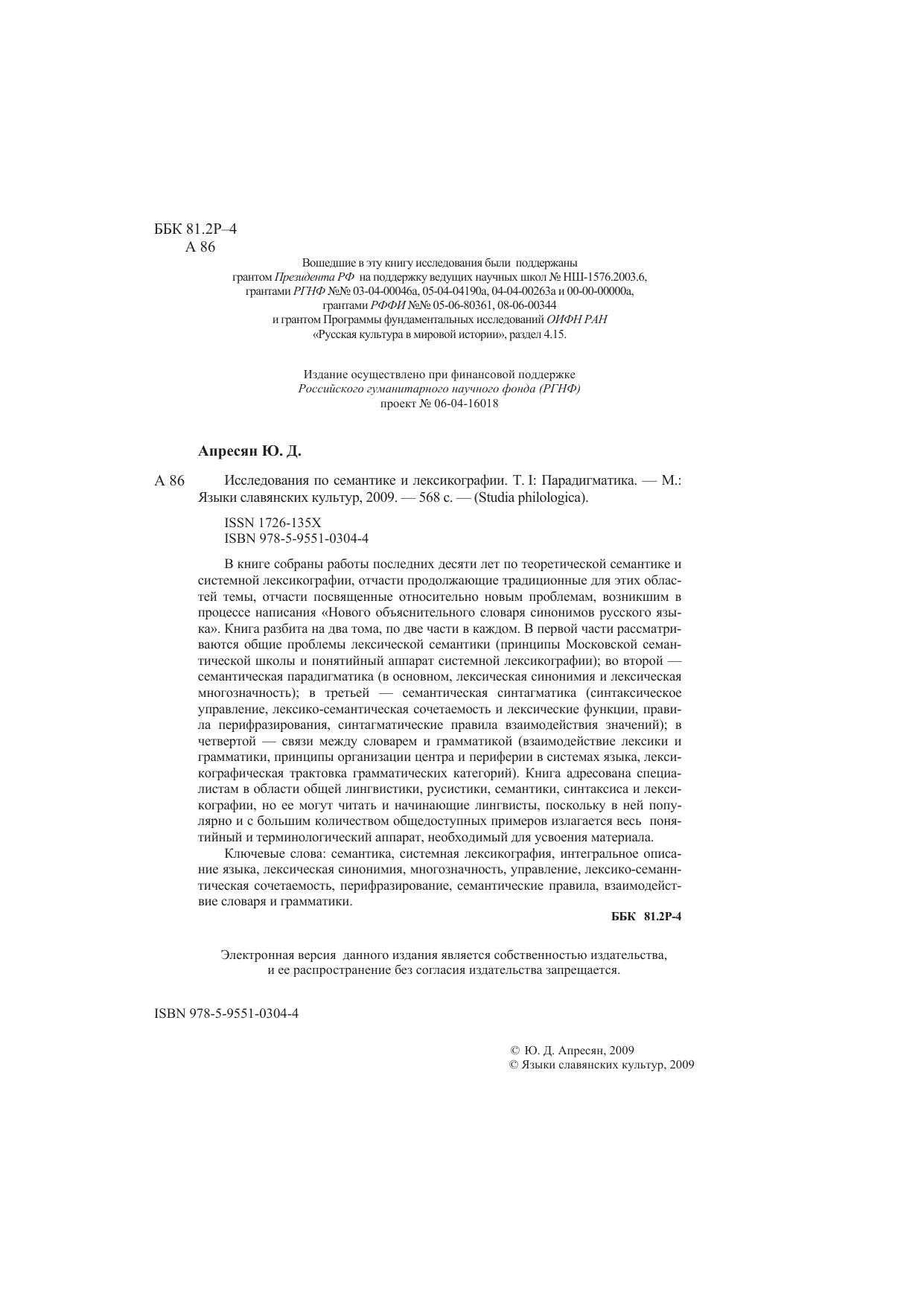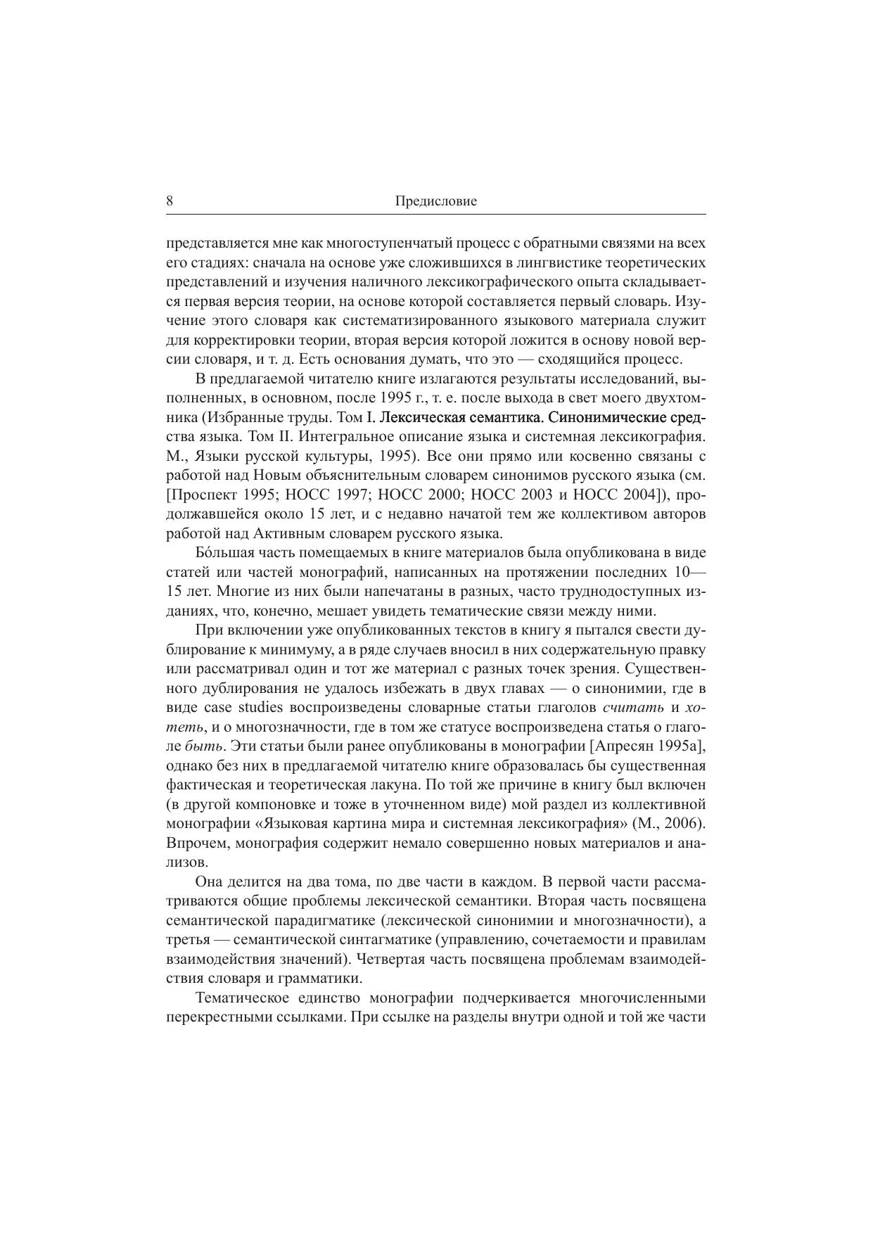 В книге собраны работы последних десяти лет по теоретической семантике и системной лексикографии, отчасти продолжающие традиционные для этих областей темы, отчасти посвященные относительно новым проблемам, возникшим в процессе написания «Нового объяснительного словаря синонимов русского языка». Книга разбита на два тома, по две части в каждом. В первой части рассматриваются общие проблемы лексической семантики (принципы Московской семантической школы и понятийный аппарат системной лексикографии), во второй — семантическая парадигматика (в основном, лексическая синонимия и лексическая многозначность), в третьей — семантическая синтагматика (синтаксическое управление, лексико-семантическая сочетаемость и лексические функции, правила перифразирования, синтагматические правила взаимодействия значений), в четвертой — связи между словарем и грамматикой (взаимодействие лексики и грамматики, принципы организации центра и периферии в системах языка, лексикографическая трактовка грамматических категорий). Книга адресована специалистам в области общей лингвистики, русистики, семантики, синтаксиса и лексикографии, но ее могут читать и начинающие лингвисты, поскольку в ней популярно и с большим количеством общедоступных примеров излагается весь понятийный и терминологический аппарат, необходимый для усвоения материала.
