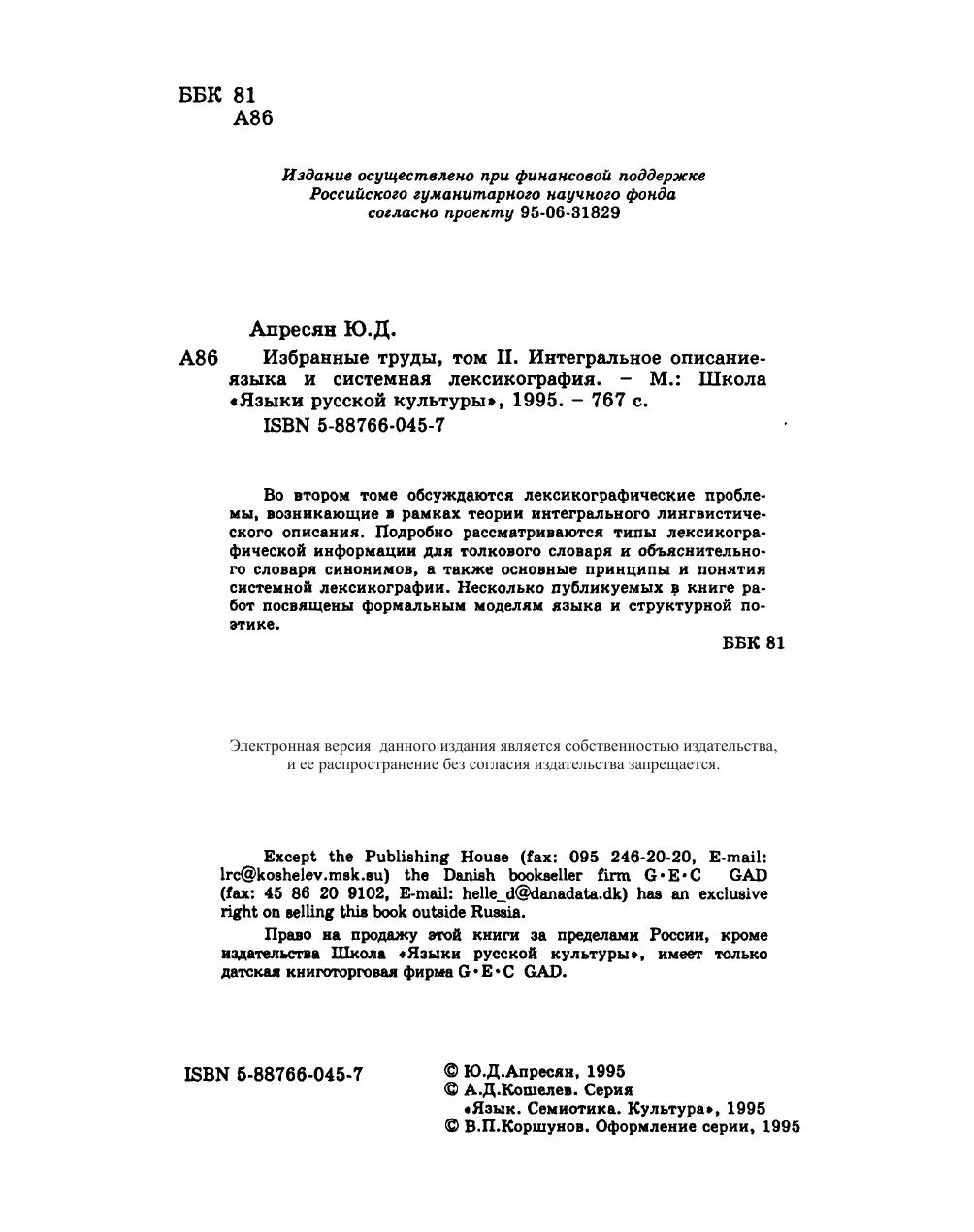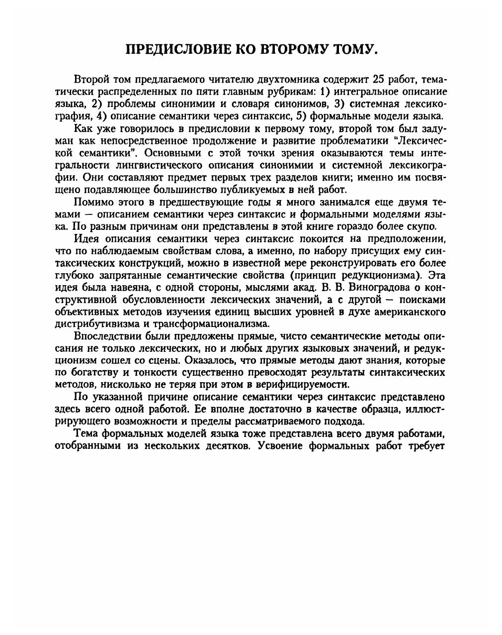 Во втором томе обсуждаются лексикографические проблемы, возникающие в рамках теории интегрального лингвистического описания. Подробно рассматриваются типы лексикографической информации для толкового словаря и объяснительного словаря синонимов, а также основные принципы и понятия системной лексикографии. Несколько публикуемых в книге работ посвящены формальным моделям языка и структурной поэтике. Для научных работников, широкого круга специалистов.