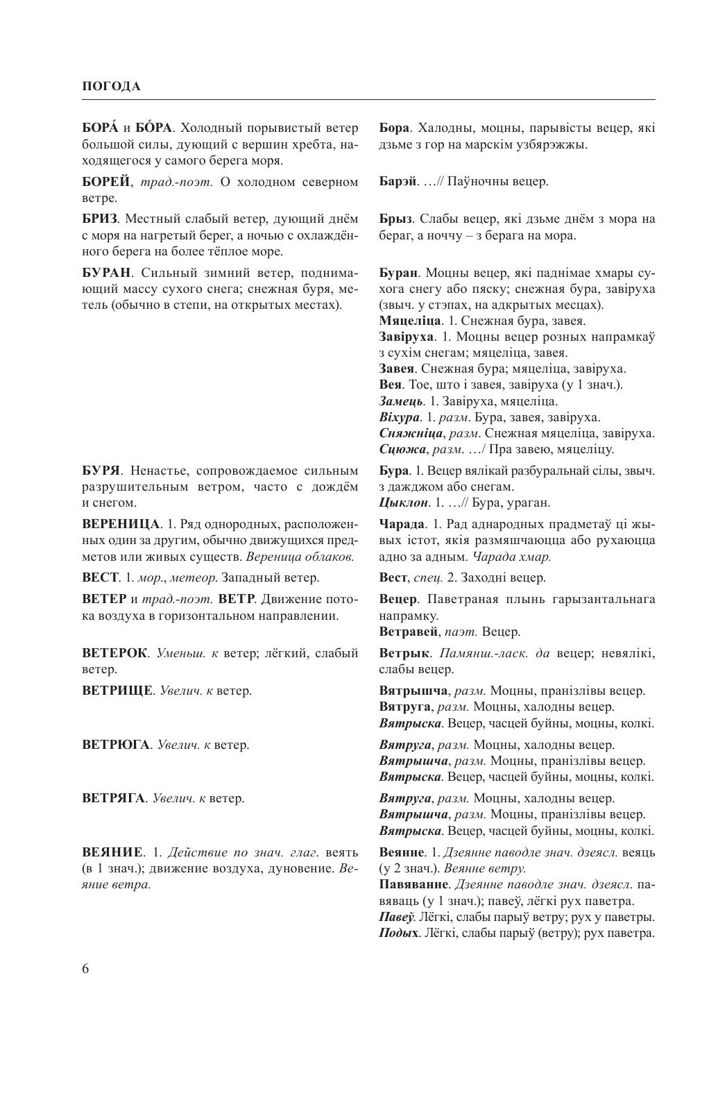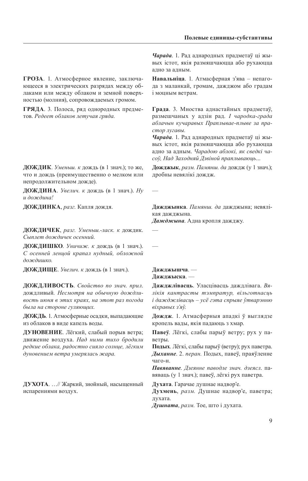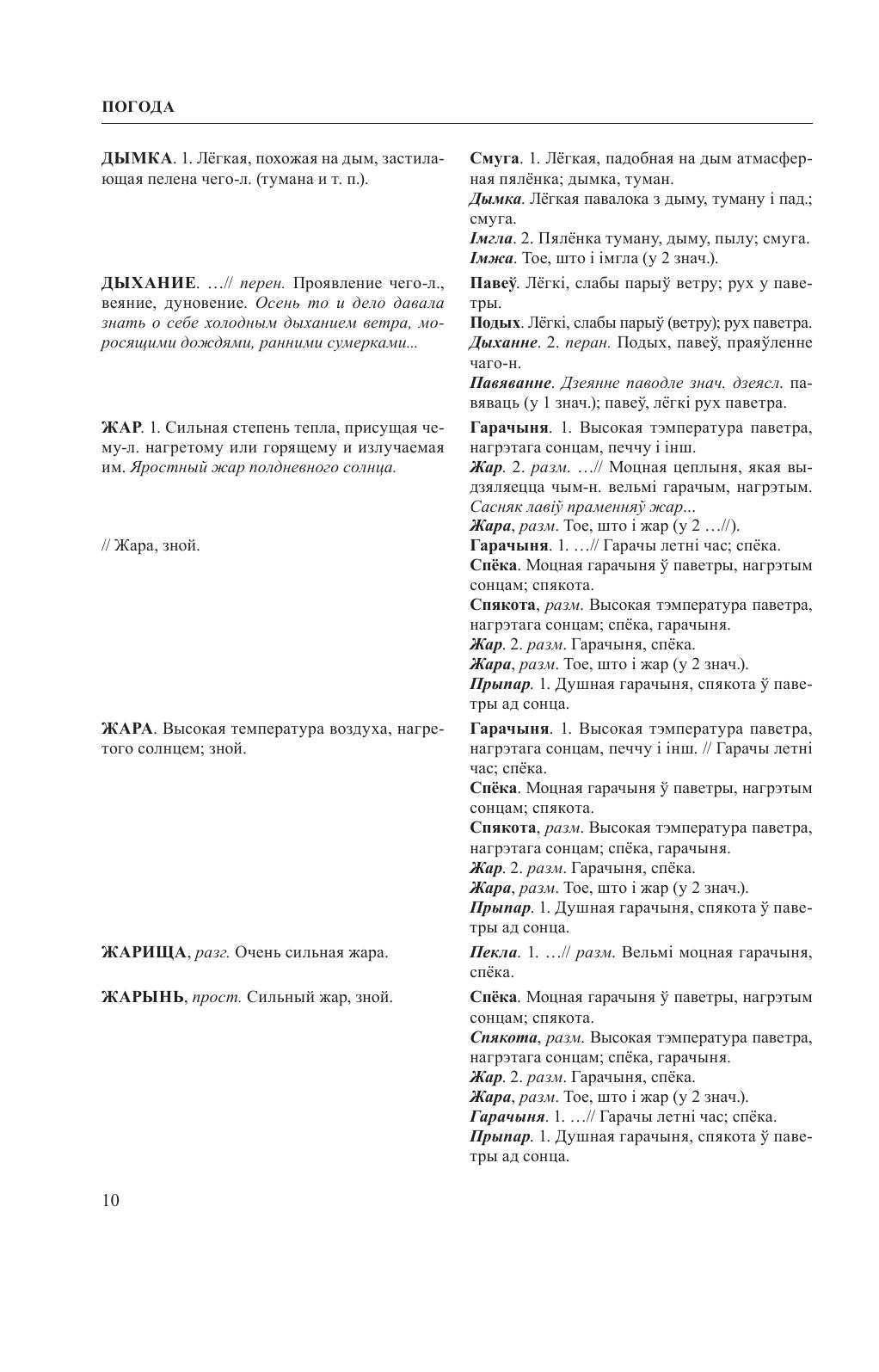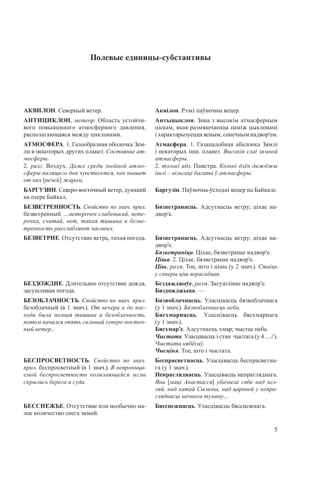 Издание является первым отечественным опытом составления переводного словаря оригинального типа, в котором показано межъязыковое соотношение русских и белорусских лексических соответствий, входящих на основании общего семантического признака в лексико-семантические поля географического ландшафта, движения без перемещения, звука, перемещения в пространстве, погоды, речи, цвета, эмоций, представляющие важнейшие жизненные сферы человека. В словарь включены наименования явлений и предметов, их признаков, а также процессов и действий. Материал словаря предоставляет возможность выбора наиболее точного межъязыкового эквивалента. Предназначено для лексикографов и специалистов-языковедов в области лексической семантики, может представлять интерес для преподавателей, аспирантов, студентов филологических специальностей.