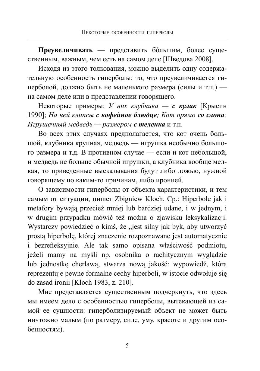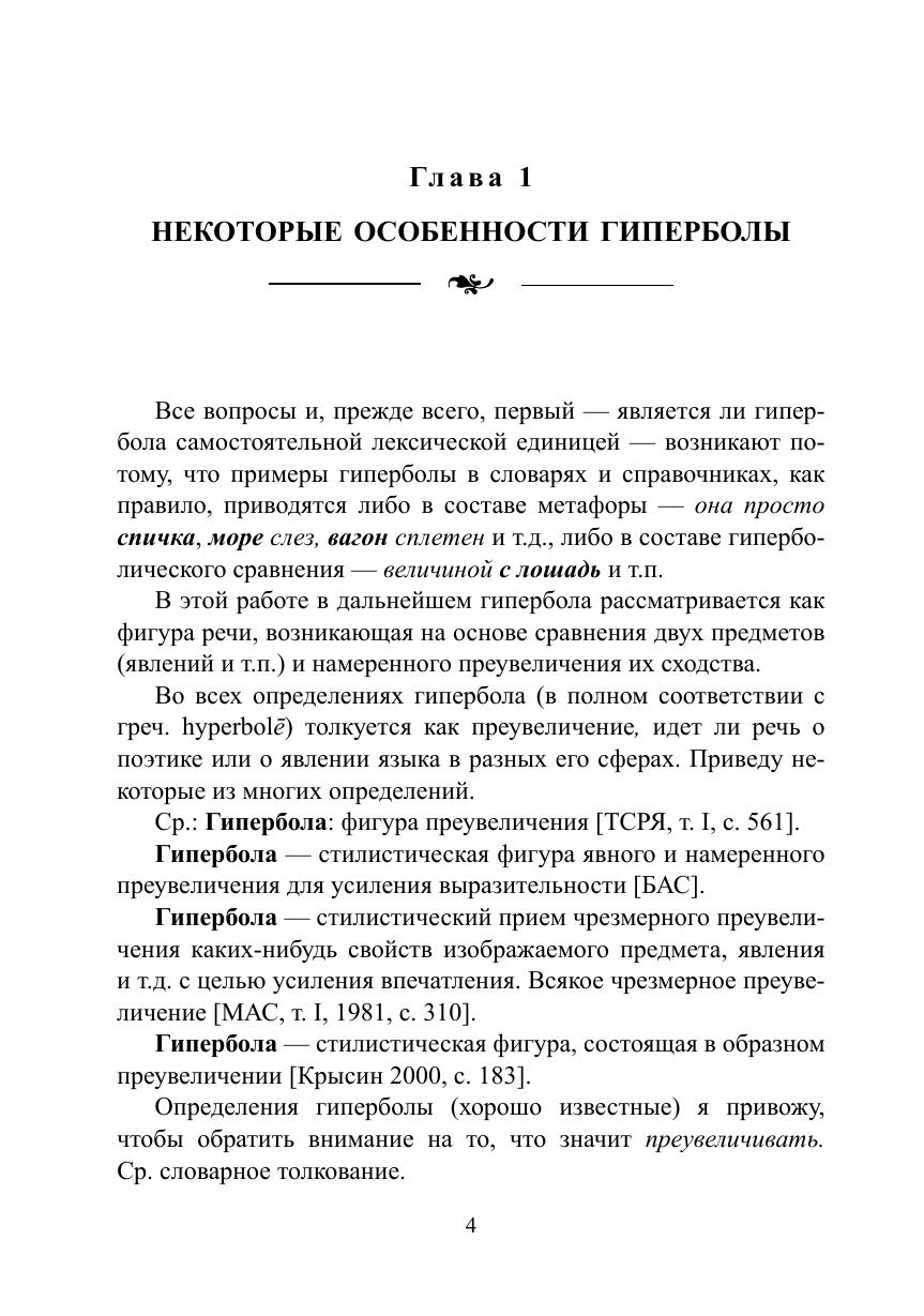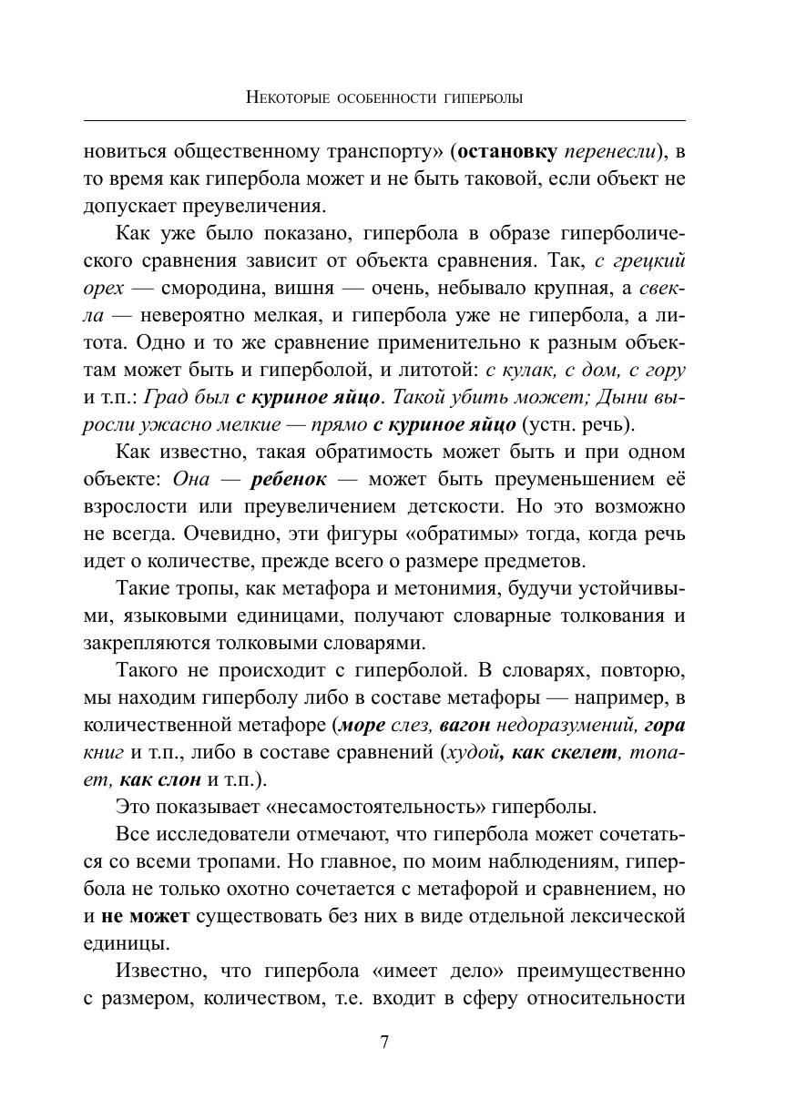 В этой книге гипербола исследуется в её отношении к слову как единице лексики, но не текста. В задачу работы не входит анализ гиперболы — как средства изобразительности в языке художественной литературы. Примеры из текстов художественной литературы приводятся для иллюстрации высказываемых суждений. Автора интересуют вопросы: порождает ли гиперболизация как прием чрезмерного преувеличения самостоятельные лексические единицы, подобно тому, как прием метафоризации порождает метафору, а перенос по смежности — метонимию, как гипербола относится к тропам, с какими тропами активно взаимодействует, влияет ли ирония на проникновение гиперболы в разные виды тропов. В книге также рассматривается одно из смежных с гиперболой явлений — интенсификация, которую часто отождествляют с гиперболизацией, и другие вопросы.