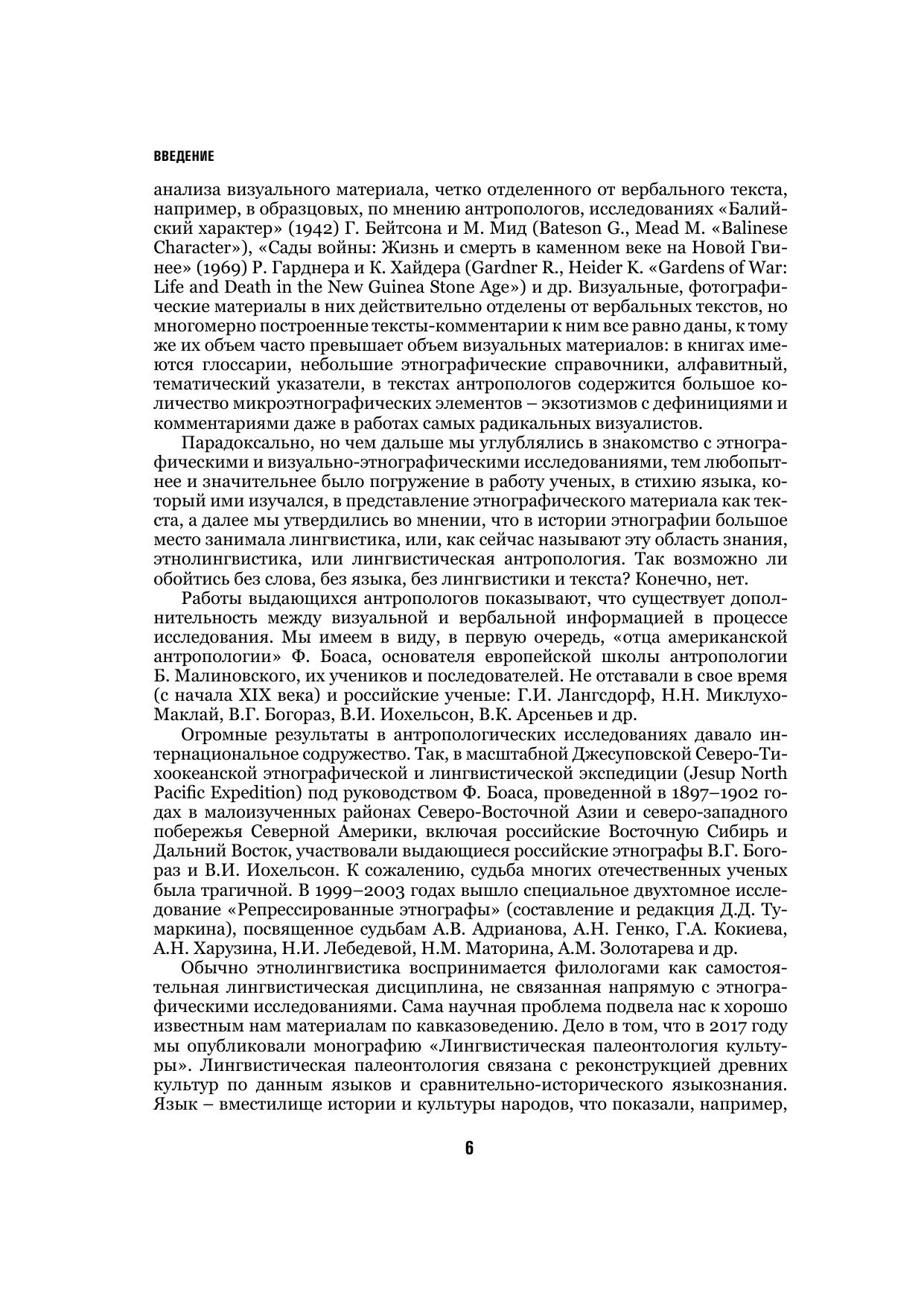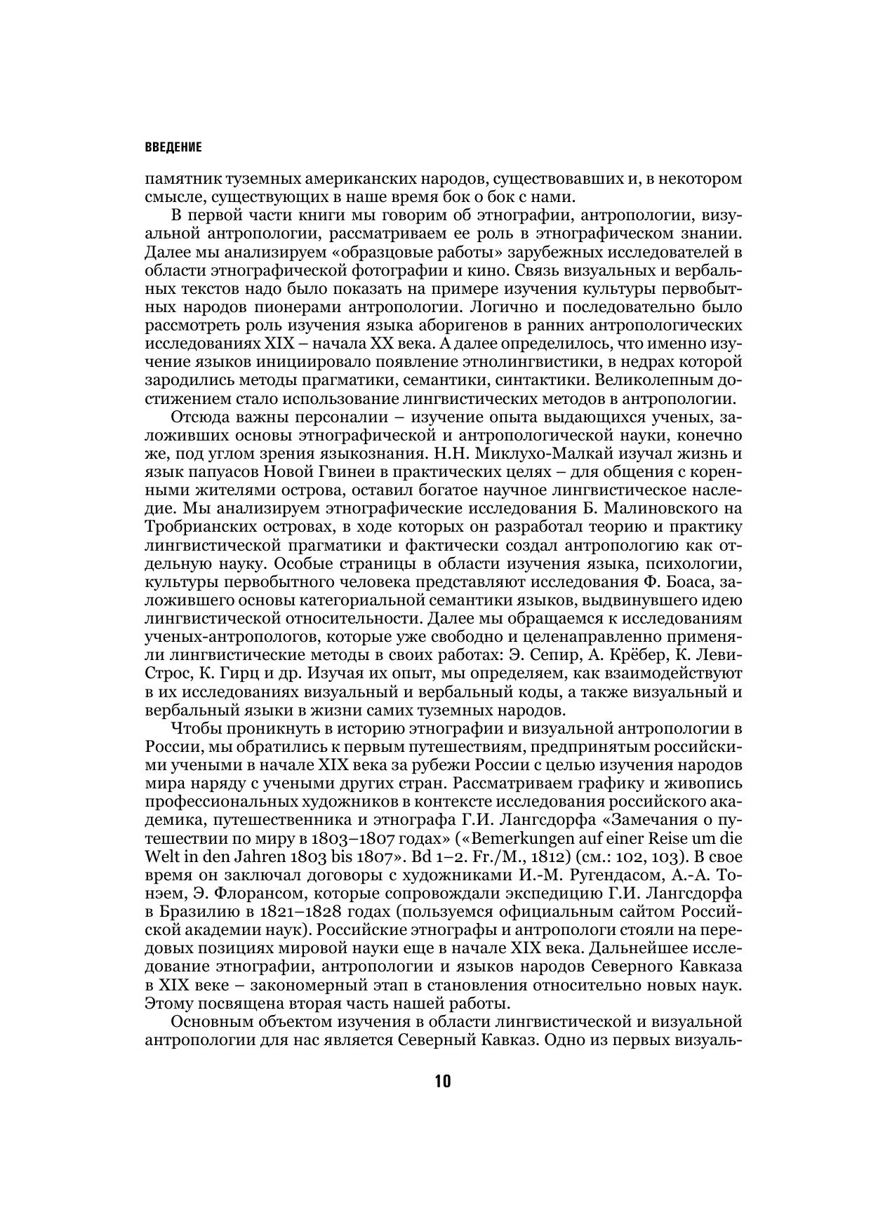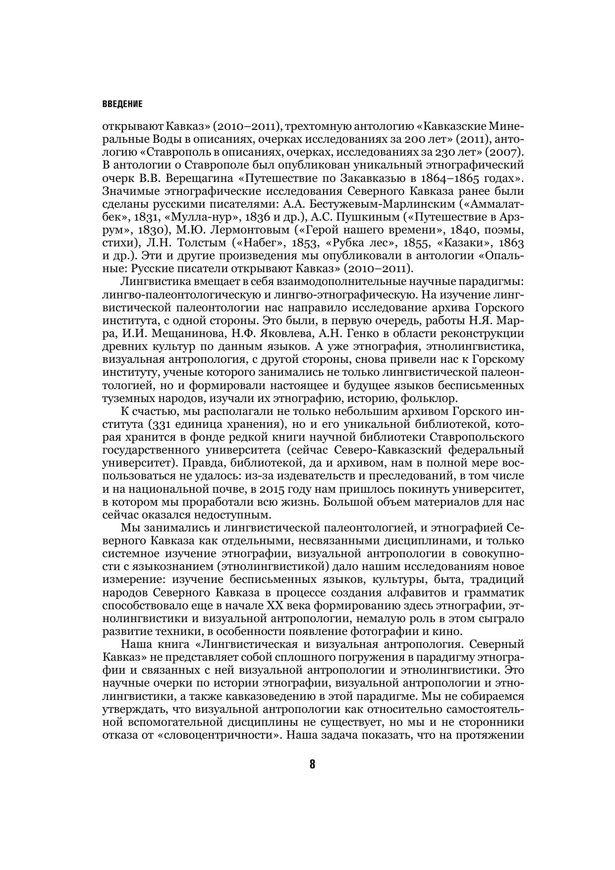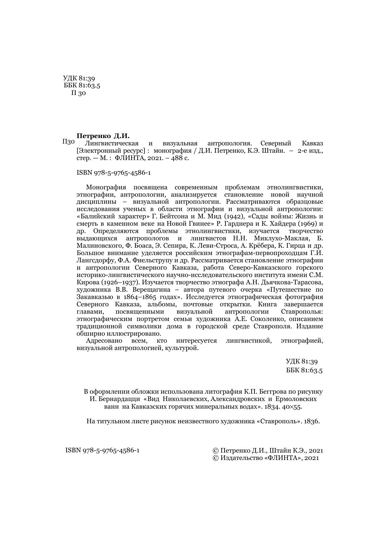 Монография посвящена современным проблемам этнолингвистики, этнографии, антропологии, анализируется становление новой научной дисциплины – визуальной антропологии. Рассматриваются образцовые исследования ученых в области этнографии и визуальной антропологии: «Балийский характер» Г. Бейтсона и М. Мид (1942), «Сады вой ны: Жизнь и смерть в каменном веке на Новой Гвинее» Р. Гарднера и К. Хайдера (1969) и др. Определяются проблемы этнолингвистики, изучается творчество выдающихся антропологов и лингвистов Н.Н. Миклухо-Маклая, Б. Малиновского, Ф. Боаса, Э. Сепира, К. Леви-Строса, А. Крёбера, К. Гирца и др. Большое внимание уделяется российским этнографам-первопроходцам Г.И. Лангсдорфу, Ф.А. Фиельструпу и др. Рассматривается становление этнографии и антропологии Северного Кавказа, работа Северо-Кавказского горского историко-лингвистического научно-исследовательского института имени С.М. Кирова (1926–1937). Изучается творчество этнографа А.Н. Дьячкова-Тарасова, художника В.В. Верещагина – автора путевого очерка «Путешествие по Закавказью в 1864–1865 годах». Исследуется этнографическая фотография Северного Кавказа, альбомы, почтовые открытки. Книга завершается главами, посвященными визуальной антропологии Ставрополья: этнографическим портретом семьи художника А.Е. Соколенко, описанием традиционной символики дома в городской среде Ставрополя. Издание обширно иллюстрировано.