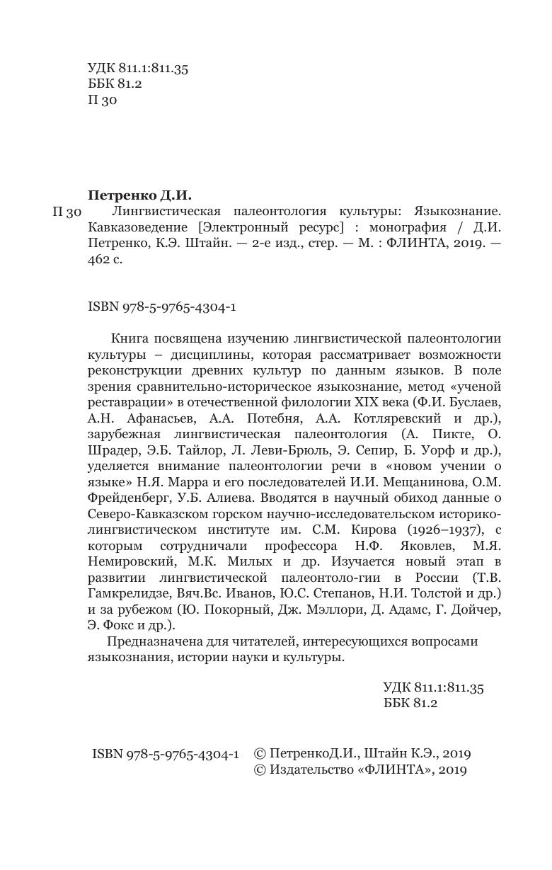 Книга посвящена изучению лингвистической палеонтологии культуры – дисциплины, которая рассматривает возможности реконструкции древних культур по данным языков. В поле зрения сравнительно-историческое языкознание, метод «ученой реставрации» в отечественной филологии XIX века (Ф.И. Буслаев, А.Н. Афанасьев, А.А. Потебня, А.А. Котляревский и др.), зарубежная лингвистическая палеонтология (А. Пикте, О. Шрадер, Э.Б. Тайлор, Л. Леви-Брюль, Э. Сепир, Б. Уорф и др.), уделяется внимание палеонтологии речи в «новом учении о языке» Н.Я. Марра и его последователей И.И. Мещанинова, О.М. Фрейденберг, У.Б. Алиева. Вводятся в научный обиход данные о Северо-Кавказском горском научно-исследовательском историко-лингвистическом институте им. С.М. Кирова (1926–1937), с которым сотрудничали профессора Н.Ф. Яковлев, М.Я. Немировский, М.К. Милых и др. Изучается новый этап в развитии лингвистической палеонтоло-гии в России (Т.В. Гамкрелидзе, Вяч.Вс. Иванов, Ю.С. Степанов, Н.И. Толстой и др.) и за рубежом (Ю. Покорный, Дж. Мэллори, Д. Адамс, Г. Дойчер, Э. Фокс и др.).