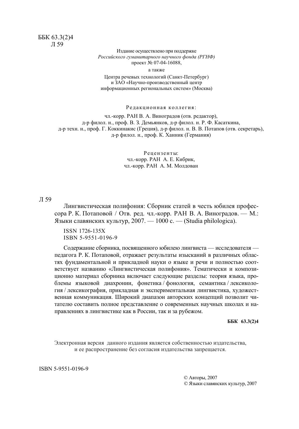 Содержание сборника, посвященного юбилею лингвиста - исследователя - педагога Р.К.Потаповой, отражает результаты изысканий в различных областях фундаментальной и прикладной науки о языке и речи и полностью соответствует названию "Лингвистическая полифония". Тематически и композиционно материал сборника включает следующие разделы: теория языка, проблемы языковой диахронии, фонетика / фонология, семантика / лексикология / лексикография, прикладная и экспериментальная лингвистика, художественная коммуникация. Широкий диапазон авторских концепций позволит читателю составить полное представление о современных научных школах и направлениях в лингвистике как в России, так и за рубежом.