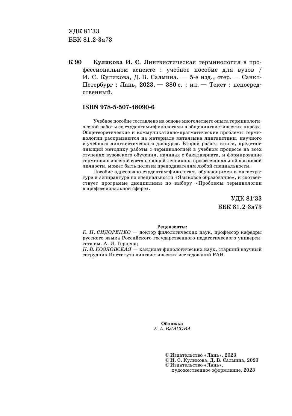 Учебное пособие составлено на основе многолетнего опыта терминологической работы со студентами филологами в общелингвистических курсах. Общетеоретические и коммуникативно-прагматические проблемы терминологии раскрываются на материале метаязыка лингвистики, научного и учебного лингвистического дискурса. Второй раздел книги, представляющий методику работы с терминологией в учебном процессе на всех ступенях вузовского обучения, начиная с бакалавриата, и формированию терминологической составляющей лексикона профессиональной языковой личности, может быть полезен преподавателям любой специальности.Пособие адресовано студентам-филологам, обучающимся в магистратуре и аспирантуре по специальности «Языковое образование» и соответствует программе дисциплины по выбору «Проблемы терминологии в профессиональной сфере».