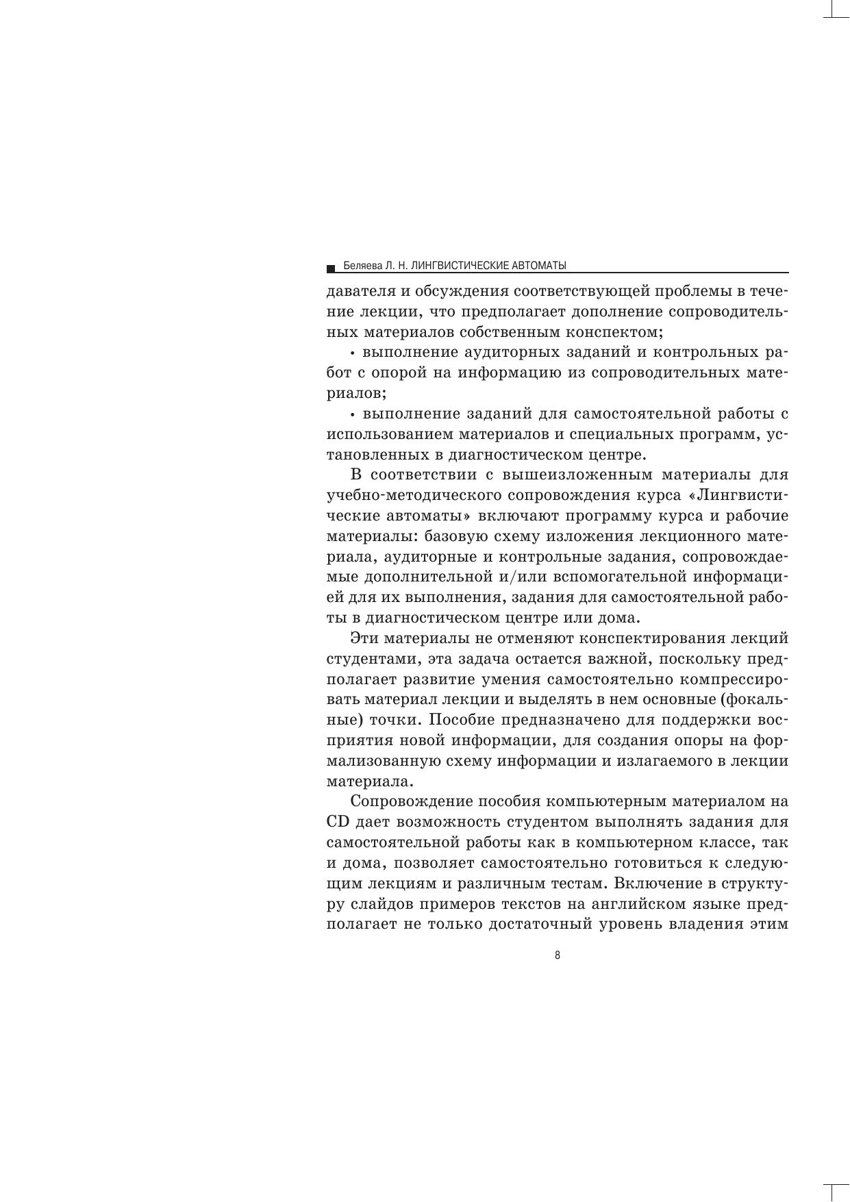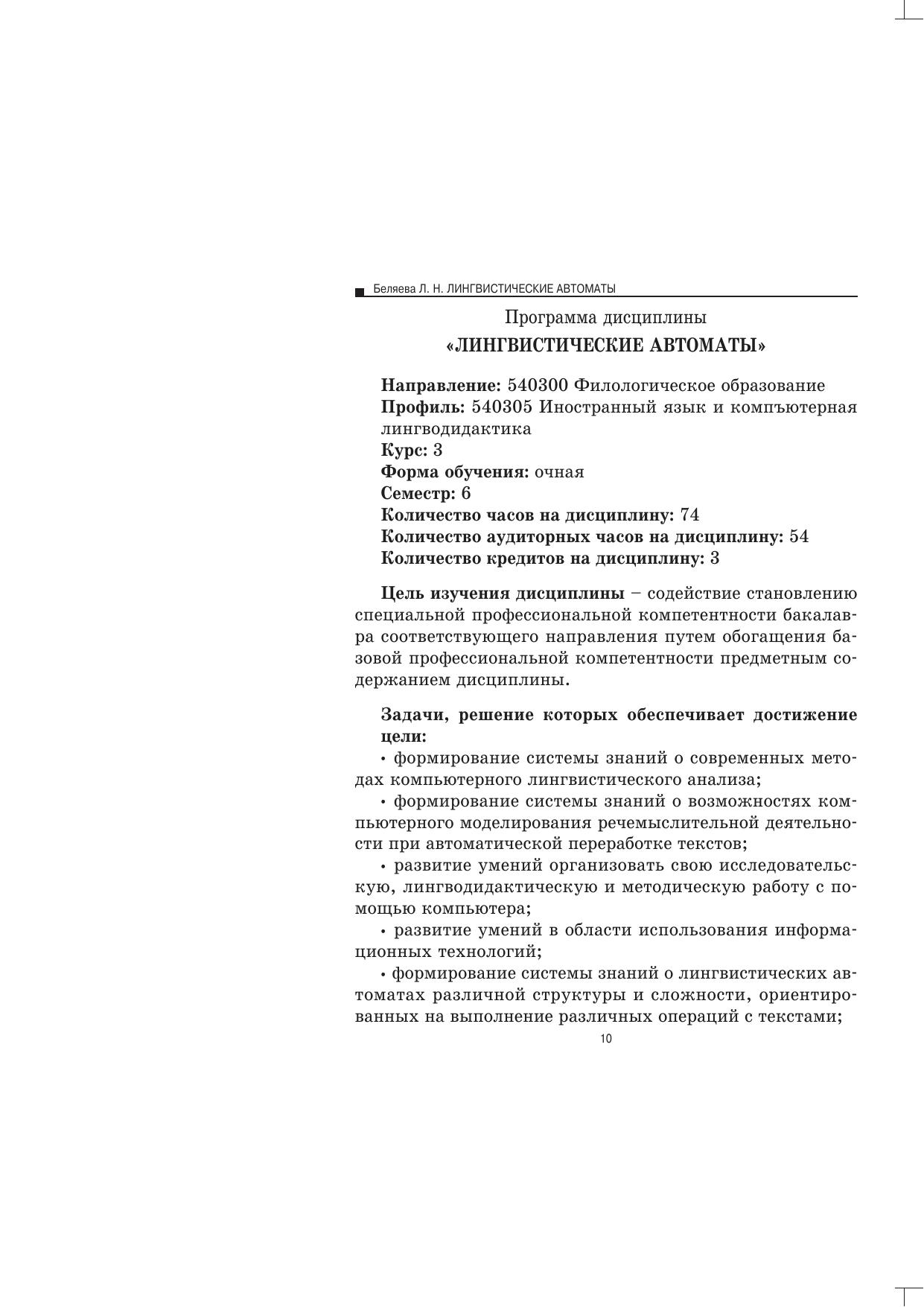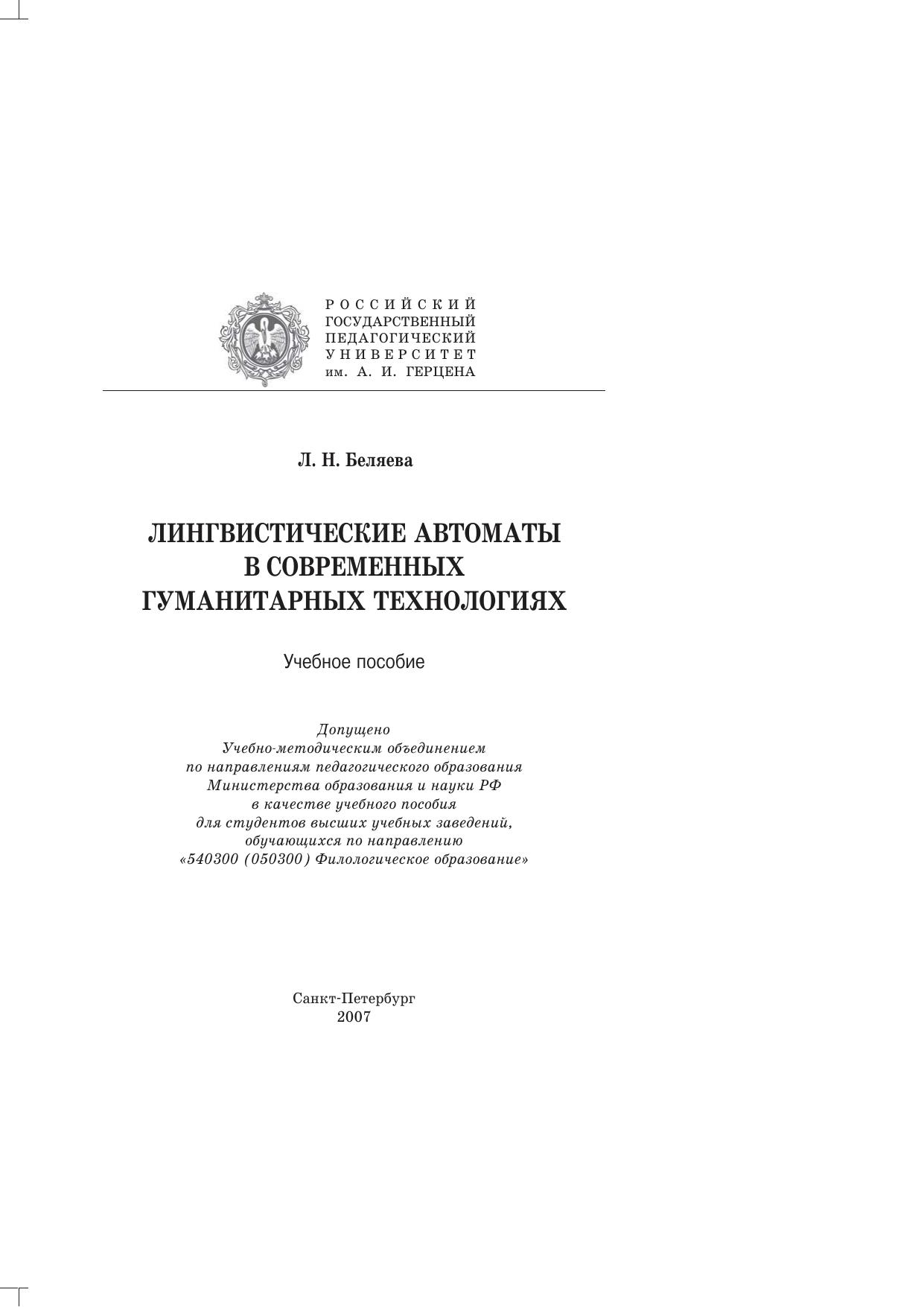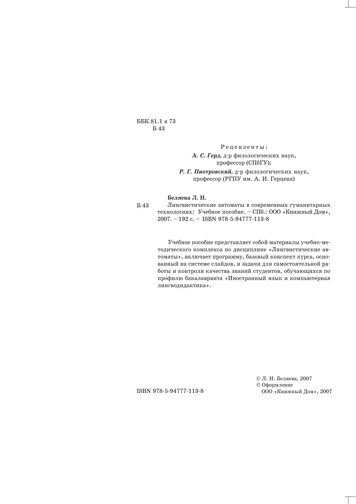 Учебное пособие представляет собой материалы учебно-методического комплекса по дисциплине «Лингвистические автоматы», включает программу, базовый конспект курса, основанный на системе слайдов, и задачи для самостоятельной работы и контроля качества знаний студентов, обучающихся по профилю бакалавриата «Иностранный язык и компьютерная лингводидактика».