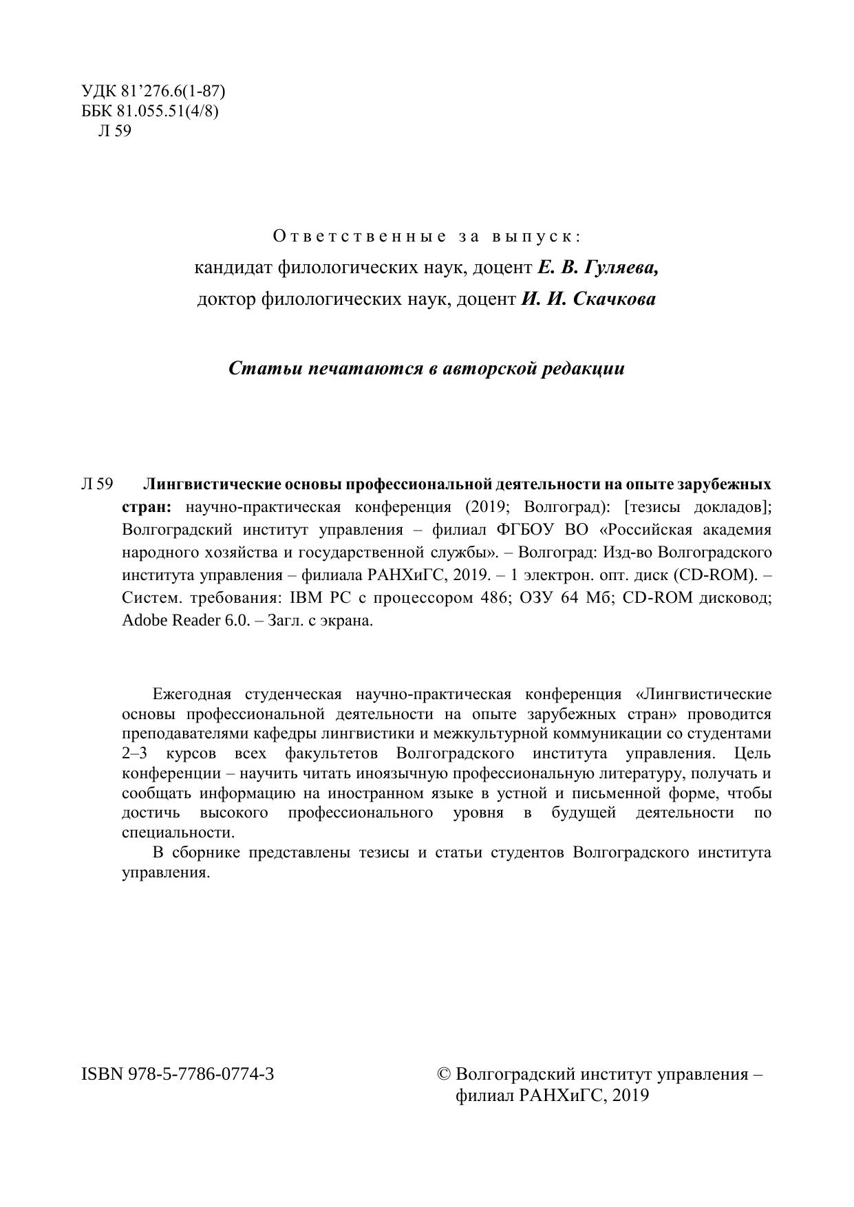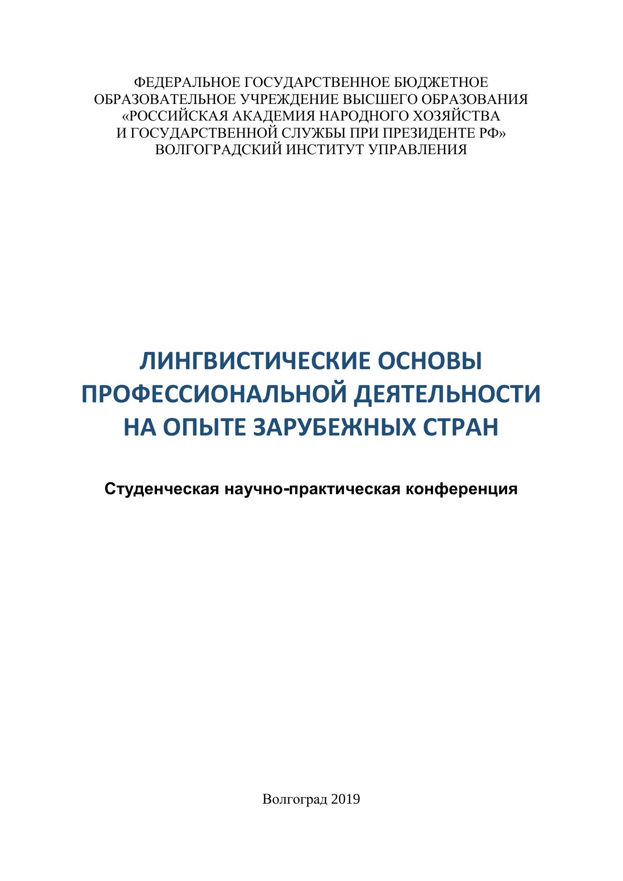 Лингвистические основы профессиональной деятельности на опыте зарубежных стран: научно-практическая конференция (2019; Волгоград)