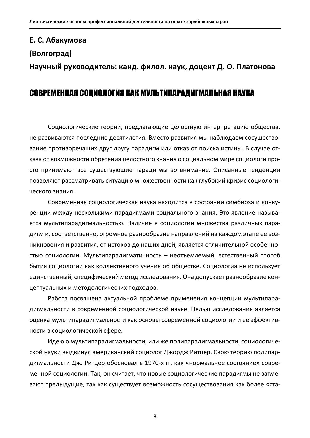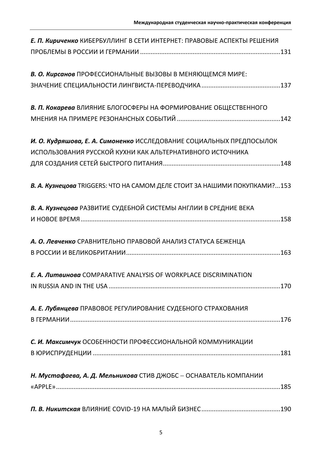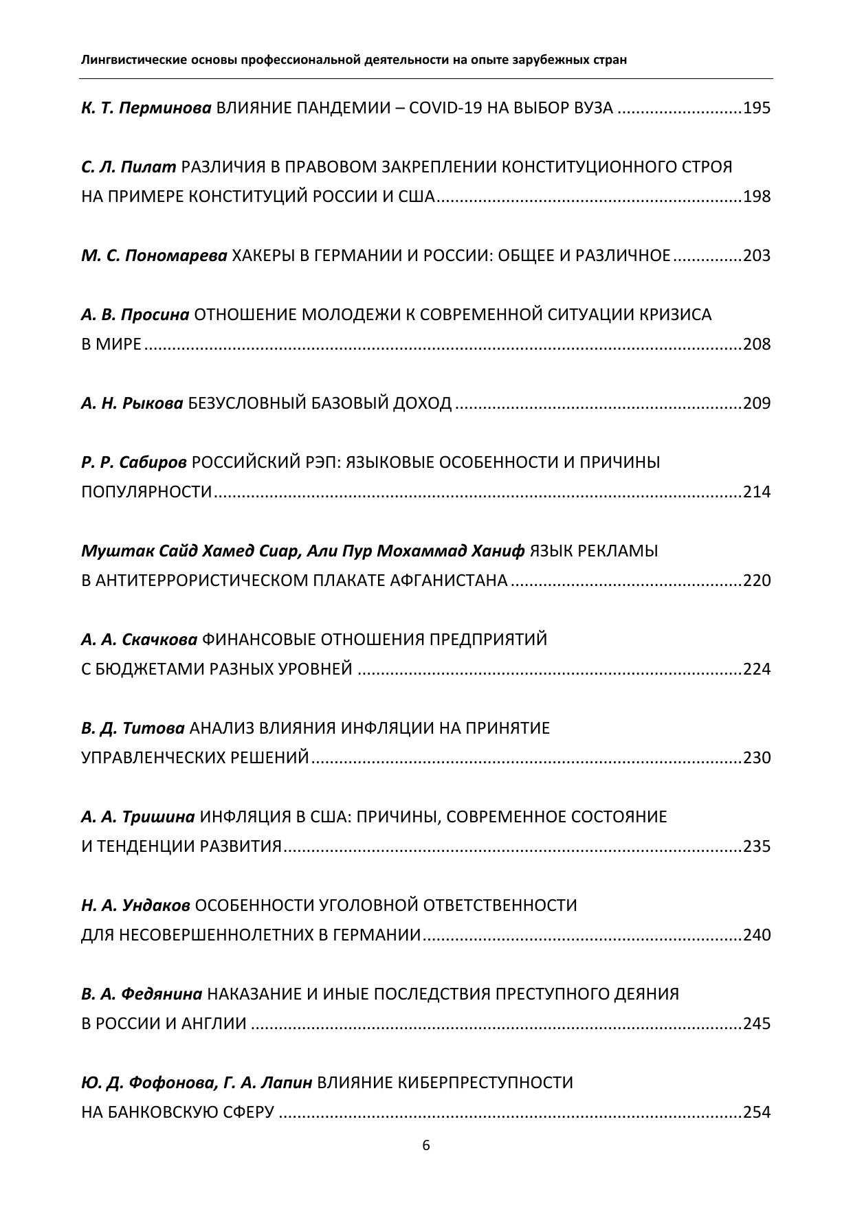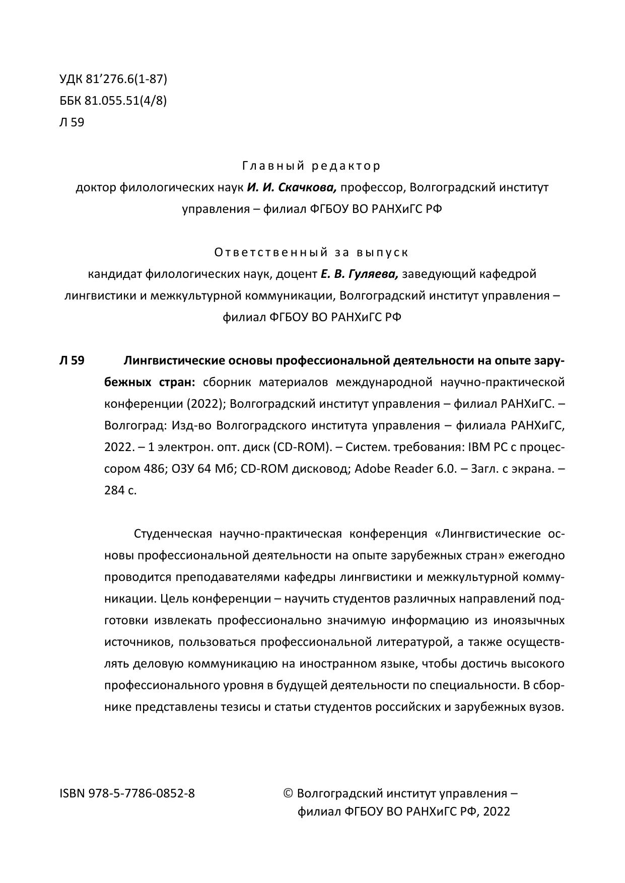 Студенческая научно-практическая конференция «Лингвистические ос-новы профессиональной деятельности на опыте зарубежных стран» ежегодно проводится преподавателями кафедры лингвистики и межкультурной комму-никации. Цель конференции – научить студентов различных направлений под-готовки извлекать профессионально значимую информацию из иноязычных источников, пользоваться профессиональной литературой, а также осуществ-лять деловую коммуникацию на иностранном языке, чтобы достичь высокого профессионального уровня в будущей деятельности по специальности. В сбор-нике представлены тезисы и статьи студентов российских и зарубежных вузов.