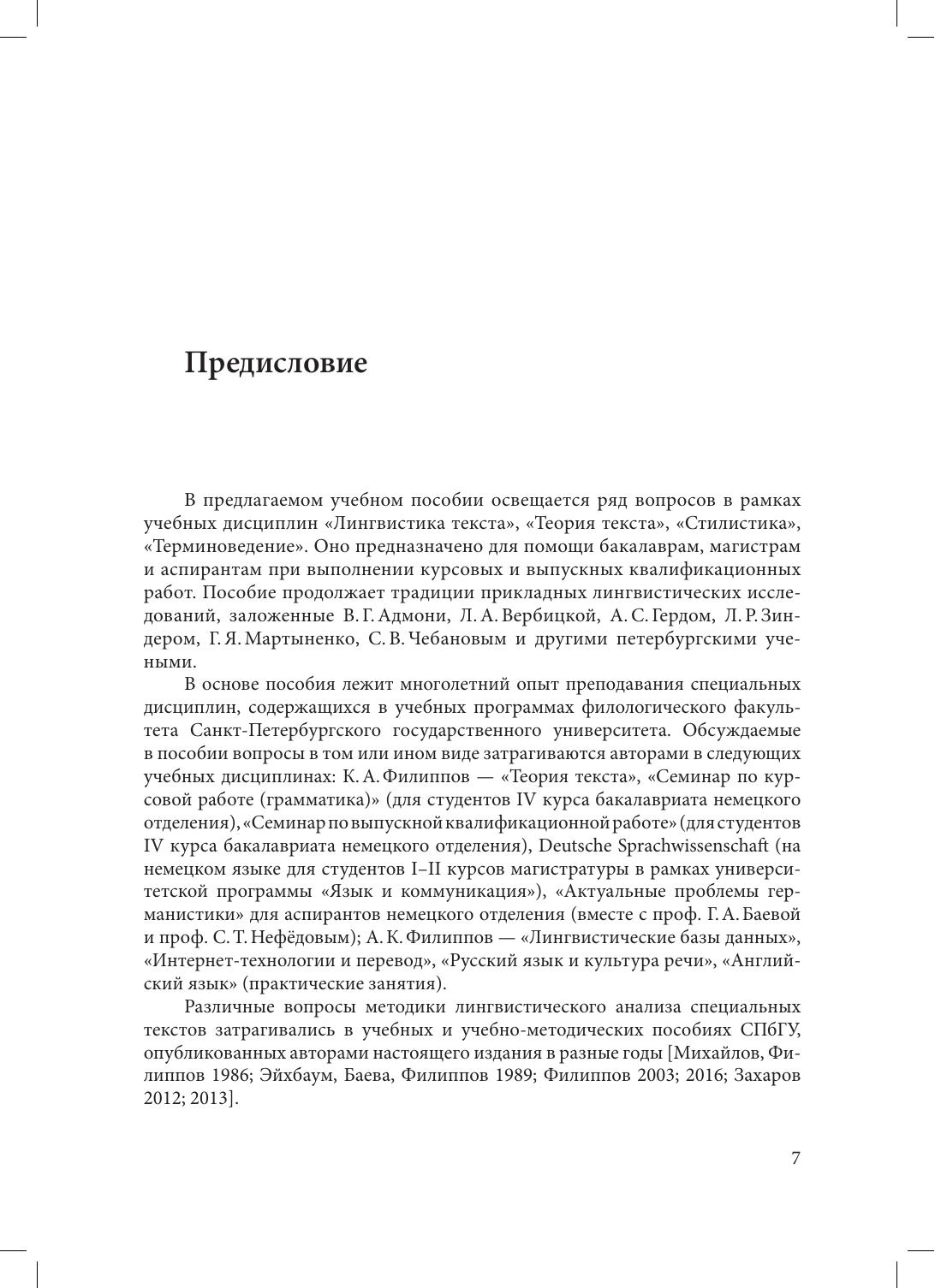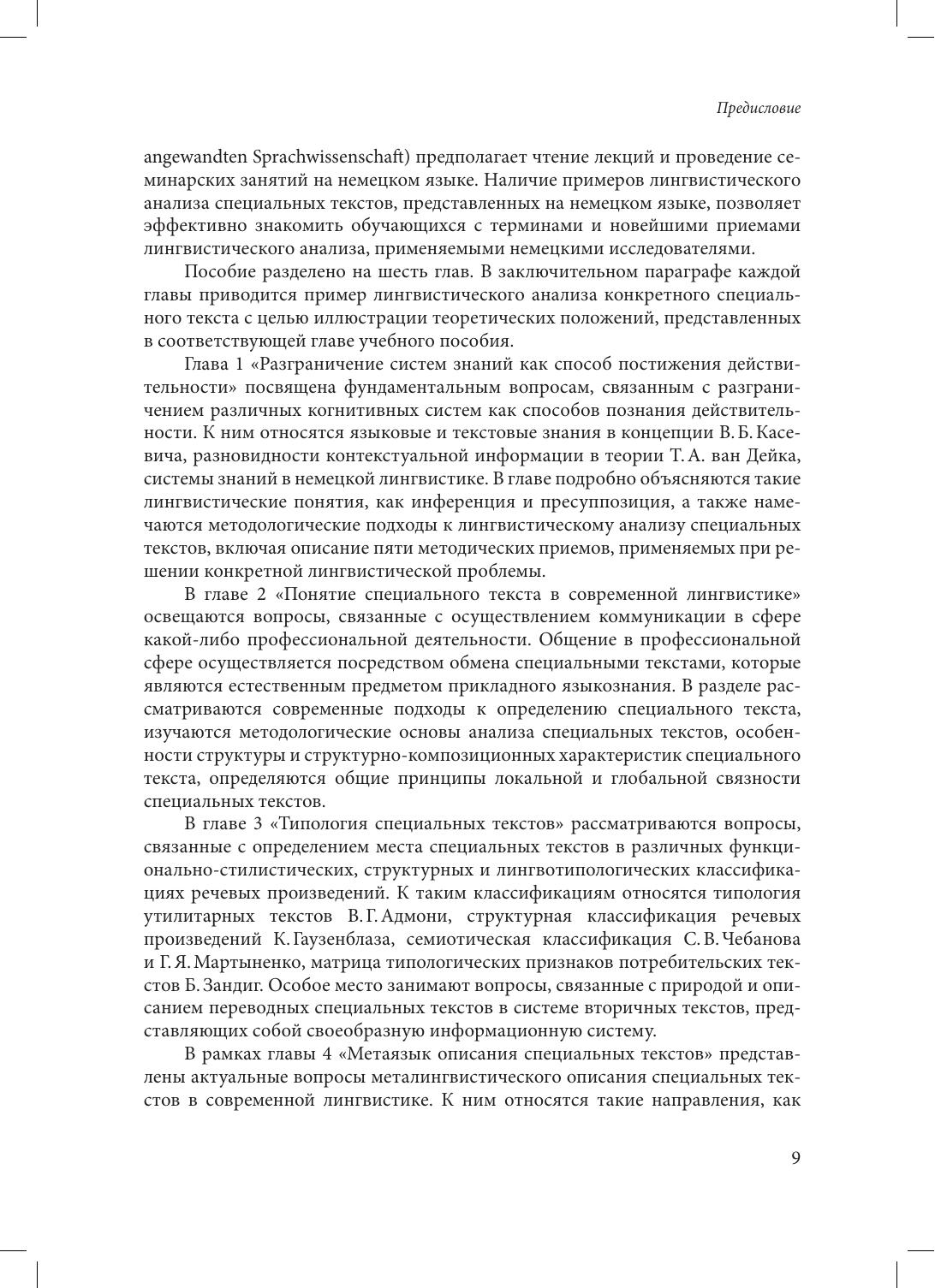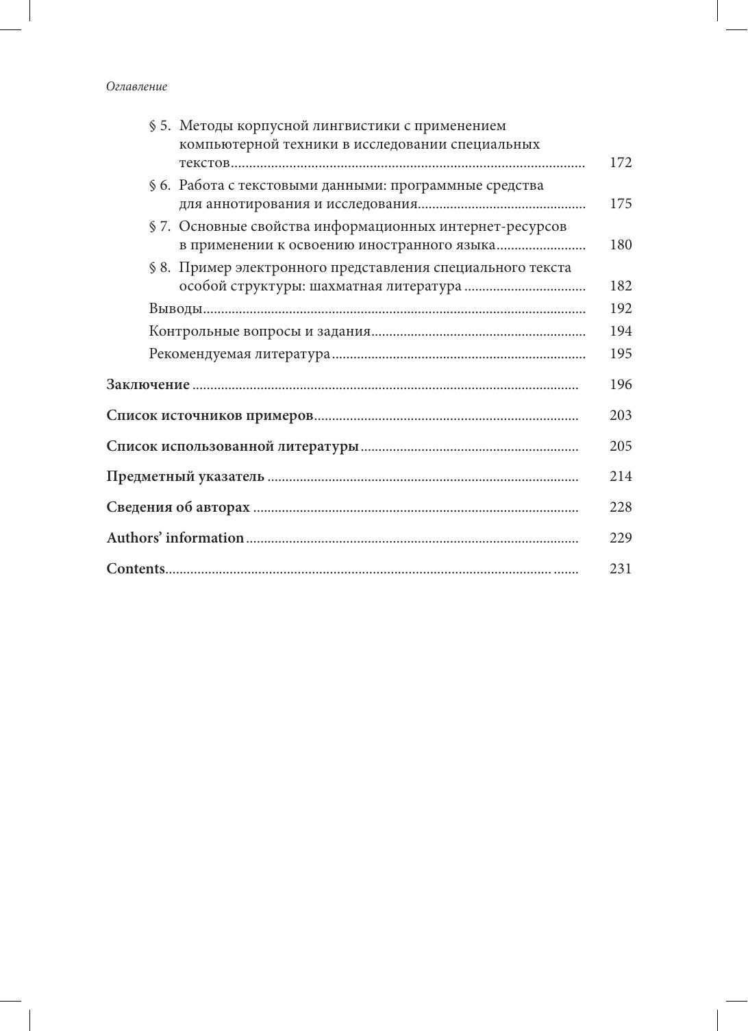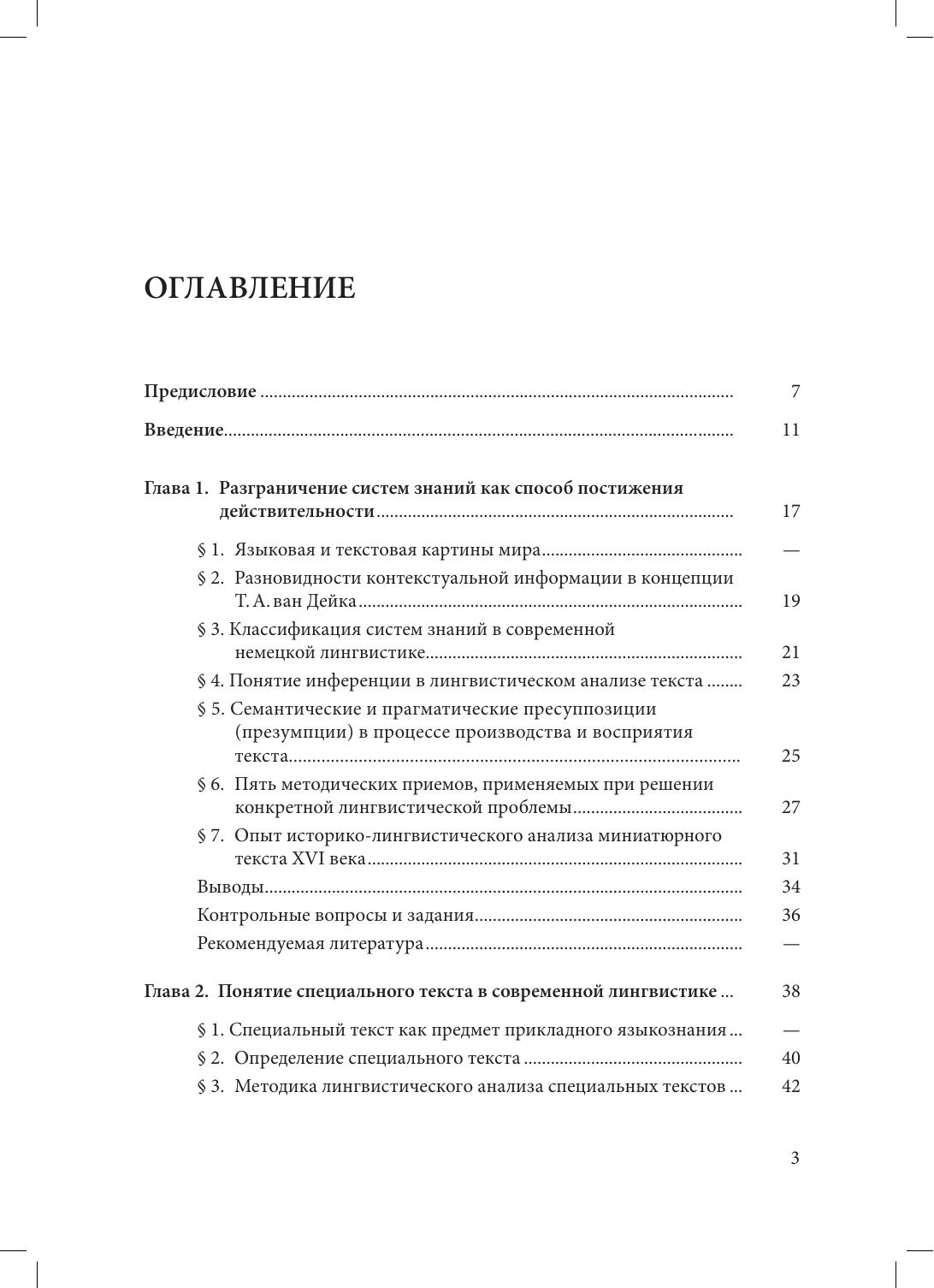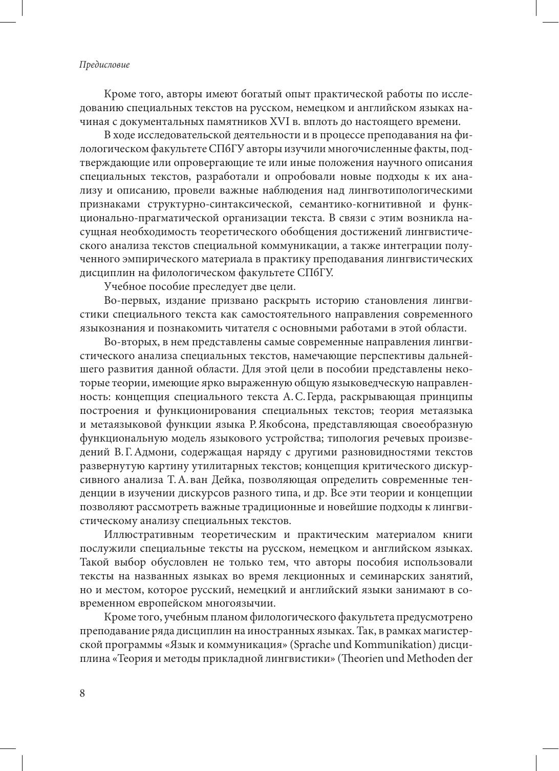 В учебном пособии представлен обзор основных программных работ отечественных и зарубежных авторов в области лингвистики специального текста, а также освещены современные направления лингвистического анализа, намечающие перспективы дальнейшего изучения таких тестов. Обобщается многолетний опыт авторов по преподаванию специальных лингвистических дисциплин на филологическом факультете СПбГУ, а также опыт практической работы по исследованию специальных текстов на русском, немецком и английском языках, начиная с документальных памятников XVI в. вплоть до поликодовых текстов новейшего времени. Пособие предназначено для обучающихся по программам бакалавриата, магистратуры и аспирантуры, а также специалистов широкого профиля, интересующихся актуальными вопросами лингвистического анализа текстов специальной коммуникации.