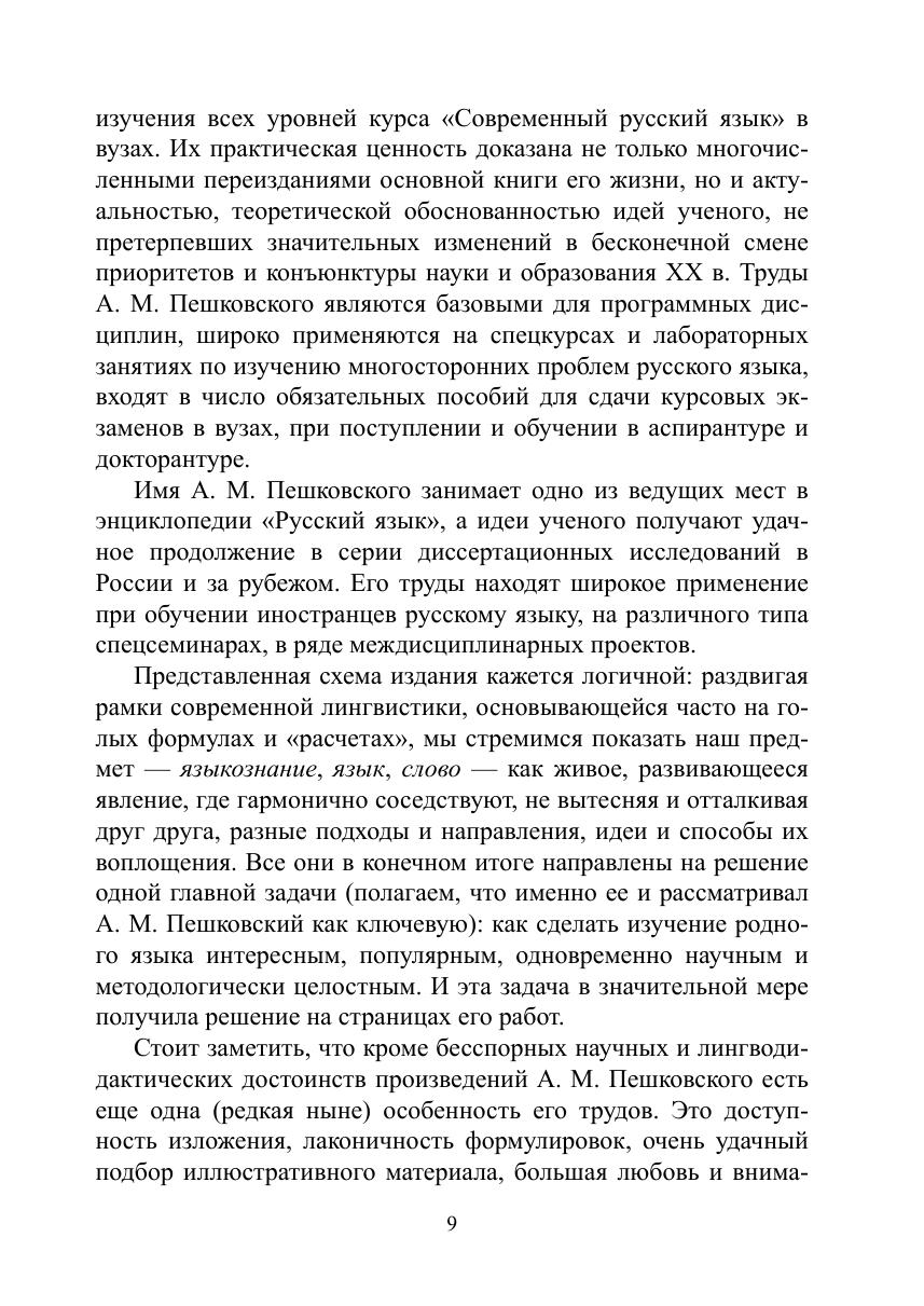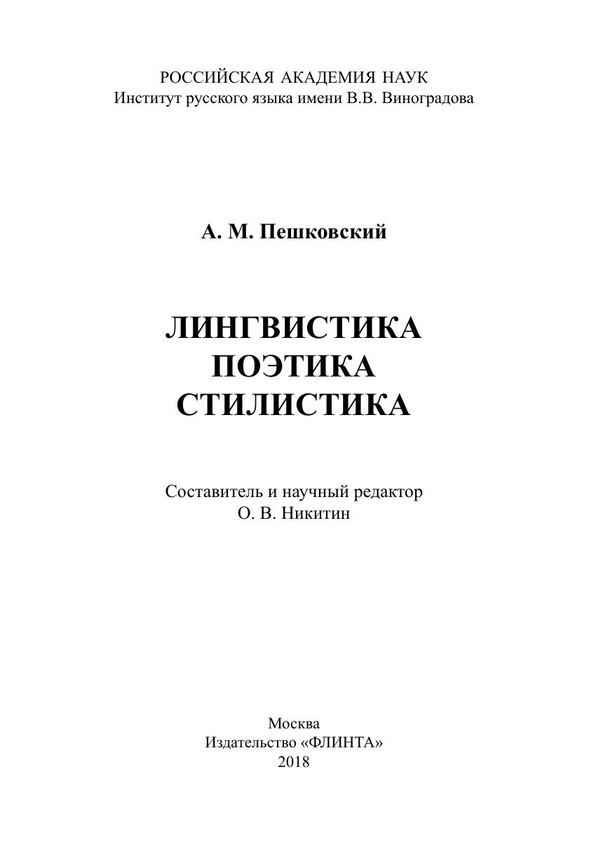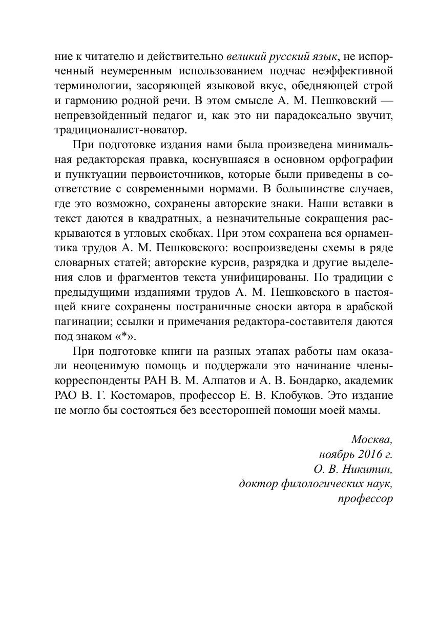 Впервые собранные вместе наиболее значительные труды по современному языкознанию и стилистике классика отечественной филологии проф. А. М. Пешковского (1878—1933) содержат базовые положения для основных курсов лингвистических дисциплин в школе и вузе, раскрывают опорные проблемы: современный русский язык, его уровни, языковая норма, коммуникативная система, стилистика, язык художественной литературы и др., дополняют и расширяют представления о родном языке, приобщают к словесной культуре.