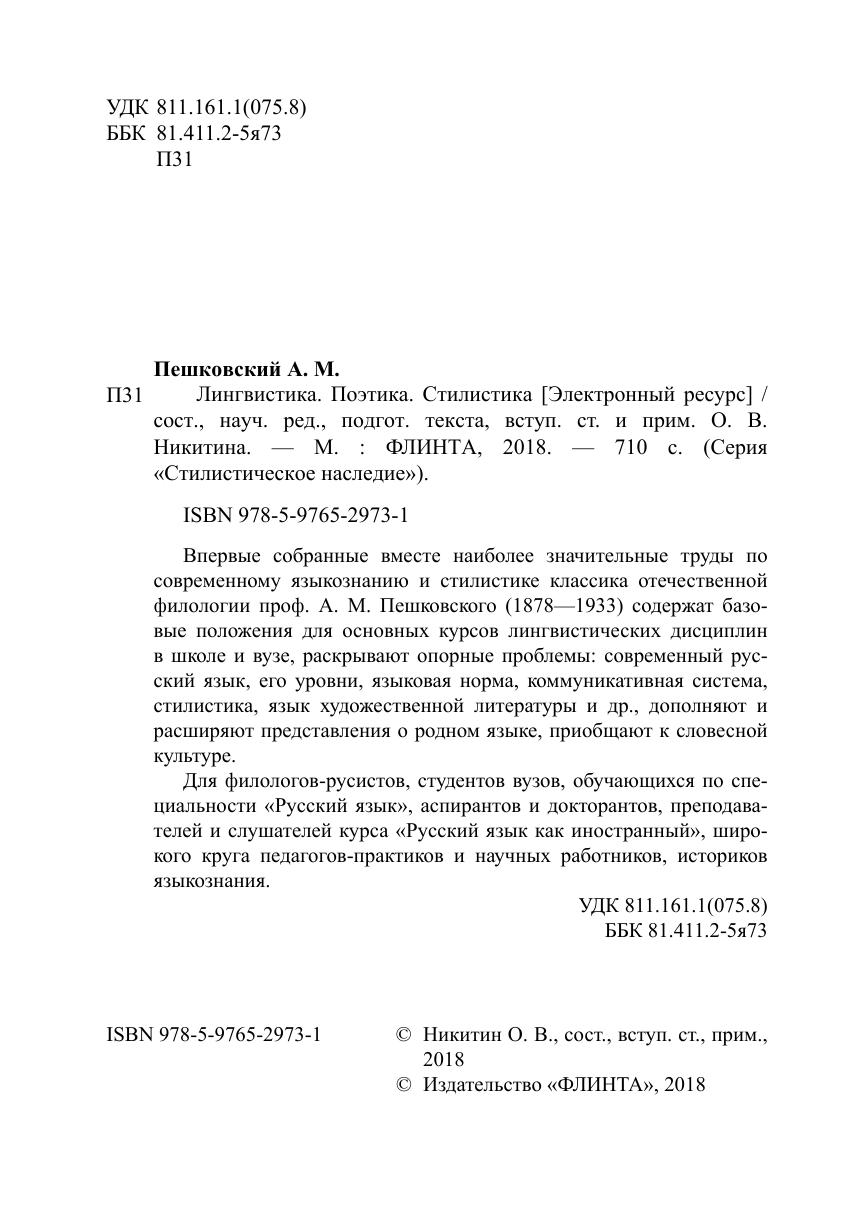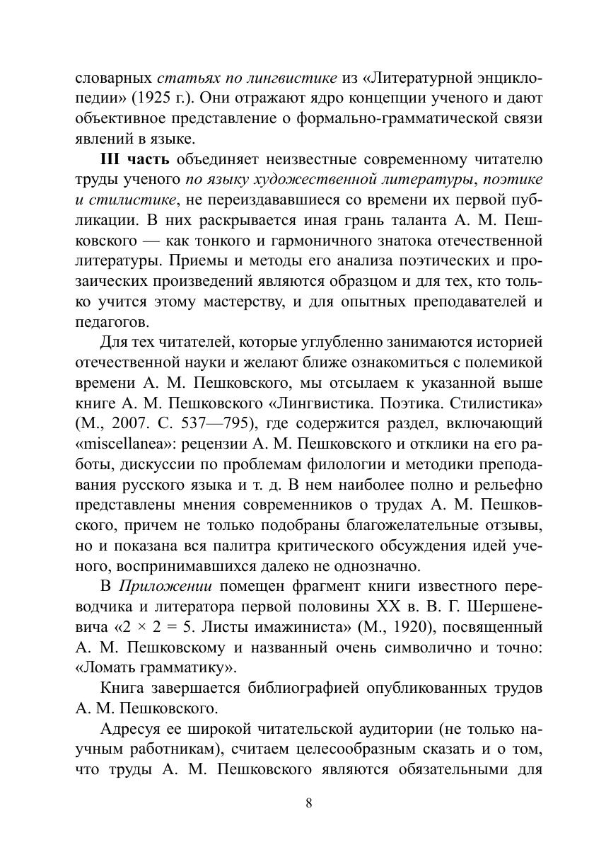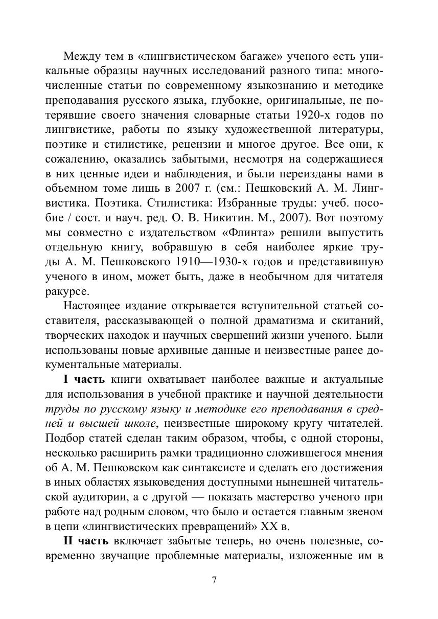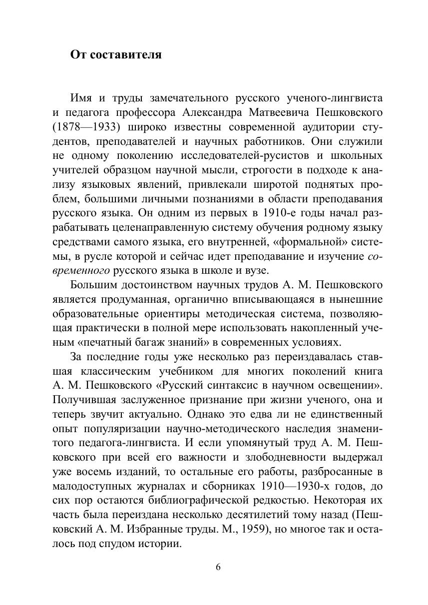 Впервые собранные вместе наиболее значительные труды по современному языкознанию и стилистике классика отечественной филологии проф. А. М. Пешковского (1878—1933) содержат базовые положения для основных курсов лингвистических дисциплин в школе и вузе, раскрывают опорные проблемы: современный русский язык, его уровни, языковая норма, коммуникативная система, стилистика, язык художественной литературы и др., дополняют и расширяют представления о родном языке, приобщают к словесной культуре.
