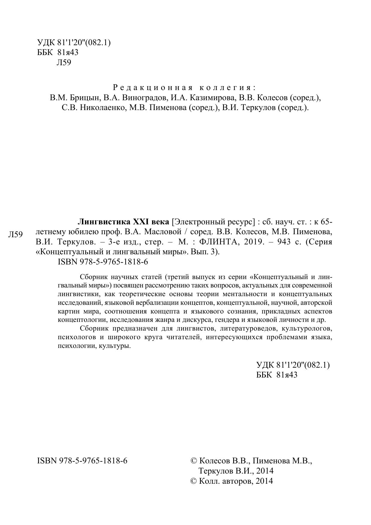 Сборник научных статей (третий выпуск из серии «Концептуальный и лингвальный миры») посвящен рассмотрению таких вопросов, актуальных для современной лингвистики, как теоретические основы теории ментальности и концептуальных исследований, языковой вербализации концептов, концептуальной, научной, авторской картин мира, соотношения концепта и языкового сознания, прикладных аспектов концептологии, исследования жанра и дискурса, гендера и языковой личности и др.