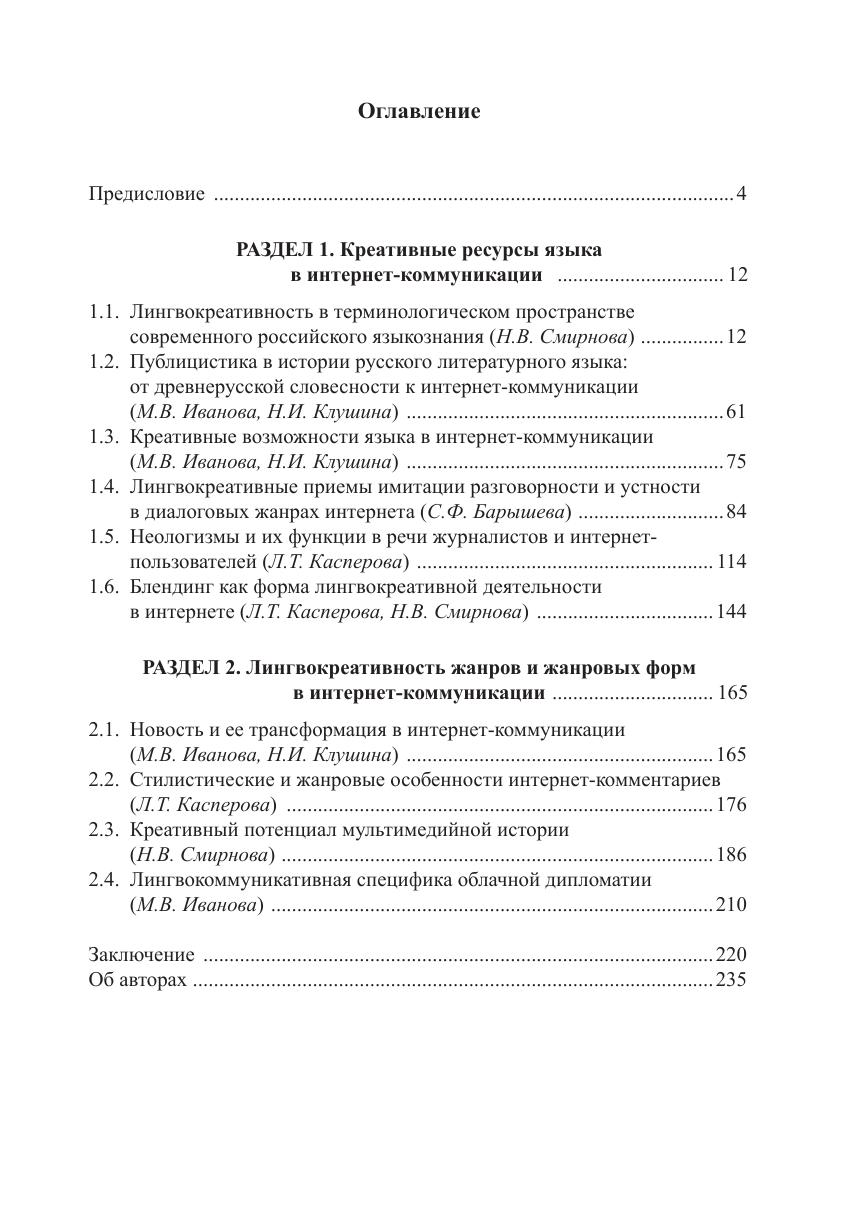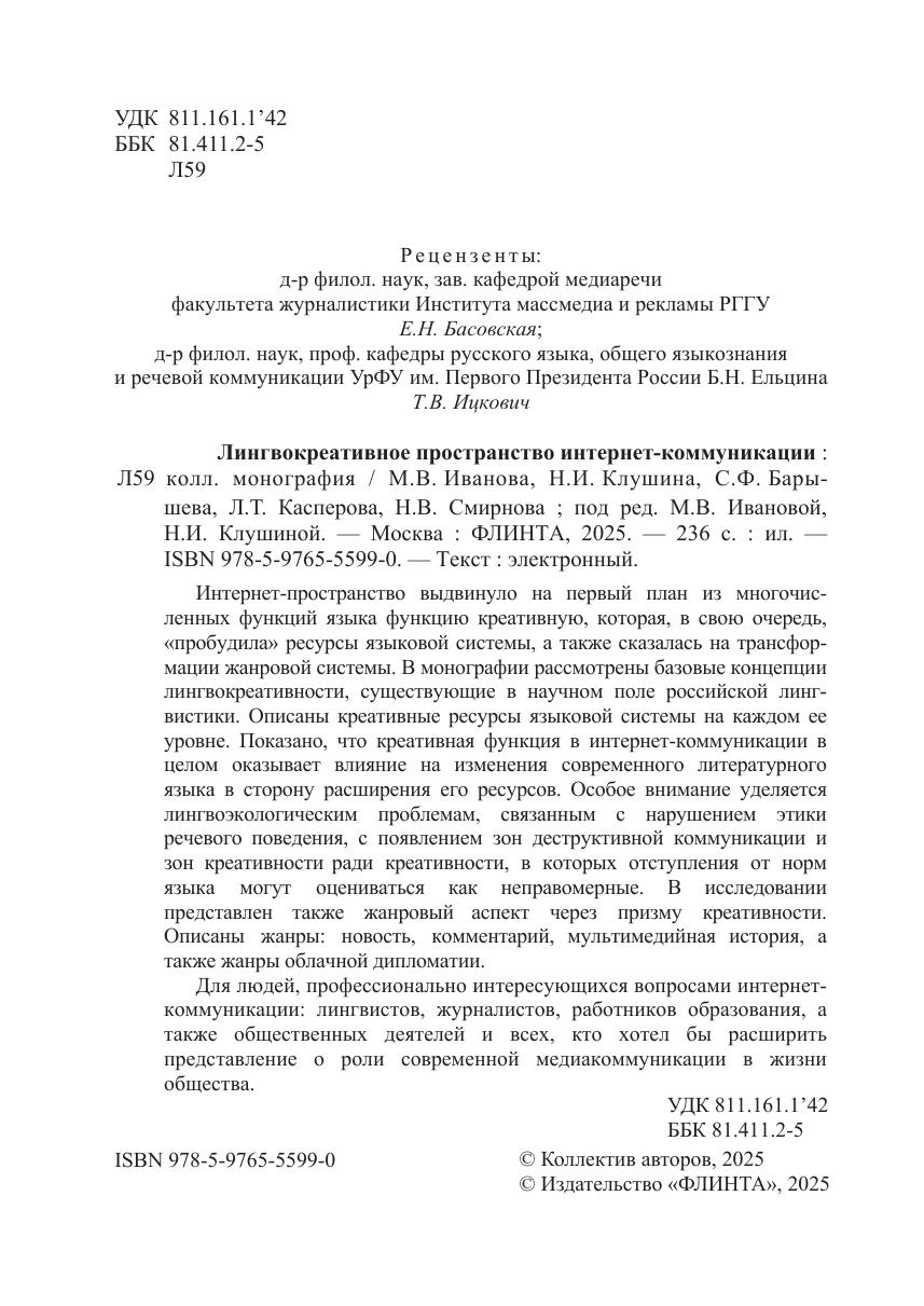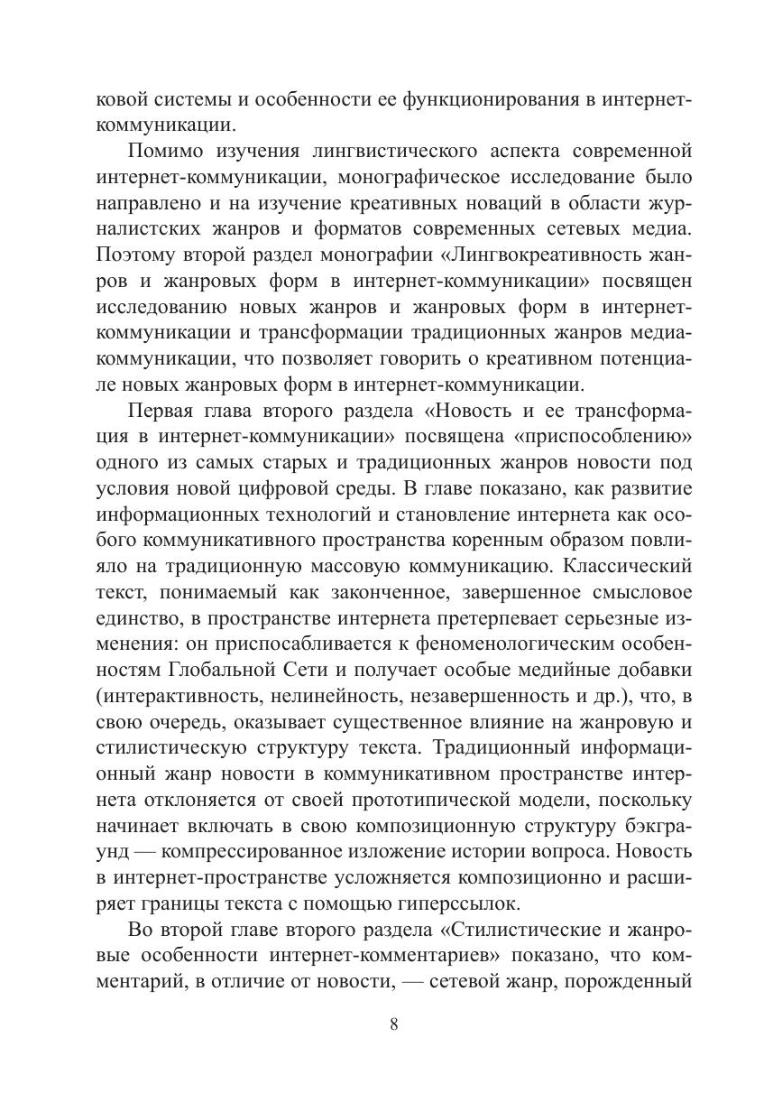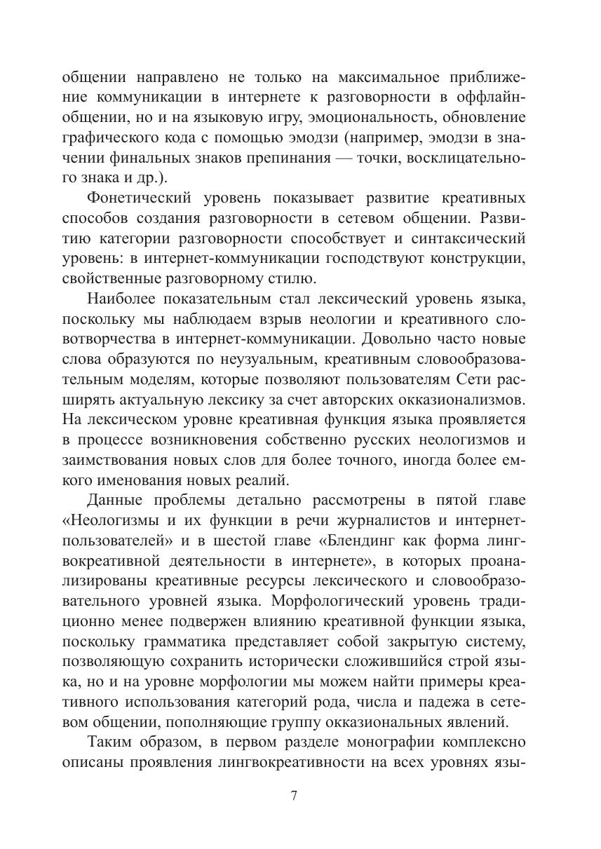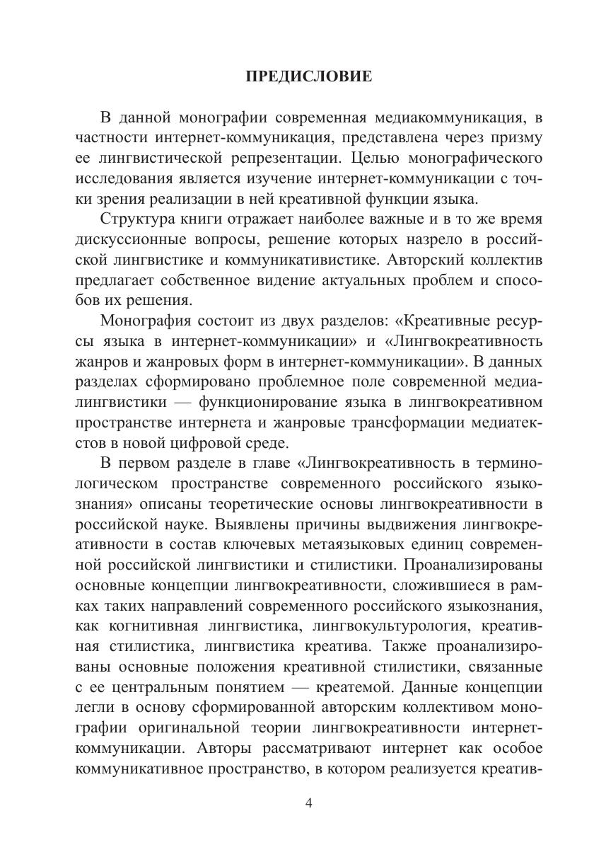 Интернет-пространство выдвинуло на первый план из многочисленных функций языка функцию креативную, которая, в свою очередь, «пробудила» ресурсы языковой системы, а также сказалась на трансформации жанровой системы. В монографии рассмотрены базовые концепции лингвокреативности, существующие в научном поле российской лингвистики. Описаны креативные ресурсы языковой системы на каждом ее уровне. Показано, что креативная функция в интернет-коммуникации в целом оказывает влияние на изменения современного литературного языка в сторону расширения его ресурсов. Особое внимание уделяется лингвоэкологическим проблемам, связанным с нарушением этики речевого поведения, с появлением зон деструктивной коммуникации и зон креативности ради креативности, в которых отступления от норм языка могут оцениваться как неправомерные. В исследовании представлен также жанровый аспект через призму креативности.