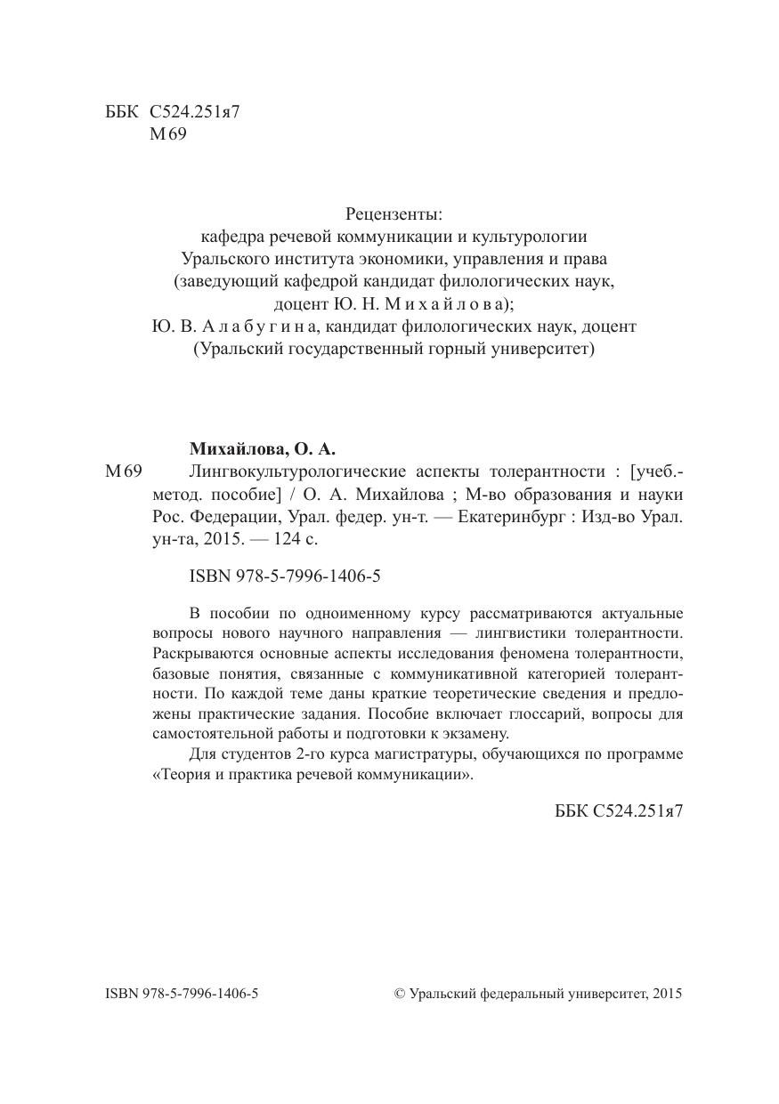 В пособии по одноименному курсу рассматриваются актуальные вопросы нового научного направления — лингвистики толерантности. Раскрываются основные аспекты исследования феномена толерантности, базовые понятия, связанные с коммуникативной категорией толерантности. По каждой теме даны краткие теоретические сведения и предложены практические задания. Пособие включает глоссарий, вопросы для самостоятельной работы и подготовки к экзамену. Для студентов 2-го курса магистратуры, обучающихся по программе «Теория и практика речевой коммуникации».
