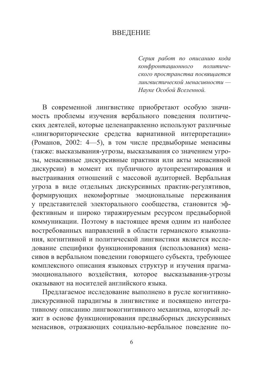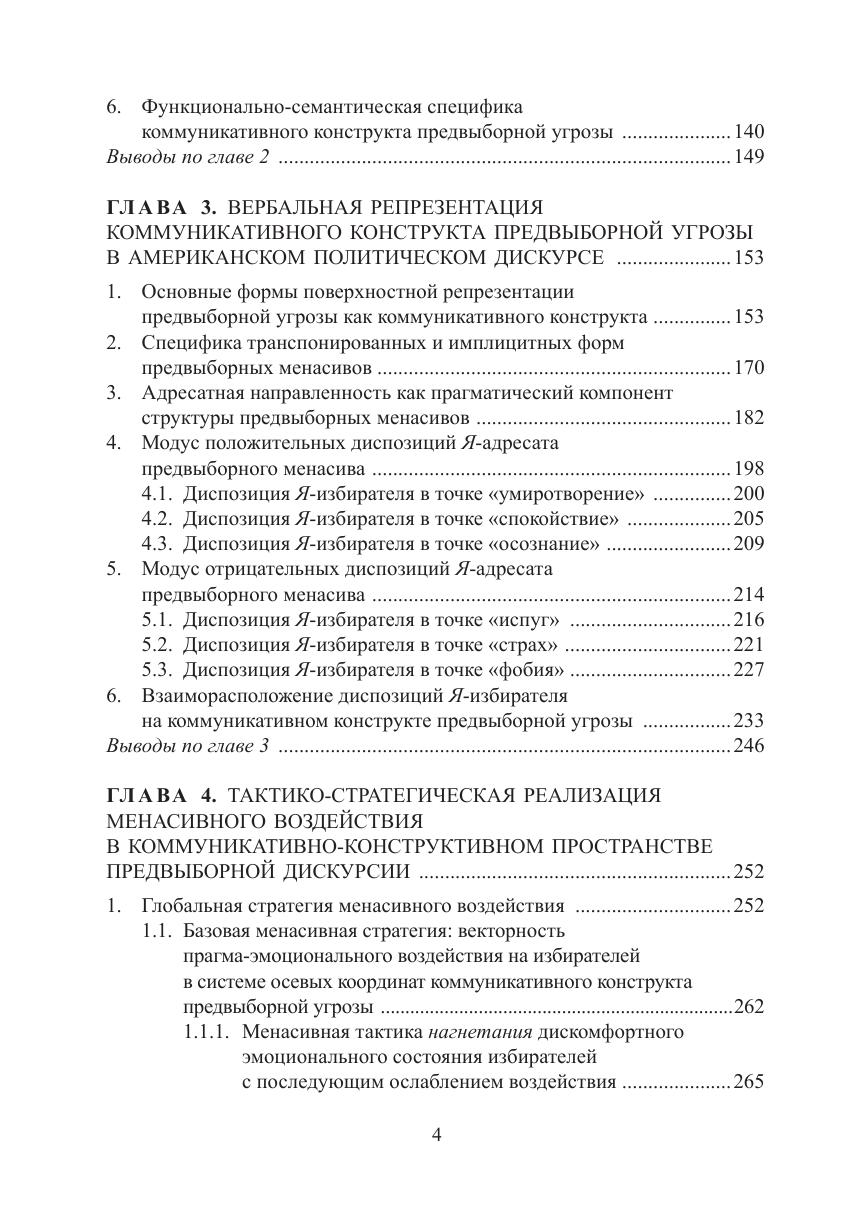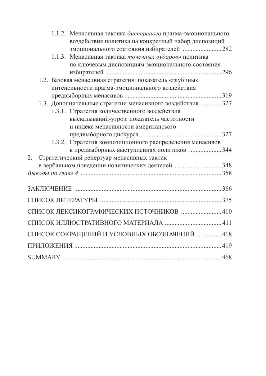 Настоящее исследование выполнено в русле когнитивно-дискурсивной парадигмы в лингвистике и посвящено изучению вербального поведения политических деятелей, которые целенаправленно используют предвыборные менасивы для выстраивания отношений с представителями электорального сообщества. Осушествлено интегративное описание лингвокогнитивного механизма, который лежит в основе функционирования предвыборных дискурсивных менасивов в условиях американского политического дискурса. Особое место уделено разработке междисциплинарного понятия «коммуникативный конструкт предвыборной угрозы», а также анализу тактико-стратегической реализации менасивного воздействия в коммуникативно-конструктивном пространстве предвыборной дискурсии.