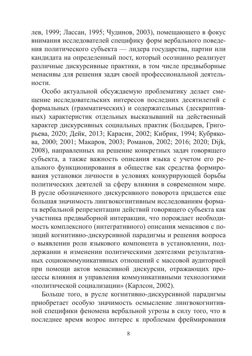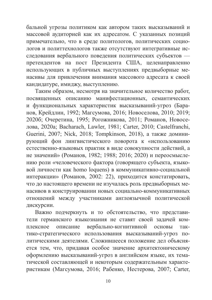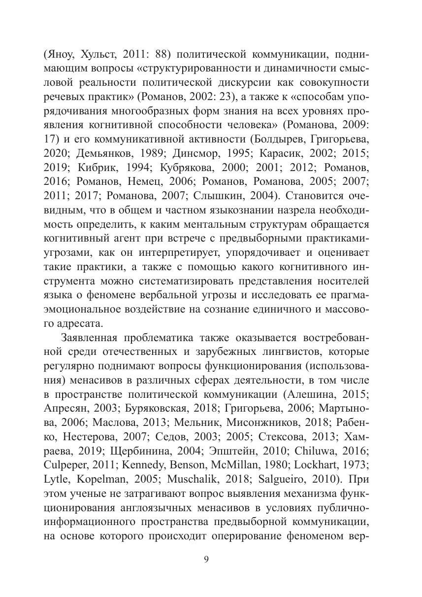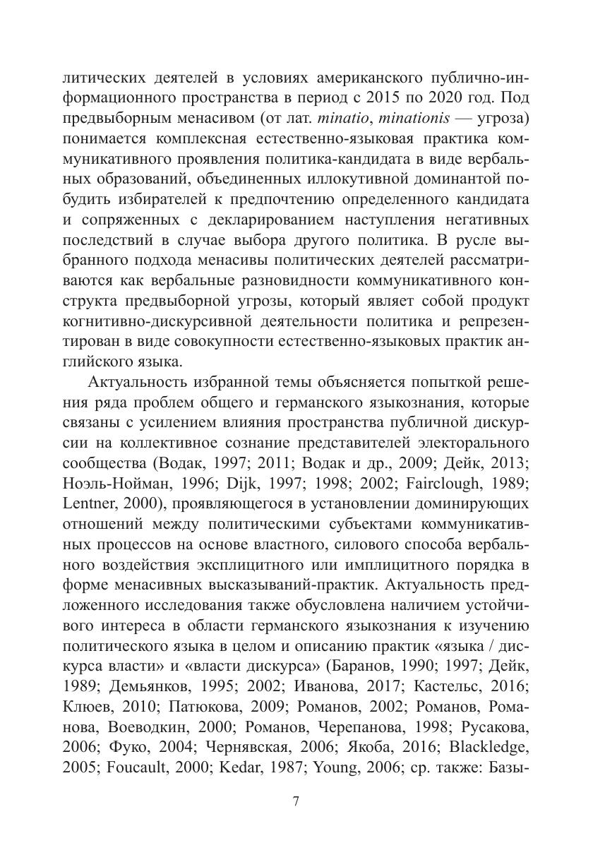 Настоящее исследование выполнено в русле когнитивно-дискурсивной парадигмы в лингвистике и посвящено изучению вербального поведения политических деятелей, которые целенаправленно используют предвыборные менасивы для выстраивания отношений с представителями электорального сообщества. Осушествлено интегративное описание лингвокогнитивного механизма, который лежит в основе функционирования предвыборных дискурсивных менасивов в условиях американского политического дискурса. Особое место уделено разработке междисциплинарного понятия «коммуникативный конструкт предвыборной угрозы», а также анализу тактико-стратегической реализации менасивного воздействия в коммуникативно-конструктивном пространстве предвыборной дискурсии.