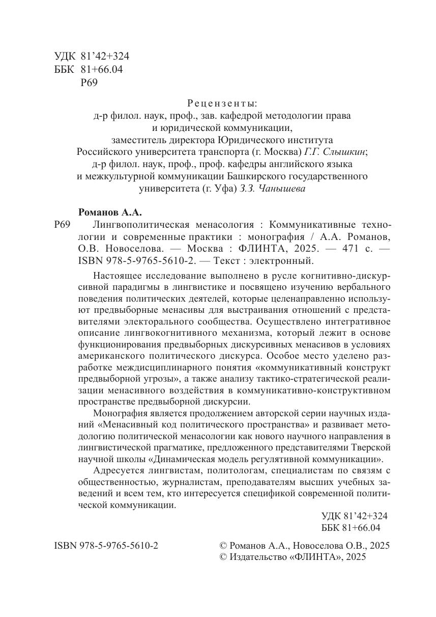 Монография является продолжением авторской серии научных изданий «Менасивный код политического пространства» и развивает методологию политической менасологии как нового научного направления в лингвистической прагматике, предложенного представителями Тверской научной школы «Динамическая модель регулятивной коммуникации».