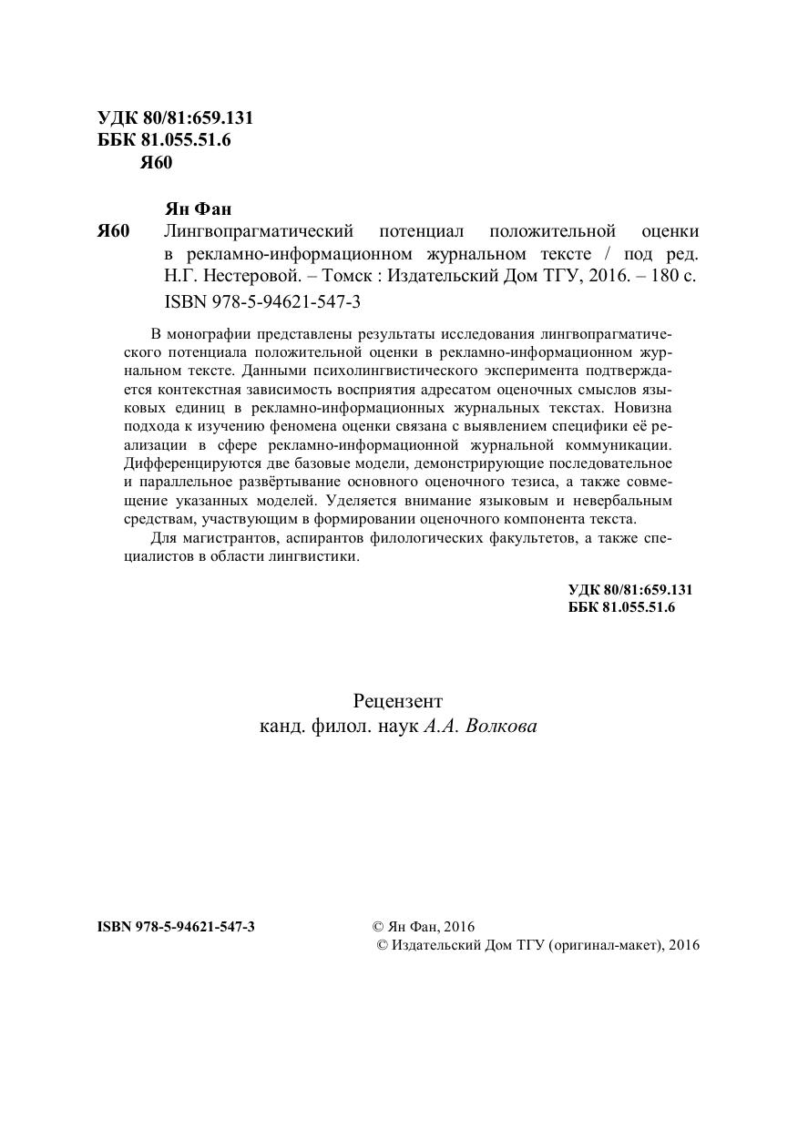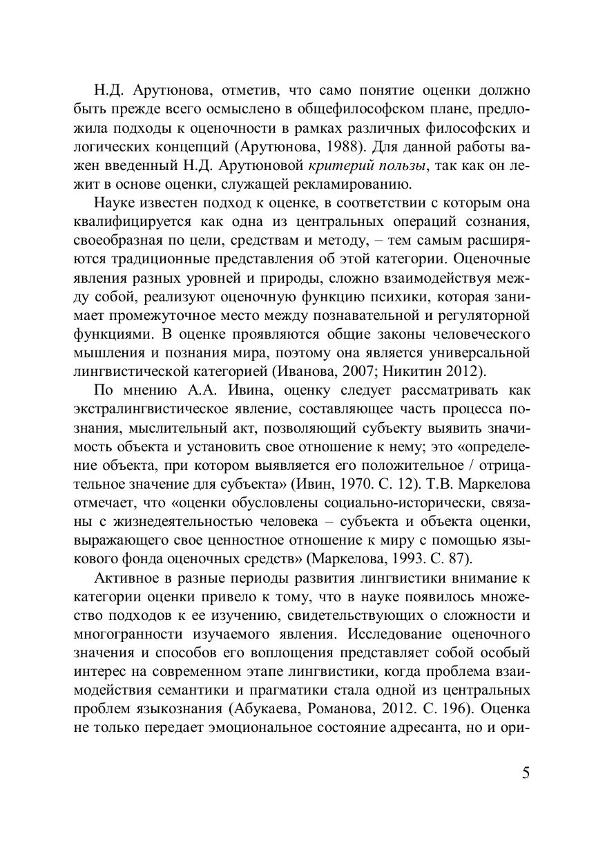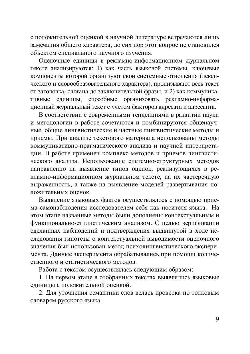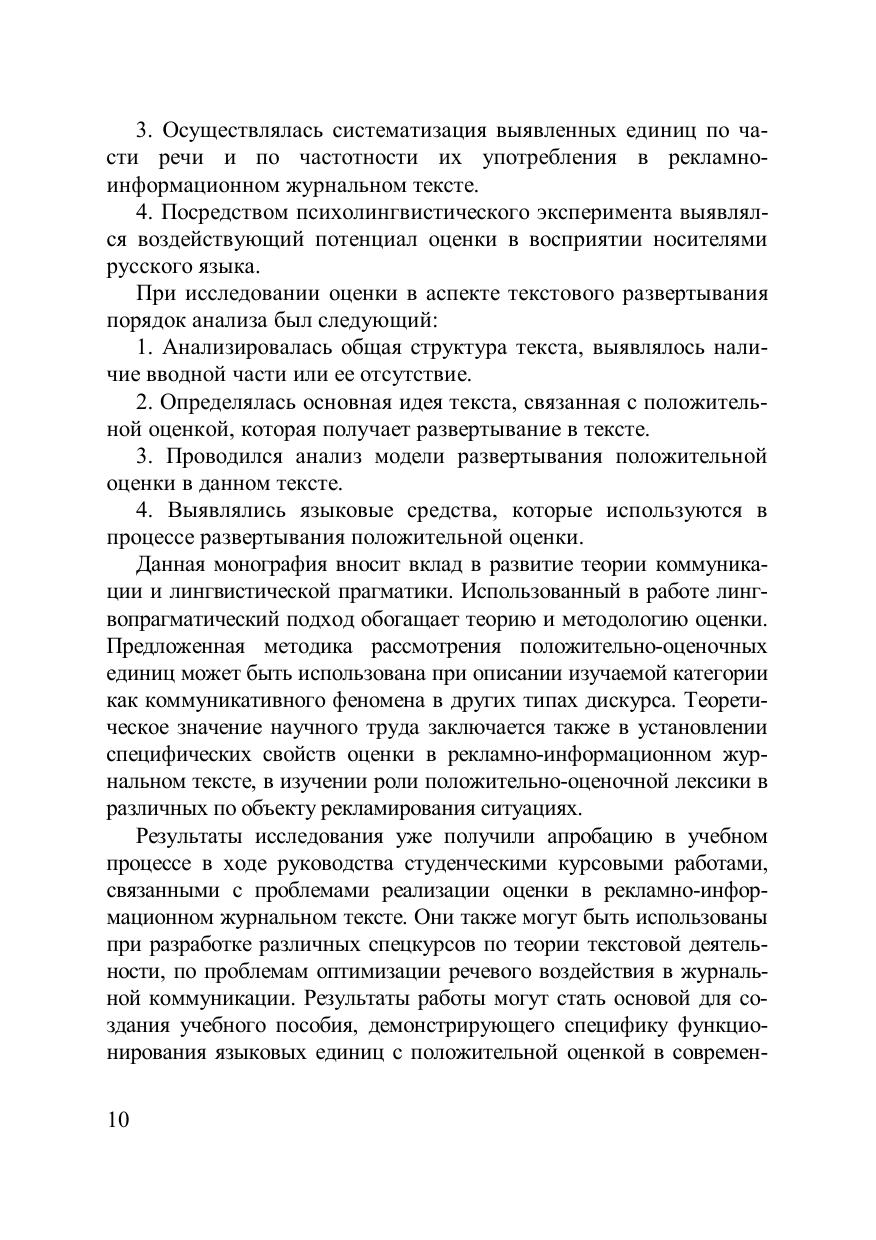 В монографии представлены результаты исследования лингвопрагматического потенциала положительной оценки в рекламно-информационном журнальном тексте. Данными психолингвистического эксперимента подтверждается контекстная зависимость восприятия адресатом оценочных смыслов языковых единиц в рекламно-информационных журнальных текстах. Новизна подхода к изучению феномена оценки связана с выявлением специфики её реализации в сфере рекламно-информационной журнальной коммуникации. Дифференцируются две базовые модели, демонстрирующие последовательное и параллельное развёртывание основного оценочного тезиса, а также совмещение указанных моделей. Уделяется внимание языковым и невербальным средствам, участвующим в формировании оценочного компонента текста. Для магистрантов, аспирантов филологических факультетов, а также специалистов в области лингвистики.