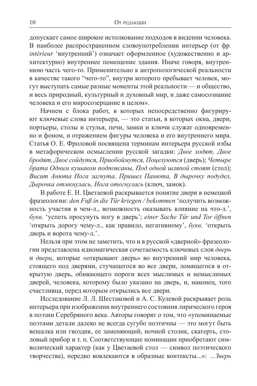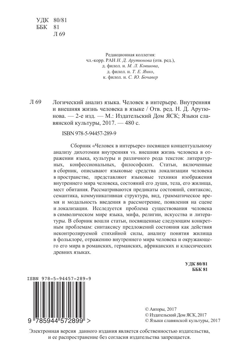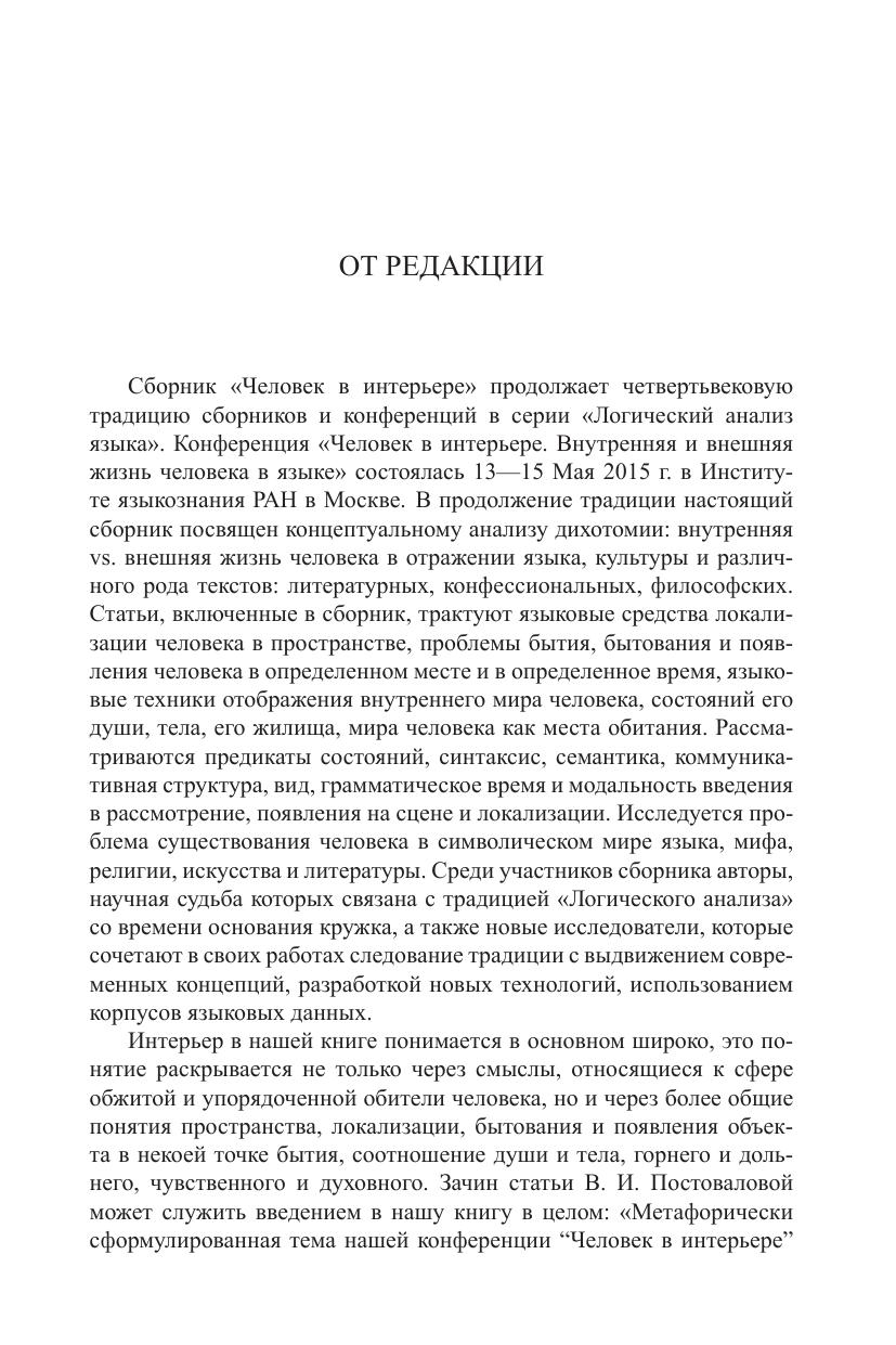 Сборник «Человек в интерьере» посвящен концептуальному анализу дихотомии внутренняя VS. внешняя жизнь человека в отражении языка, культуры и различного рода текстов: литературных, конфессиональных философских Статьи, включенные в сборник, описывают языковые средства локализации человека в пространстве, представляют языковые техники изображения внутреннего мира человека, состояний его души, тела, его жилища, мест обитания. Рассматриваются предикаты состояний, синтаксис, семантика, коммуникативная структура, вид, грамматическое время и модальность введения в рассмотрение, появления на сцене и локализации Исследуется проблема существования человека в символическом мире языка мифа религии, искусства и литературы. В сборник вошли статьи посвященные следующим конкретным проблемам синтаксису предложений состояния как действия неконтролируемой стихийной силы анализу понятия жилища в фольклоре, отражению внутреннего мира человека и окружающего его мира в романских германских, африканских и классических древних языках.