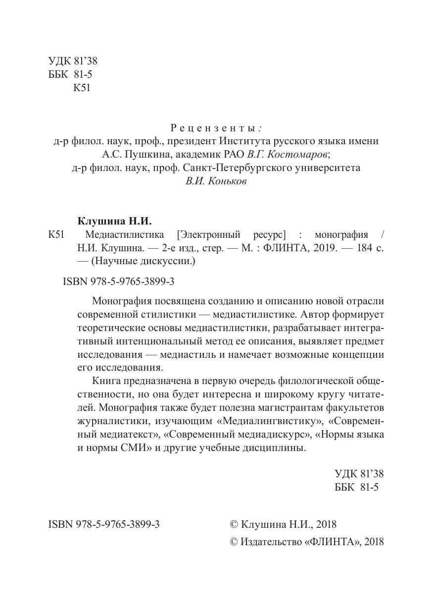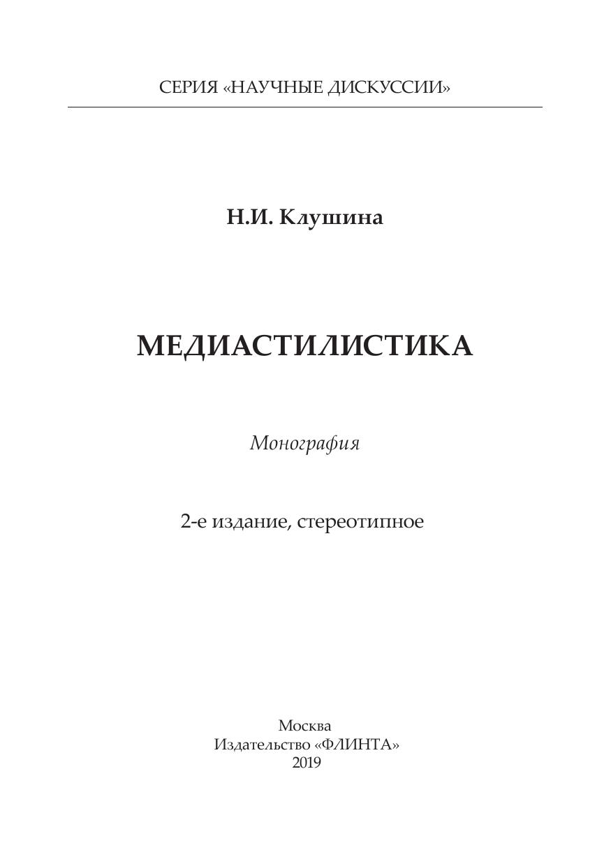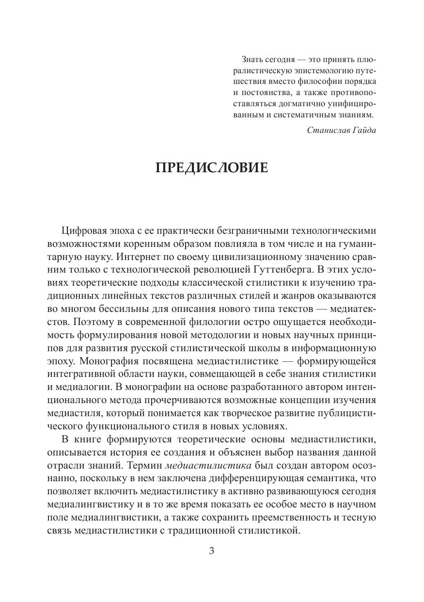 Монография посвящена созданию и описанию новой отрасли современной стилистики — медиастилистике. Автор формирует теоретические основы медиастилистики, разрабатывает интегративный интенциональный метод ее описания, выявляет предмет исследования — медиастиль и намечает возможные концепции