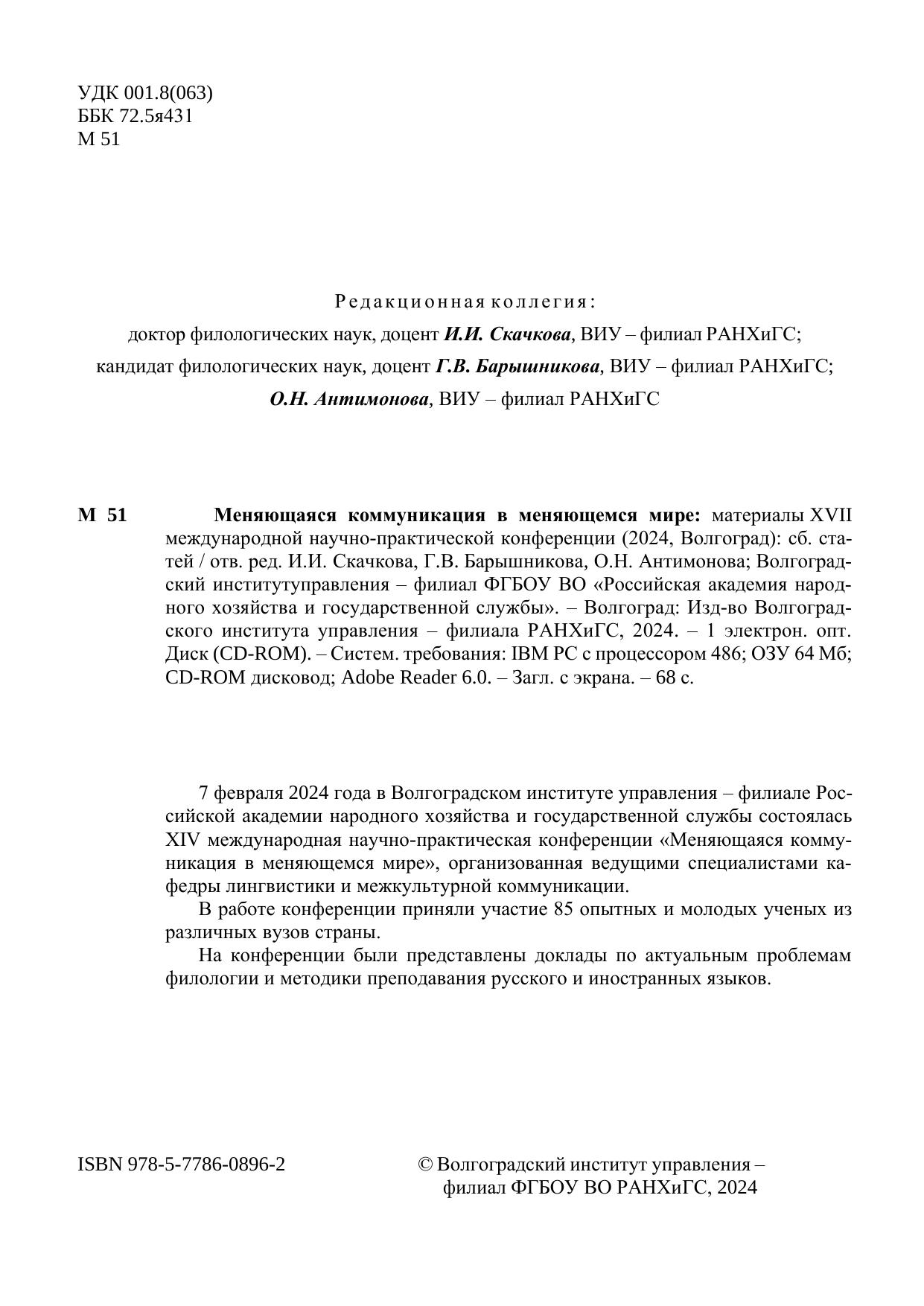 Меняющаяся коммуникация в меняющемся мире: материалы XVII международной научно-практической конференции (2024, Волгоград): сборник статей