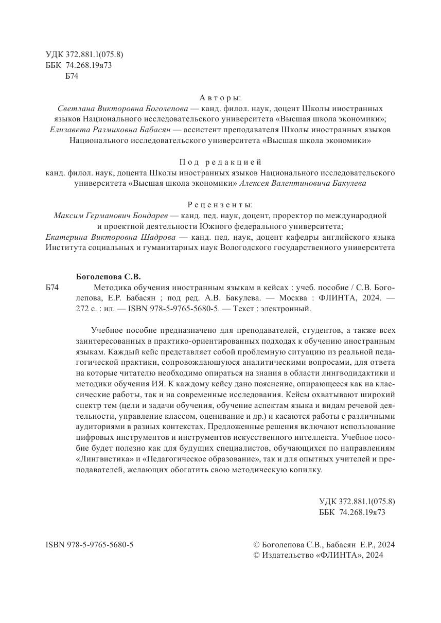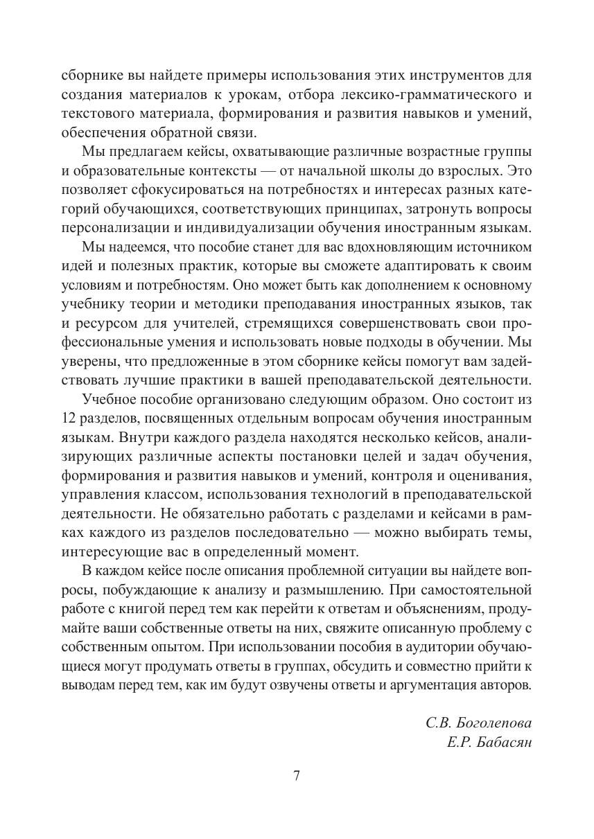 Учебное пособие предназначено для преподавателей, студентов, а также всех заинтересованных в практико-ориентированных подходах к обучению иностранным языкам. Каждый кейс представляет собой проблемную ситуацию из реальной педагогической практики, сопровождающуюся аналитическими вопросами, для ответа на которые читателю необходимо опираться на знания в области лингводидактики и методики обучения ИЯ. К каждому кейсу дано пояснение, опирающееся как на клас-сические работы, так и на современные исследования. Кейсы охватывают широкий спектр тем (цели и задачи обучения, обучение аспектам языка и видам речевой деятельности, управление классом, оценивание и др.) и касаются работы с различными аудиториями в разных контекстах. Предложенные решения включают использование цифровых инструментов и инструментов искусственного интеллекта. Учебное пособие будет полезно как для будущих специалистов, обучающихся по направлениям «Лингвистика» и «Педагогическое образование», так и для опытных учителей и преподавателей, желающих обогатить свою методическую копилку.