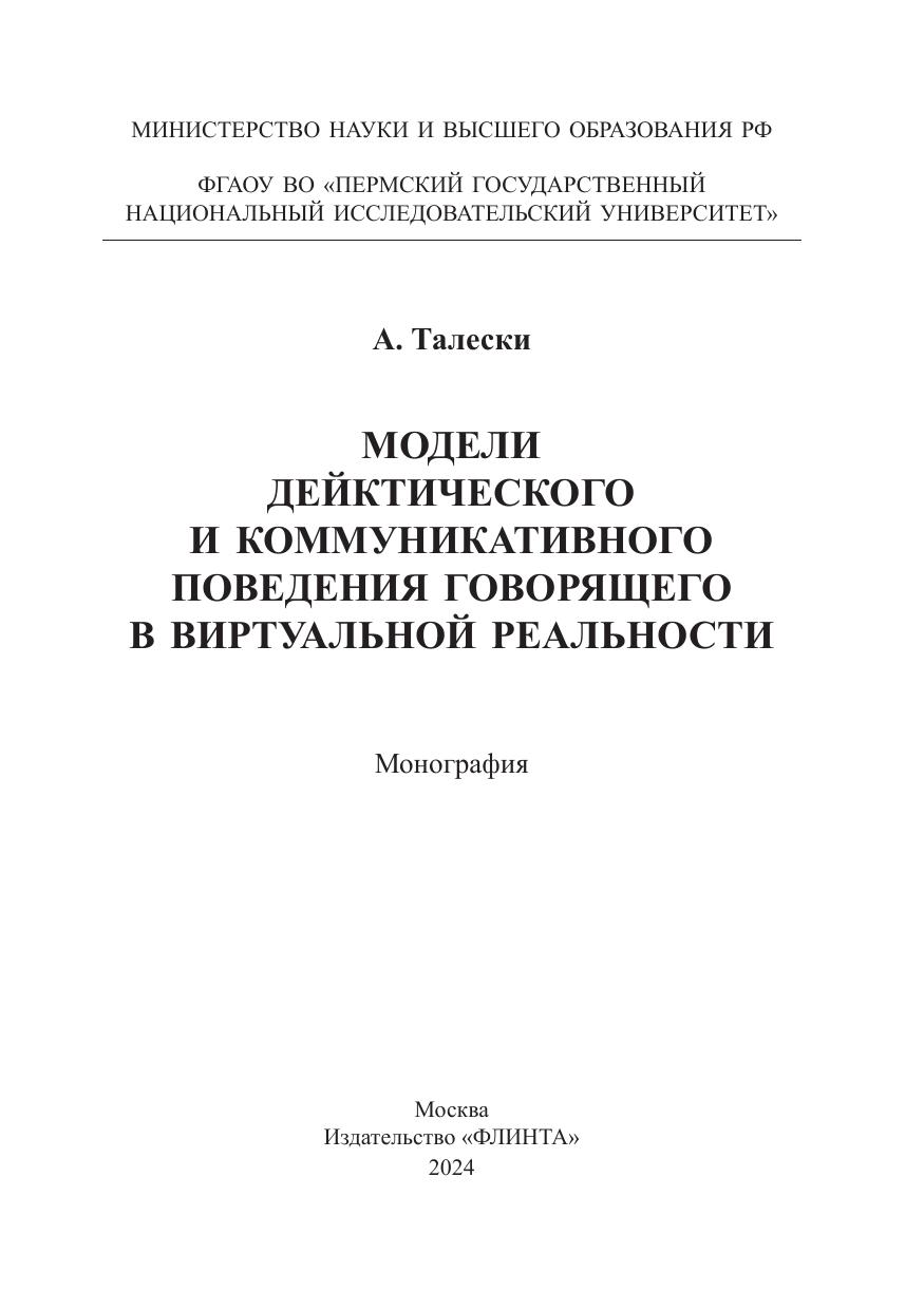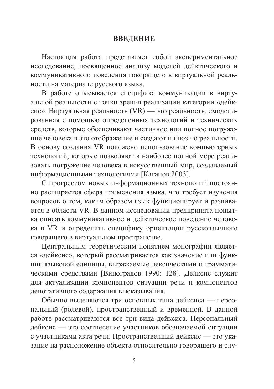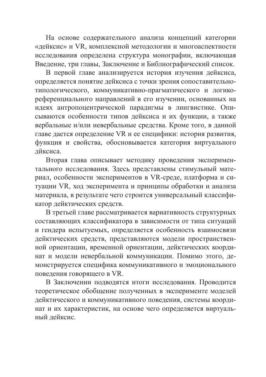 В работе моделируется дейктическое и коммуникативное поведение говорящего в виртуальной реальности (VR) на материале русского языка. Представлены основные тенденции коммуникативного поведения говорящего в VR, разработан универсальный дейктический классификатор, введено понятие виртуального дейксиса. Работа носит вклад в развитие экспериментальной и когнитивной лингвистики в целом и теории коммуникации и дейксиса в частности, а также раскрывает сущность VR дискурса.