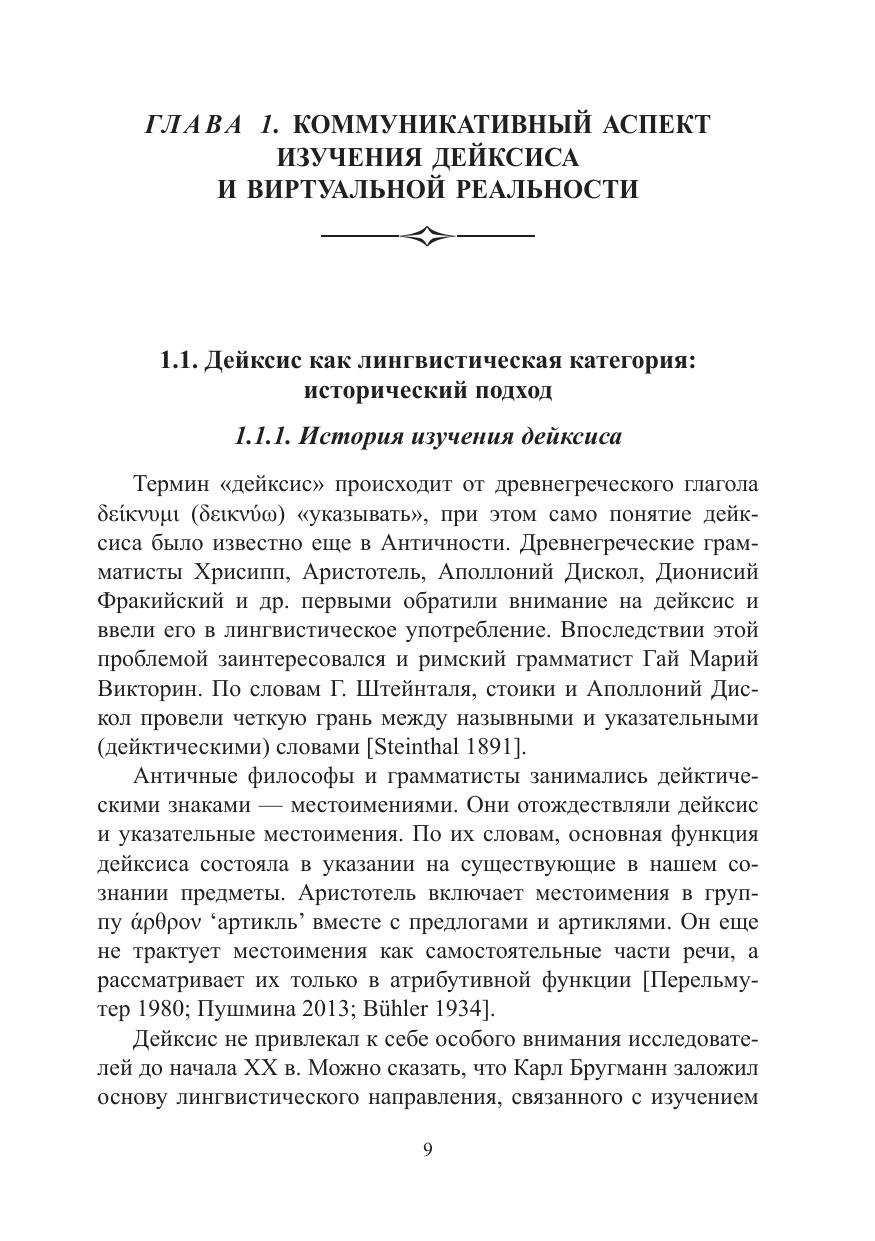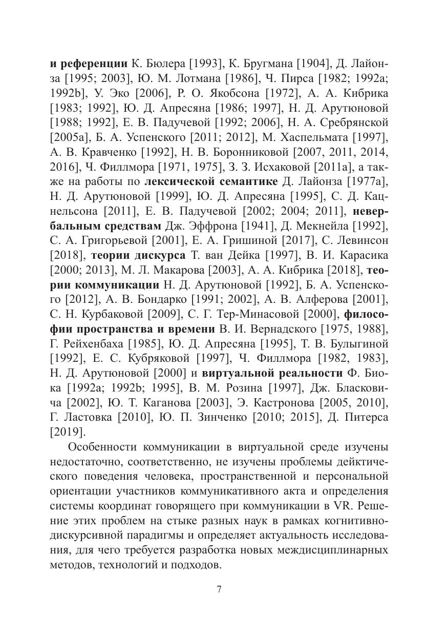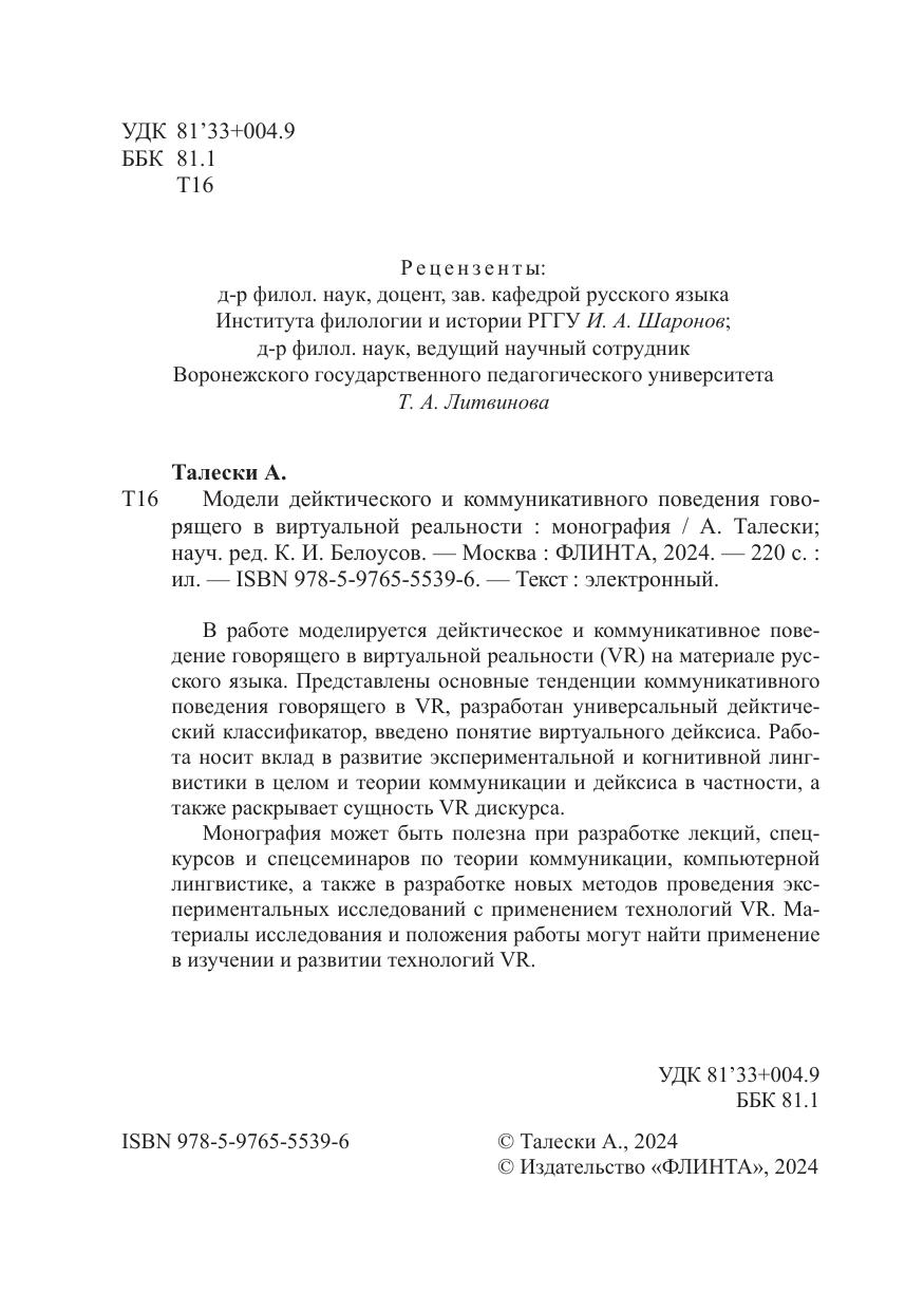 В работе моделируется дейктическое и коммуникативное поведение говорящего в виртуальной реальности (VR) на материале русского языка. Представлены основные тенденции коммуникативного поведения говорящего в VR, разработан универсальный дейктический классификатор, введено понятие виртуального дейксиса. Работа носит вклад в развитие экспериментальной и когнитивной лингвистики в целом и теории коммуникации и дейксиса в частности, а также раскрывает сущность VR дискурса.