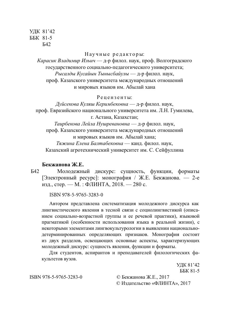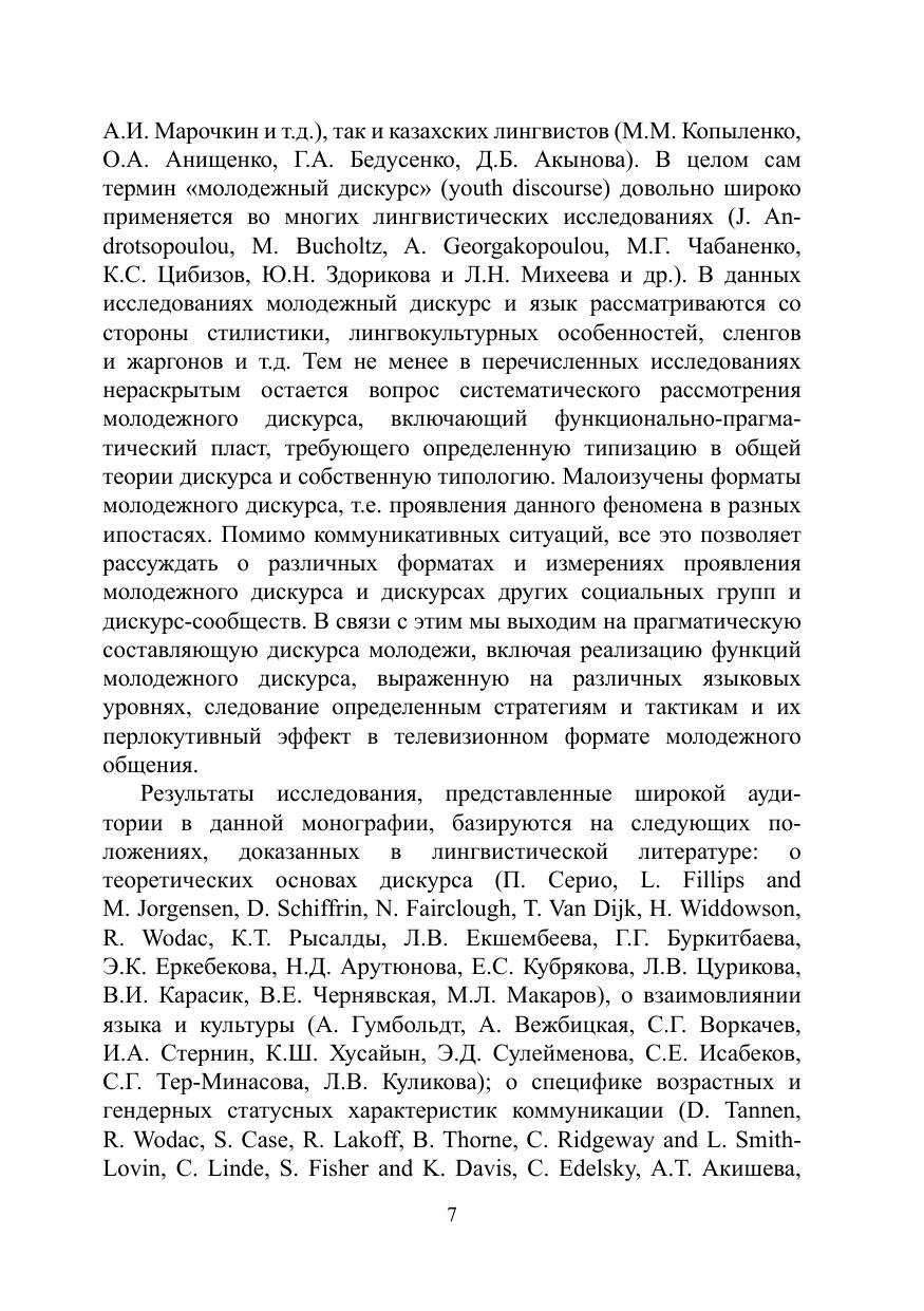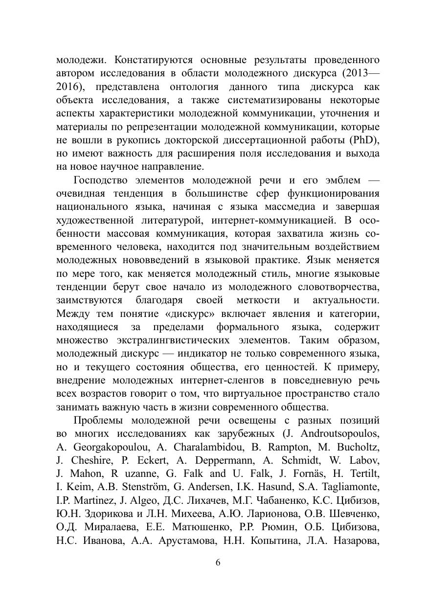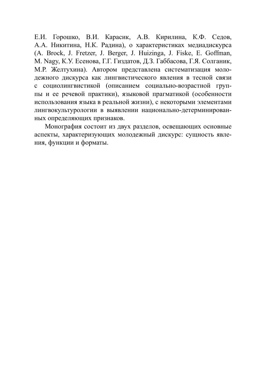 Автором представлена систематизация молодежного дискурса как лингвистического явления в тесной связи с социолингвистикой (описанием социально-возрастной группы и ее речевой практики), языковой прагматикой (особенности использования языка в реальной жизни), с некоторыми элементами лингвокультурологии в выявлении национальнодетерминированных определяющих признаков. Монография состоит из двух разделов, освещающих основные аспекты, характеризующих молодежный дискурс: сущность явления, функции и форматы.