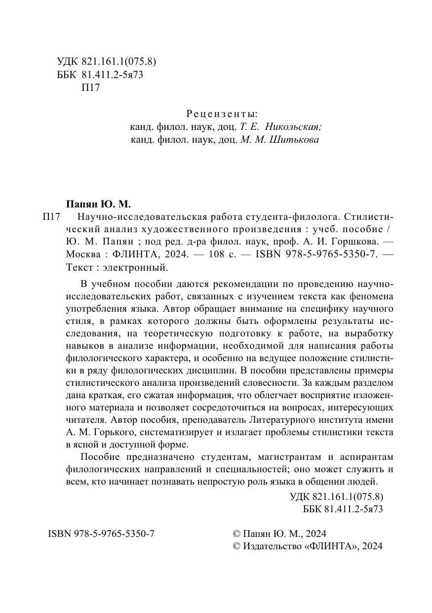 В учебном пособии даются рекомендации по проведению научно-исследовательских работ, связанных с изучением текста как феномена употребления языка. Автор обращает внимание на специфику научного стиля, в рамках которого должны быть оформлены результаты исследования, на теоретическую подготовку к работе, на выработку навыков в анализе информации, необходимой для написания работы филологического характера, и особенно на ведущее положение стилистики в ряду филологических дисциплин. В пособии представлены примеры стилистического анализа произведения словесности. За каждым разделом дана краткая, его сжатая информация, что облегчает восприятие изложенного материала и позволяет сосредоточиться на вопросах, интересующих читателя. Автор пособия, преподаватель Литературного института имени А. М. Горького, систематизирует и излагает проблемы стилистики текста в ясной и доступной форме.