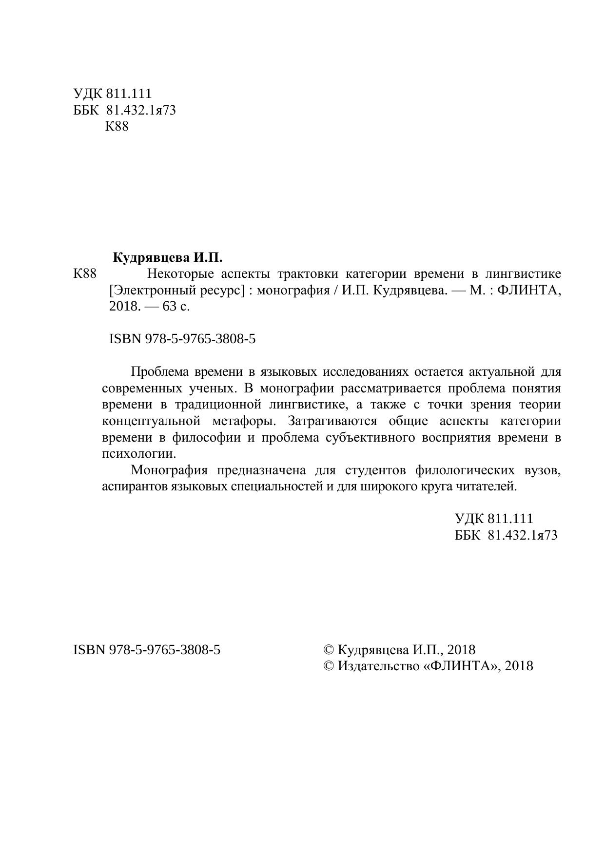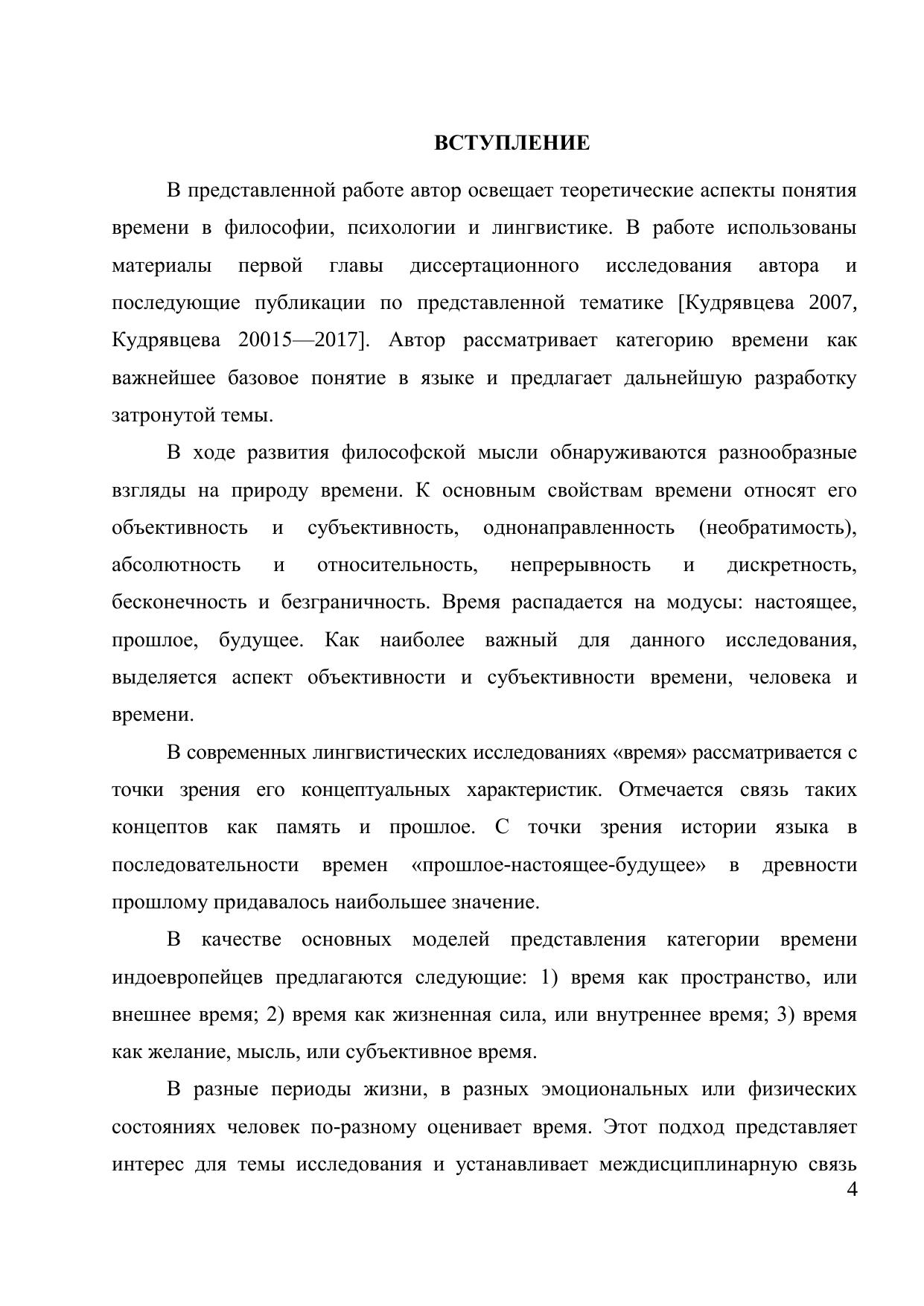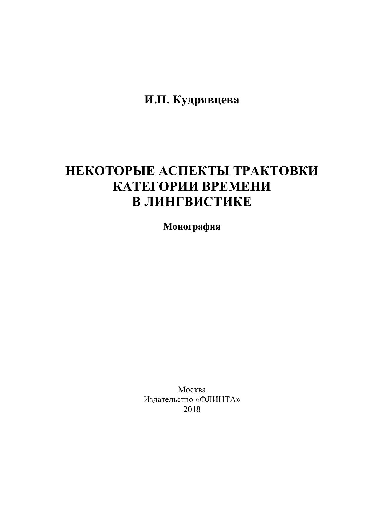 Проблема времени в языковых исследованиях остается актуальной для современных ученых. В монографии рассматривается проблема понятия времени в традиционной лингвистике, а также с точки зрения теории концептуальной метафоры. Затрагиваются общие аспекты категории времени в философии и проблема субъективного восприятия времени в психологии. Монография предназначена для студентов филологических вузов, аспирантов языковых специальностей и для широкого круга читателей.