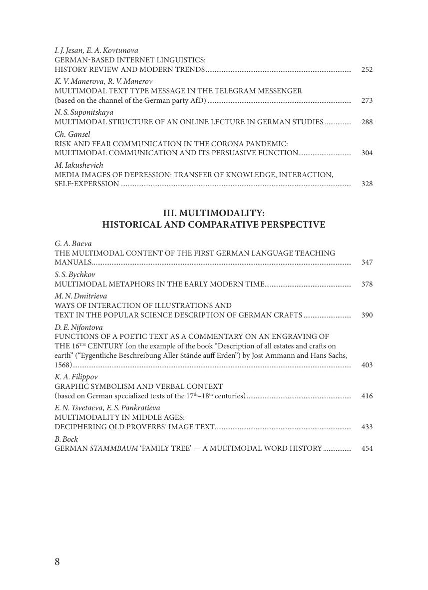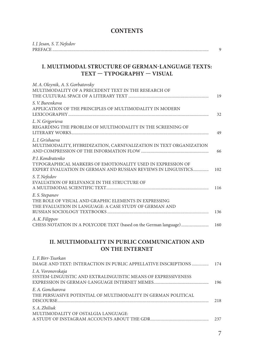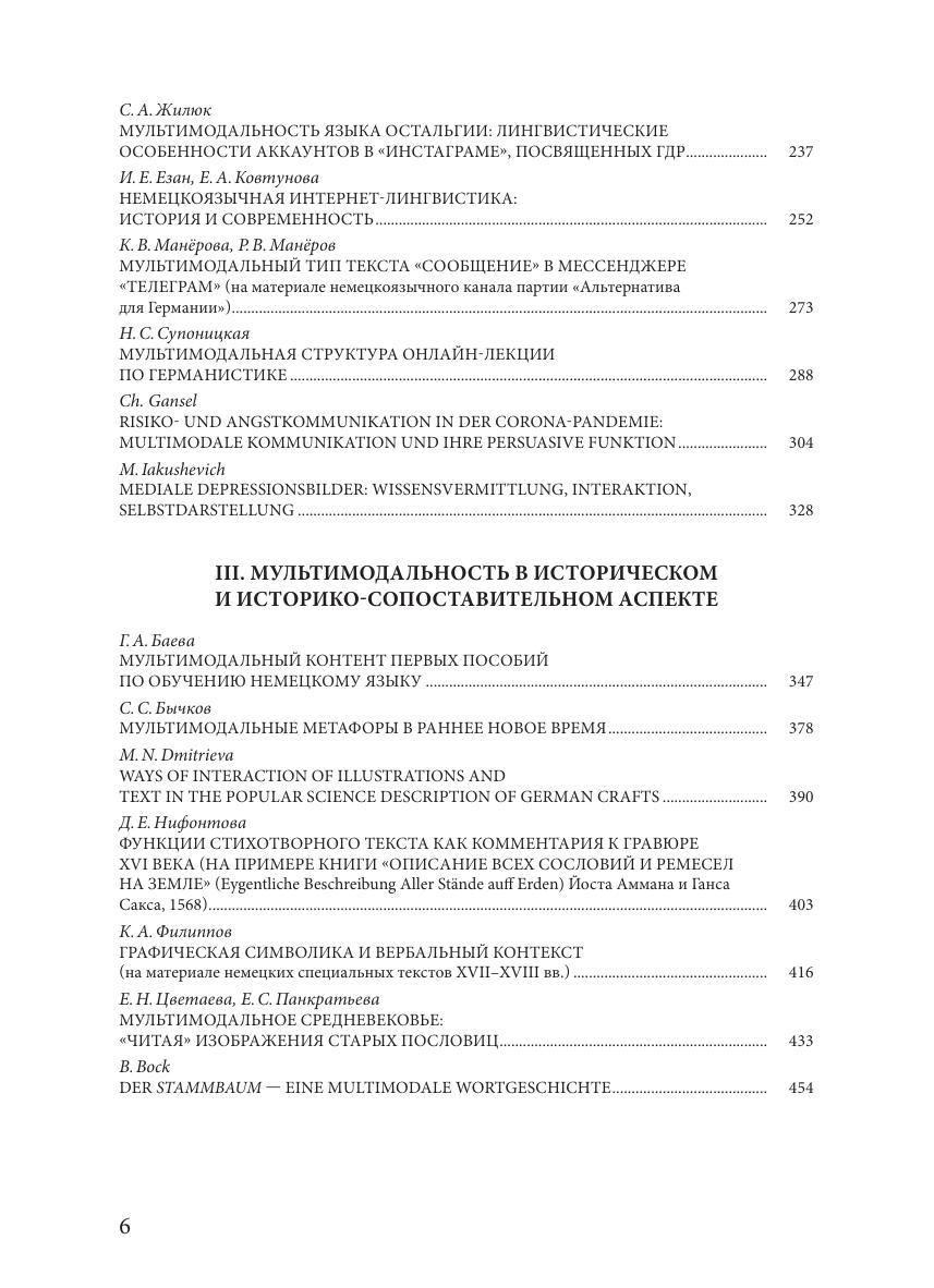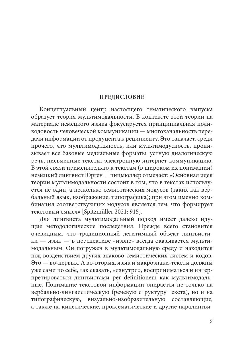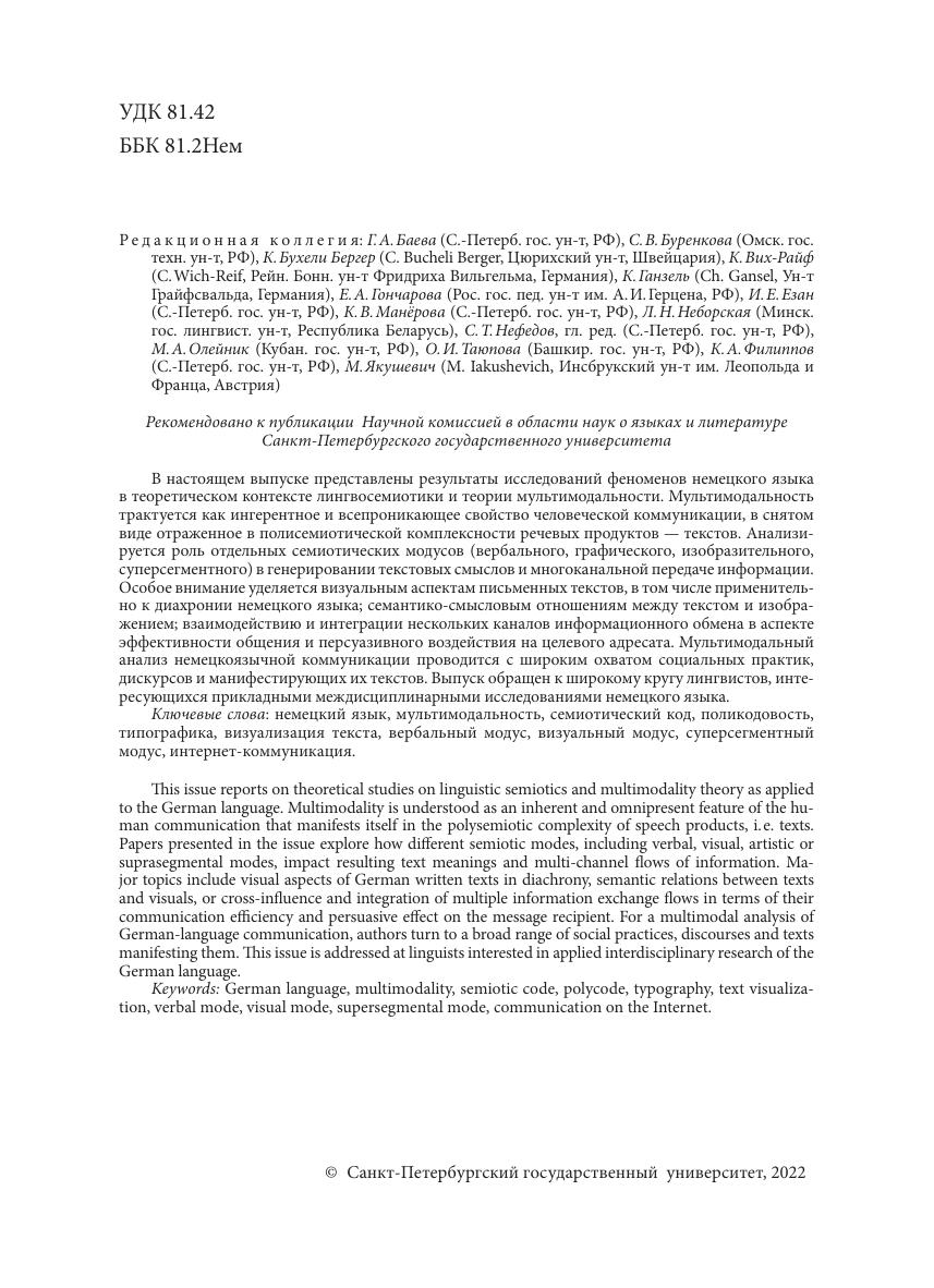 В настоящем выпуске представлены результаты исследований феноменов немецкого языка в теоретическом контексте лингвосемиотики и теории мультмодальности. Мультимодальность трактуется как ингерентное и все проникающее свойство человеческой коммуникации, в снятом виде отраженное в полисемиотической комплексности речевых продуктов - текстов. Анализируется ролью отдельных семиотических модусов (вербального, графического, изобразительного, суперсегментного) в генерировании текстовых смыслов и многоканальной передаче информации. Особое внимание уделяется визуальным аспектам письменных текстов, в том числе применительно к диахронии немецкого языка; семантико-смысловым отношениям между текстом и изображением; взаимодействию и интеграции нескольких каналов информационного обмена в аспекте эффективности общения и персуазивного воздействия на целевого адресата. Мультимодальный анализ немецкоязычной коммуникации проводится с широким охватом социальных практик, дискурсов и манифестирующих их текстов. Выпуск обращен к широкому кругу лингвистов, интересующихся прикладными междисциплинарными исследованиями немецкого языка.