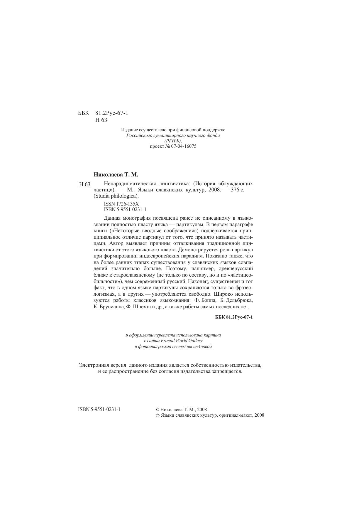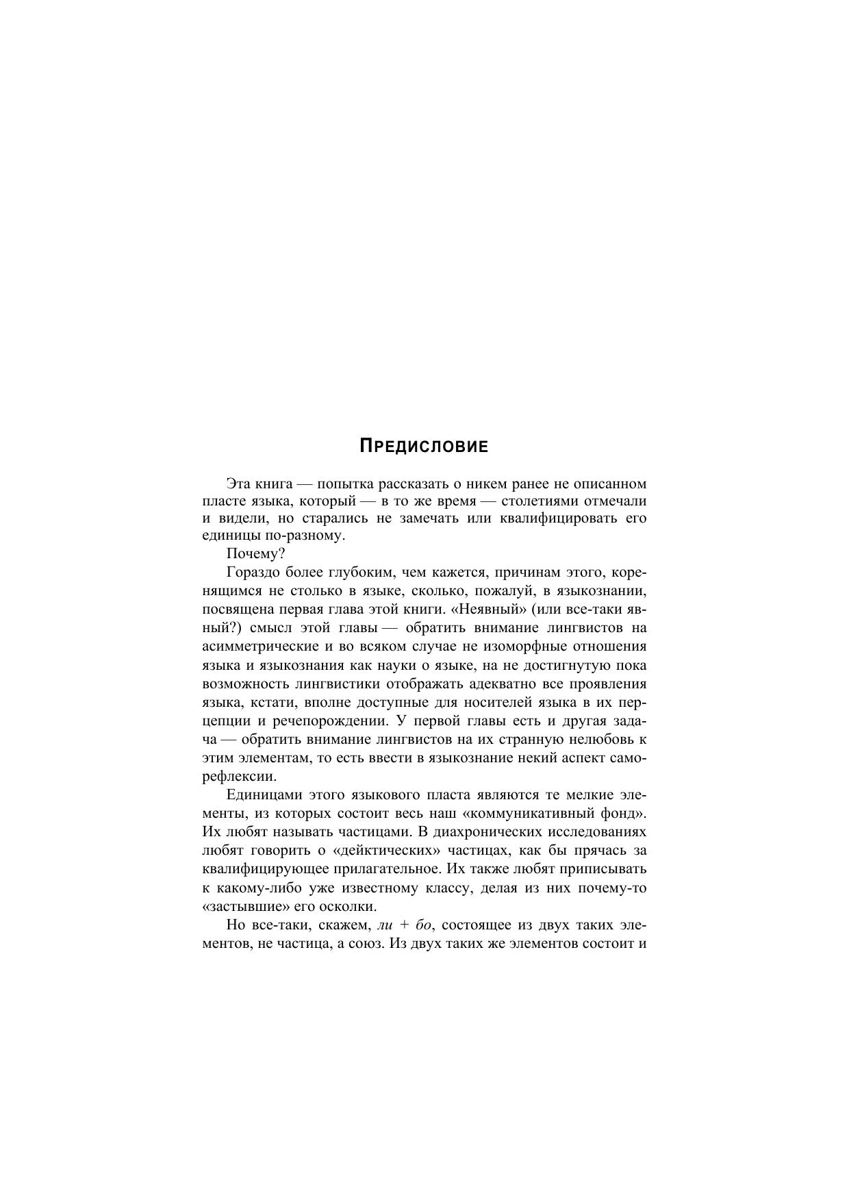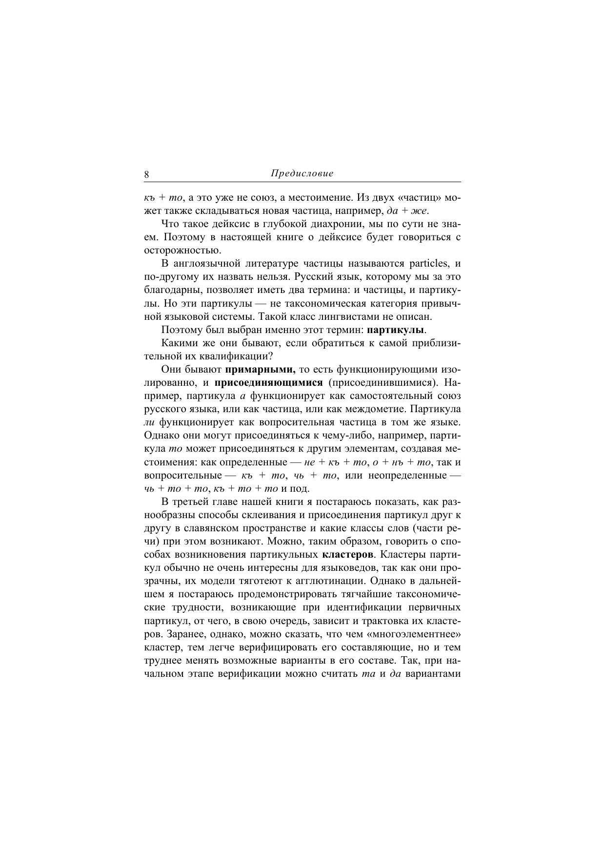 Данная монография посвящена ранее не описанному в языкознании полностью пласту языка — партикулам. В первом параграфе книги («Некоторые вводные соображения») подчеркивается принципиальное отличие партикул от того, что принято называть частицами. Автор выявляет причины отталкивания традиционной лингвистики от этого языкового пласта. Демонстрируется роль партикул при формировании индоевропейских парадигм. Показано также, что на более ранних этапах существования у славянских языков совпадений значительно больше. Поэтому, например, древнерусский ближе к старославянскому (не только по составу, но и по «частицеобильности»), чем современный русский. Наконец, существенен и тот факт, что в одном языке партикулы сохраняются только во фразеологизмах, а в других — употребляются свободно. Широко используются работы классиков языкознания: Ф. Боппа, Б. Дельбрюка, К. Бругманна, Ф. Шпехта и др., а также работы самых последних лет