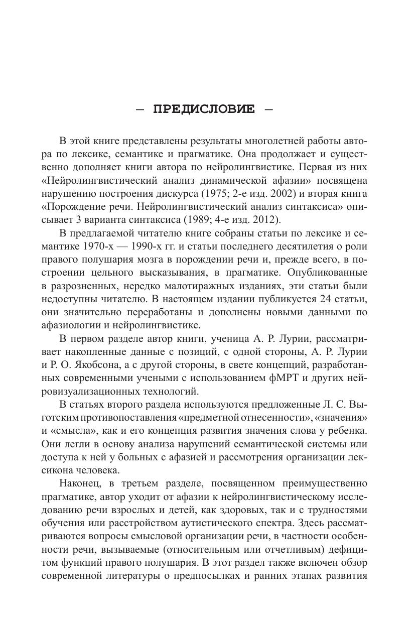 Эта книга известного нейропсихолога и нейролингвиста Т. В. Ахутиной является третьей в серии книг, посвященных механизмам порождения речи по данным афазии. Первая книга «Нейролингвистический анализ динамической афазии» (1975, 2-е изд. 2002) посвящена механизмам построения дискурса, вторая книга «Порождение речи. Нейролингвистический анализ синтаксиса» (1989, 4-е изд. 2012) раскрывает взаимодействие трех вариантов синтаксиса. В этой, третьей книге, собраны статьи по лексике 1970-1980-х гг., по семантике 1980-1990-х гг. и статьи последнего десятилетия по прагматике. В настоящем издании они переработаны и дополнены новыми данными по афазиологии и нейролингвистике. Ученица А. Р Лурии Т. В. Ахутина анализирует речь больных с афазией с теоретических позиций Л. С. Выготского и А. Р. Лурии и использует эти данные для конкретизации положений Л. С. Выготского о пути от мысли к слову, для дальнейшей разработки модели порождения речи, предложенной ею совместно с А. А. Леонтьевым. Книга адресована психологам, лингвистам, логопедам, специалистам в области когнитивной нейронауки, а также широкому кругу читателей, интересующихся механизмами порождения и понимания речи.