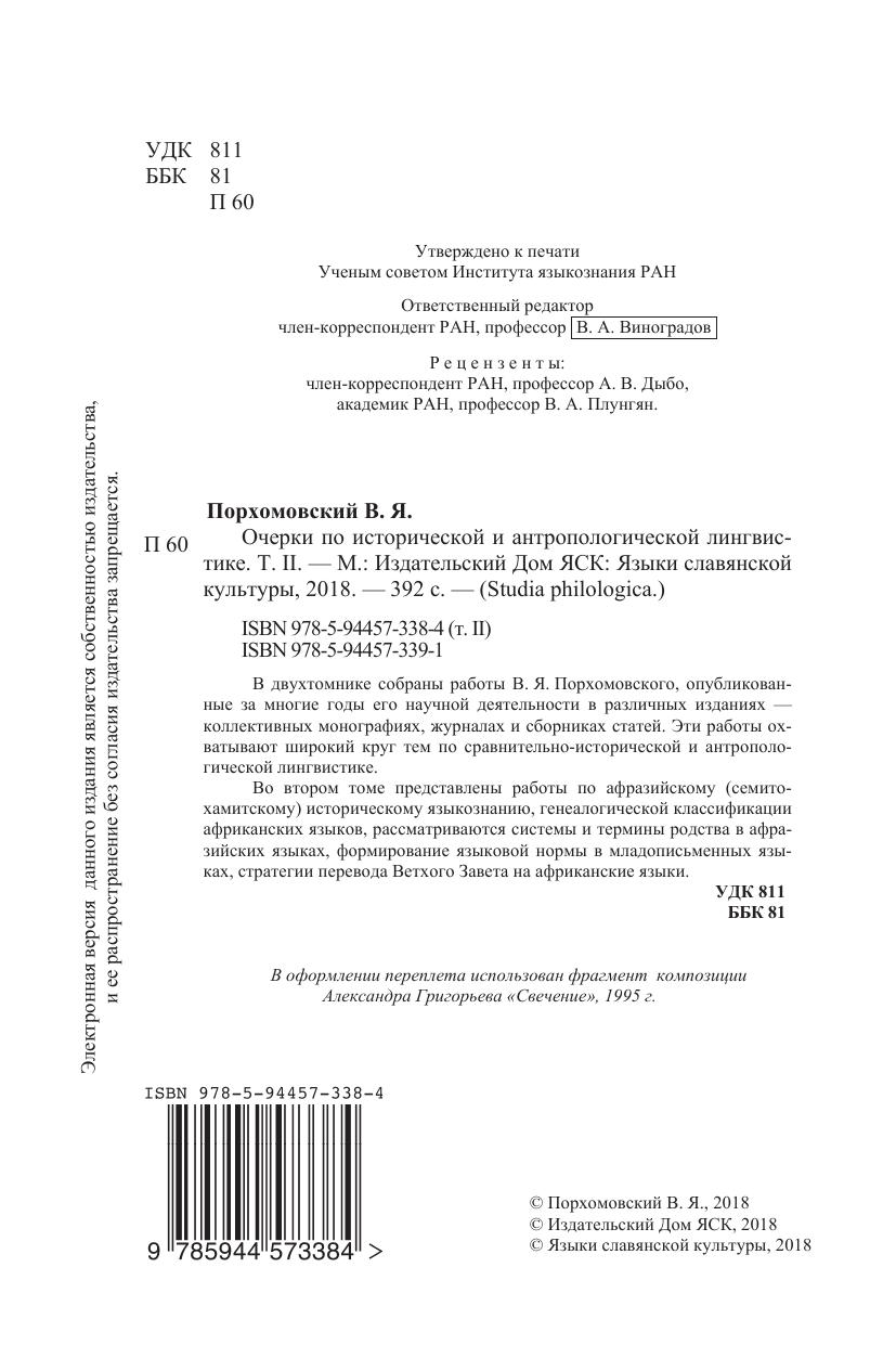 B двухтомнике собраны работы B.Я. Порхомовского, опубликованные за многие годы его научной деятельности в различных изданиях – коллективных монографиях, журналах и сборниках статей. Эти работы охватывают широкий круг тем по сравнительно-исторической и антропологической лингвистике. Во втором томе представлены работы по афразийскому (семитохамитскому) историческому языкознанию, генеалогической классификации африканских языков, рассматриваются системы и термины родства в афразийских языках, формирование языковой нормы в младописьменных языках, стратегии перевода Ветхого Завета на африканские языки.