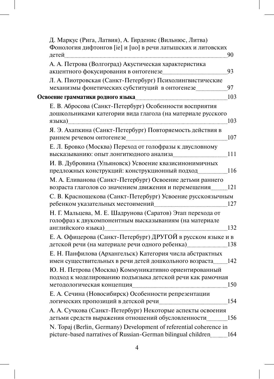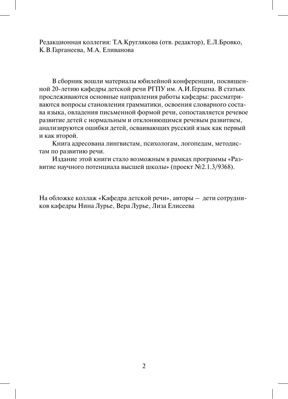Материалы международной конференции, посвященной 20-летию кафедры детской речи РГПУ им. А.И. Герцена (4–6 мая 2011 г., Санкт-Петербург). В сборник вошли материалы юбилейной конференции, посвященной 20-летию кафедры детской речи РГПУ им. А.И. Герцена. В статьях прослеживаются основные направления работы кафедры: рассматриваются вопросы становления грамматики, освоения словарного состава языка, овладения письменной формой речи, сопоставляется речевое развитие детей с нормальным и отклоняющимся речевым развитием, анализируются ошибки детей, осваивающих русский язык как первый и как второй. Книга адресована лингвистам, психологам, логопедам, методистам по развитию речи. Издание этой книги стало возможным в рамках программы «Развитие научного потенциала высшей школы» (проект №2.1.3/9368).