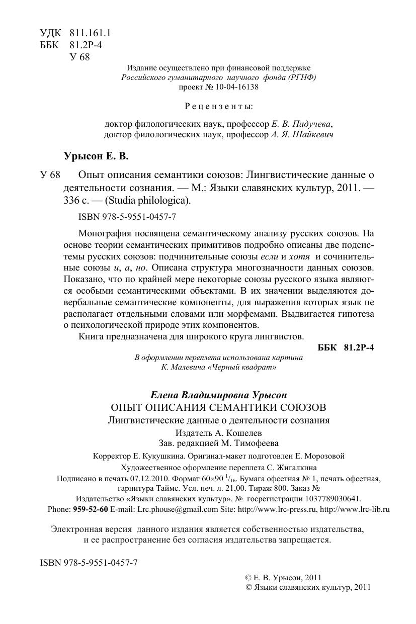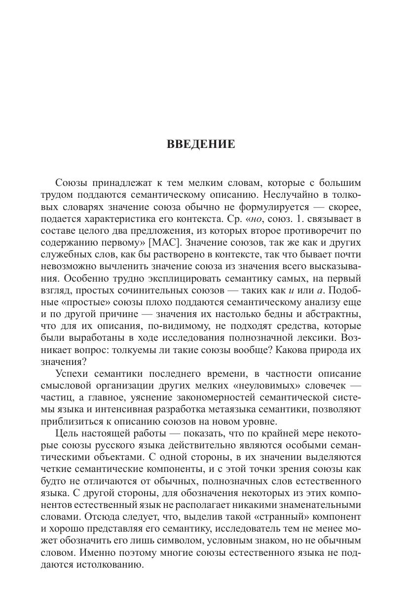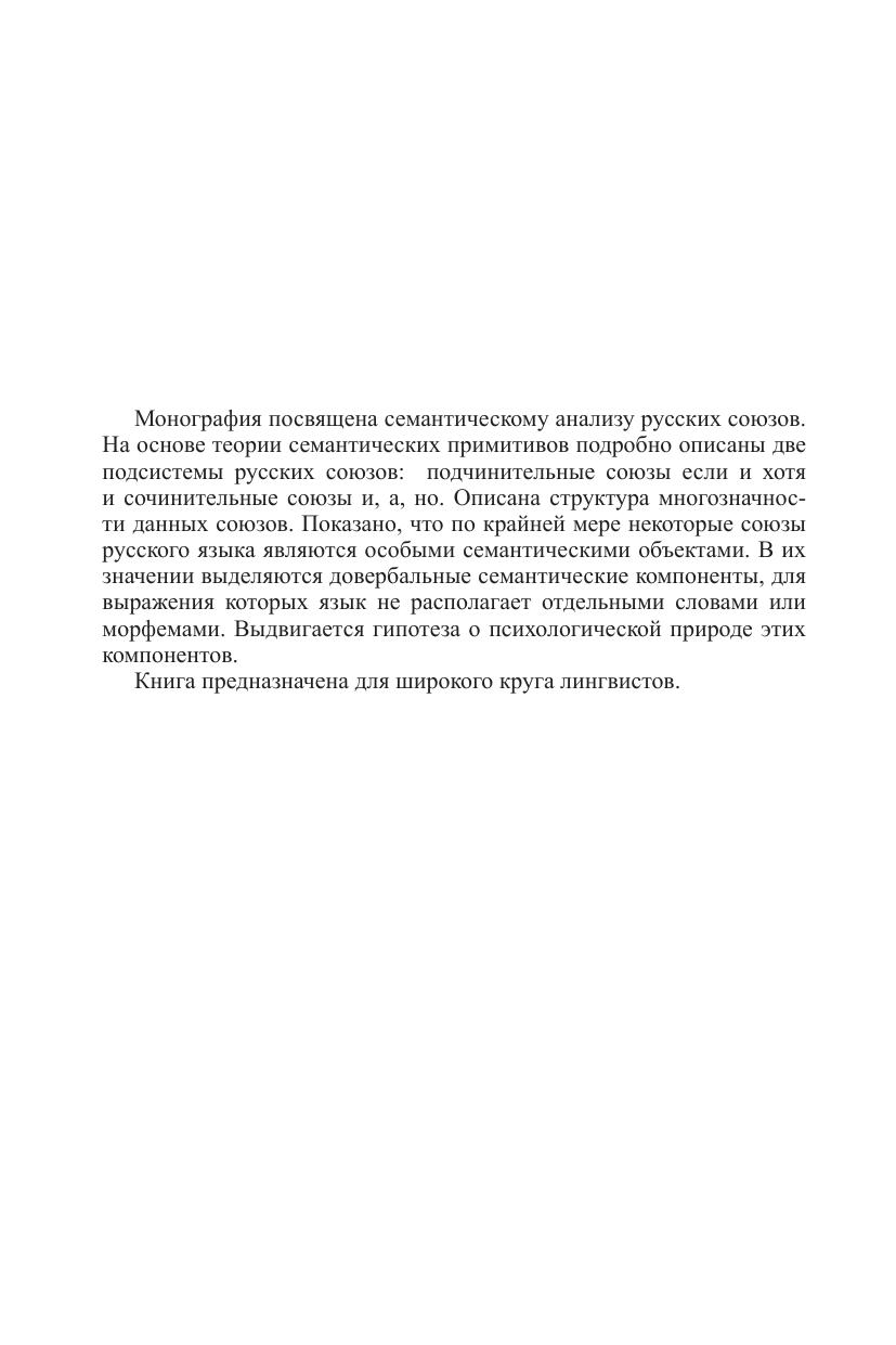 Монография посвящена семантическому анализу русских союзов. На основе теории семантических примитивов подробно описаны две подсистемы русских союзов: подчинительные союзы если и хотя и сочинительные союзы и, а, но. Описана структура многозначности данных союзов. Показано, что по крайней мере некоторые союзы русского языка являются особыми семантическими объектами. В их значении выделяются до-вербальные семантические компоненты, для выражения которых язык не располагает отдельными словами или морфемами. Выдвигается гипотеза о психологической природе этих компонентов. Книга предназначена для широкого круга лингвистов.