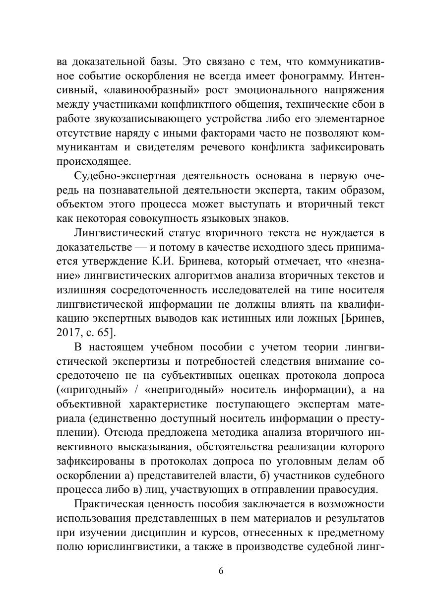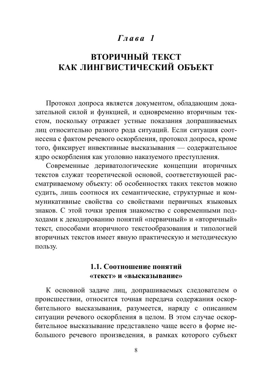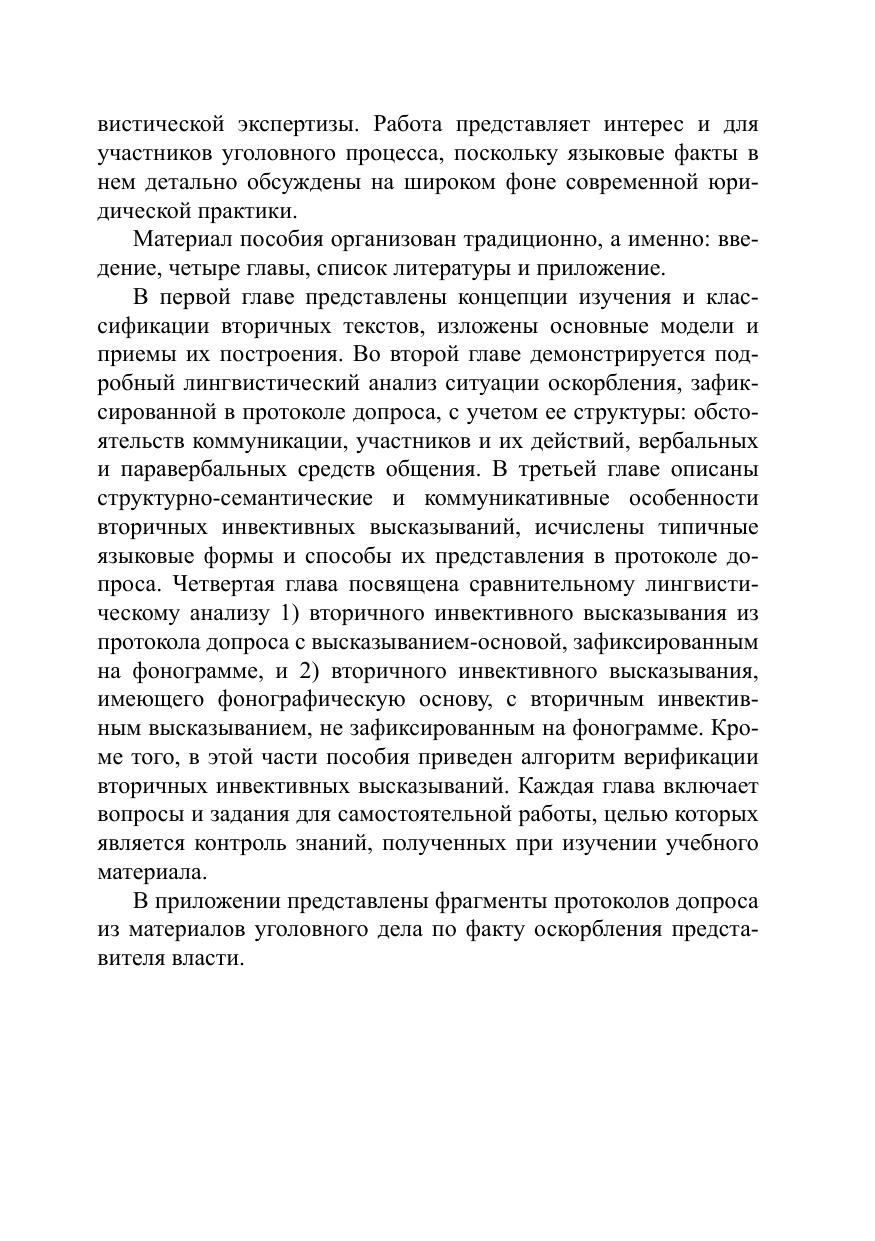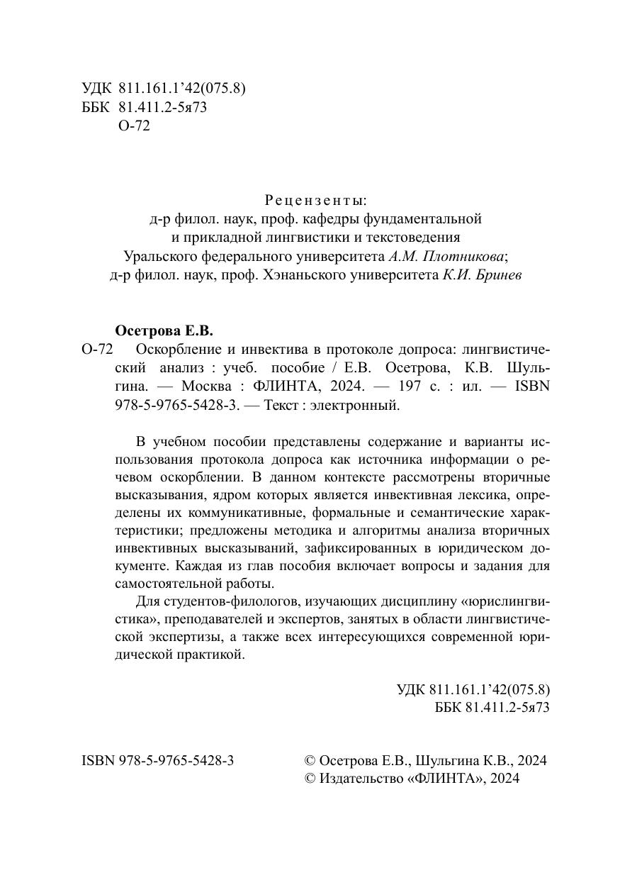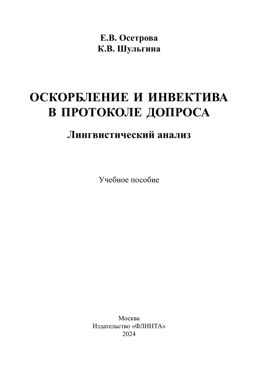 В учебном пособии представлены содержание и варианты использования протокола допроса как источника информации о речевом оскорблении. В данном контексте рассмотрены вторичные высказывания, ядром которых является инвективная лексика, определены их коммуникативные, формальные и семантические характеристики; предложены методика и алгоритмы анализа вторичных инвективных высказываний, зафиксированных в юридическом документе. Каждая из глав пособия включает вопросы и задания для самостоятельной работы. Для студентов-филологов, изучающих дисциплину «юрислингвистика», преподавателей и экспертов, занятых в области лингвистической экспертизы, а также всех интересующихся современной юридической практикой.