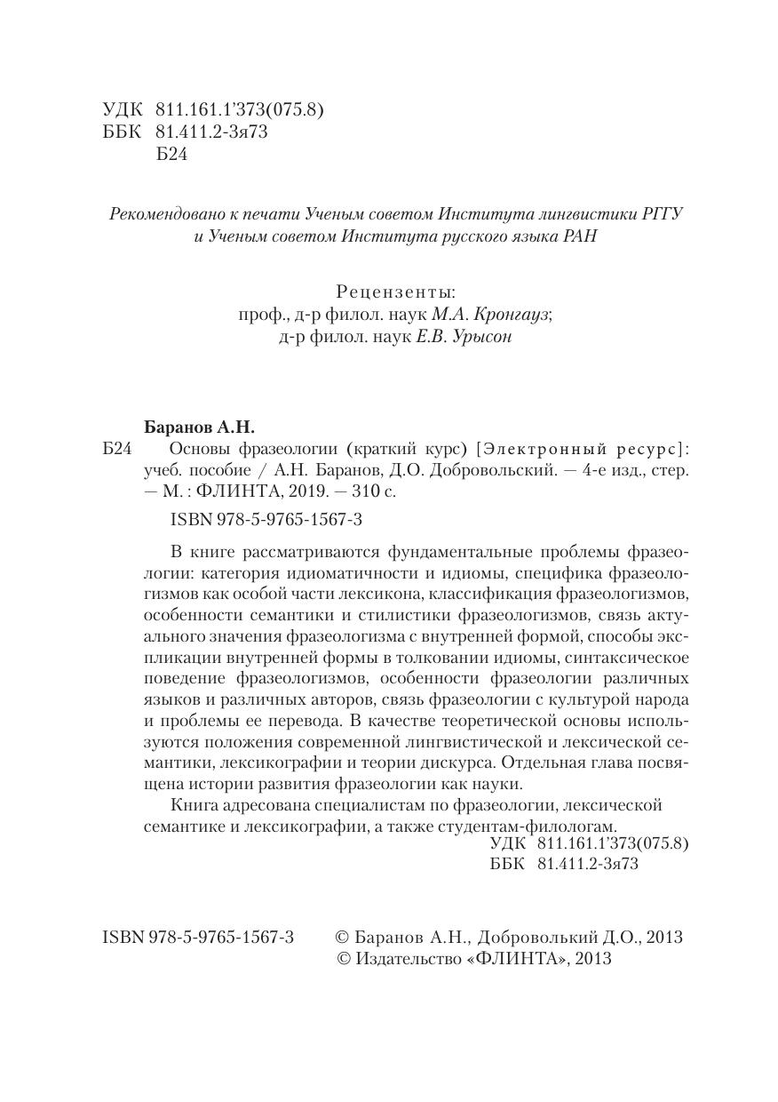 В книге рассматриваются фундаментальные проблемы фразеологии: категория идиоматичности и идиомы, специфика фразеологизмов как особой части лексикона, классификация фразеологизмов, особенности семантики и стилистики фразеологизмов, связь актуального значения фразеологизма с внутренней формой, способы экспликации внутренней формы в толковании идиомы, синтаксическое поведение фразеологизмов, особенности фразеологии различных языков и различных авторов, связь фразеологии с культурой народа и проблемы ее перевода. в качестве теоретической основы используются положения современной лингвистической и лексической семантики, лексикографии и теории дискурса. отдельная глава посвящена истории развития фразеологии как науки. Книга адресована специалистам по фразеологии, лексической