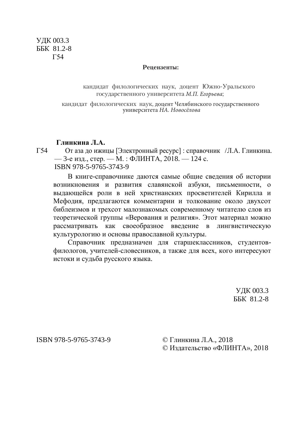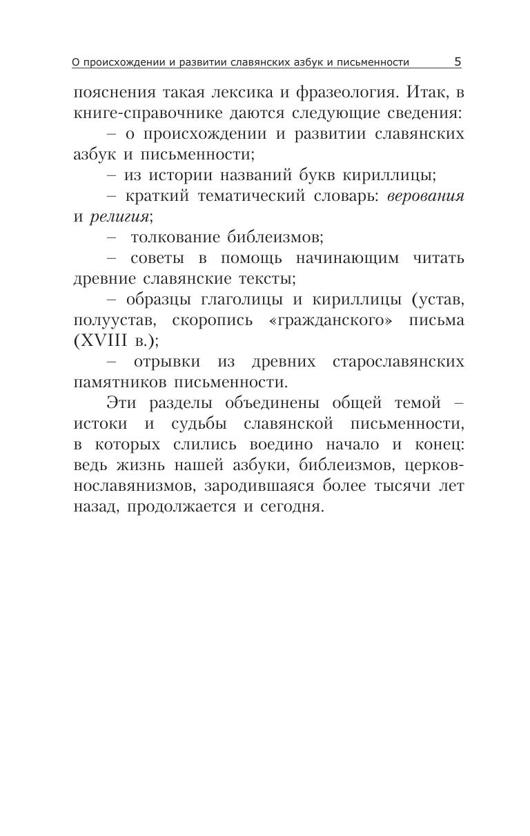 В книге-справочнике даются самые общие сведения об истории возникновения и развития славянской азбуки, письменности, о выдающейся роли в ней христианских просветителей Кирилла и Мефодия, предлагаются комментарии и толкование около двухсот библеизмов и трехсот малознакомых современному читателю слов из теоретической группы «Верования и религия». Этот материал можно рассматривать как своеобразное введение в лингвистическую культурологию и основы православной культуры. Справочник предназначен для старшеклассников, студентов-филологов, учителей-словесников, а также для всех, кого интересуют истоки и судьба русского языка.