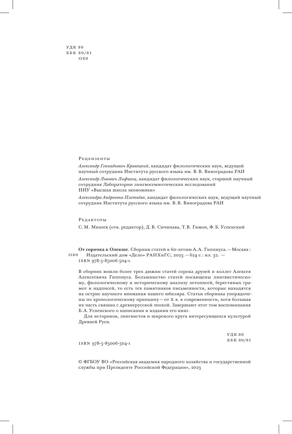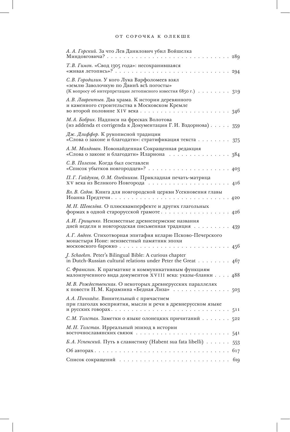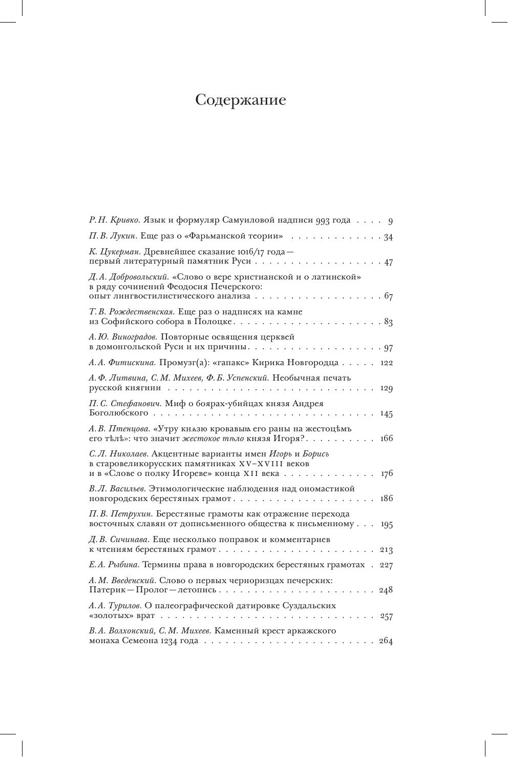 В сборник вошли более трех дюжин статей сорока друзей и коллег Алексея Алексеевича Гиппиуса. Большинство статей посвящены лингвистическому, филологическому и историческому анализу летописей, берестяных грамот и надписей, то есть тех памятников письменности, которые находятся на острие научного внимания нашего юбиляра. Статьи сборника упорядочены по хронологическому принципу — от X в. к современности, хотя большая их часть связана с древнерусской эпохой. Завершают этот том воспоминания Б. А. Успенского о написании и издании его книг. Для историков, лингвистов и широкого круга интересующихся культурой Древней Руси.