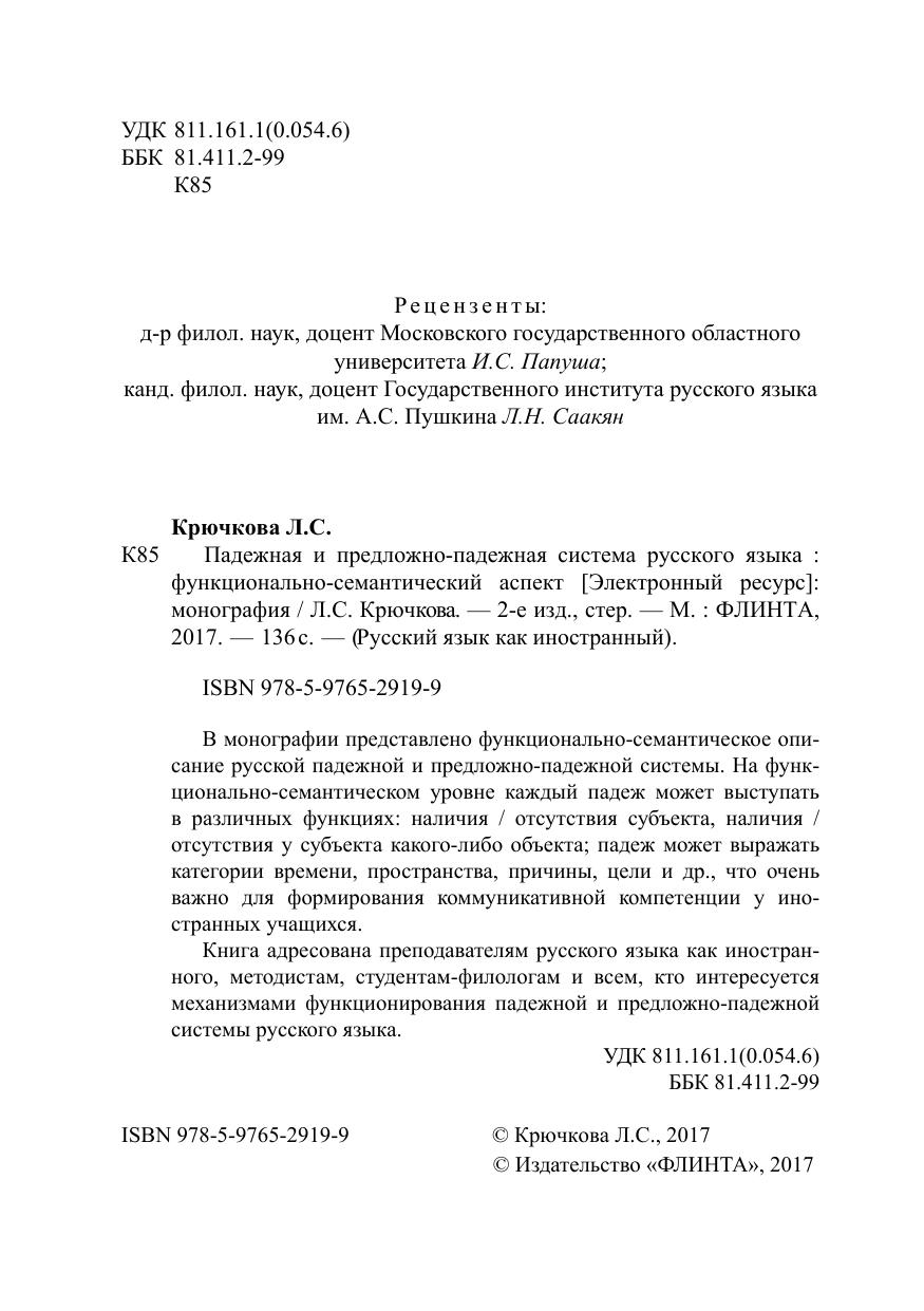 В монографии представлено функционально-семантическое описание русской падежной и предложно-падежной системы. На функционально-семантическом уровне каждый падеж может выступать в различных функциях: наличия / отсутствия субъекта, наличия / отсутствия у субъекта какого-либо объекта; падеж может выражать категории времени, пространства, причины, цели и др., что очень важно для формирования коммуникативной компетенции у иностранных учащихся.