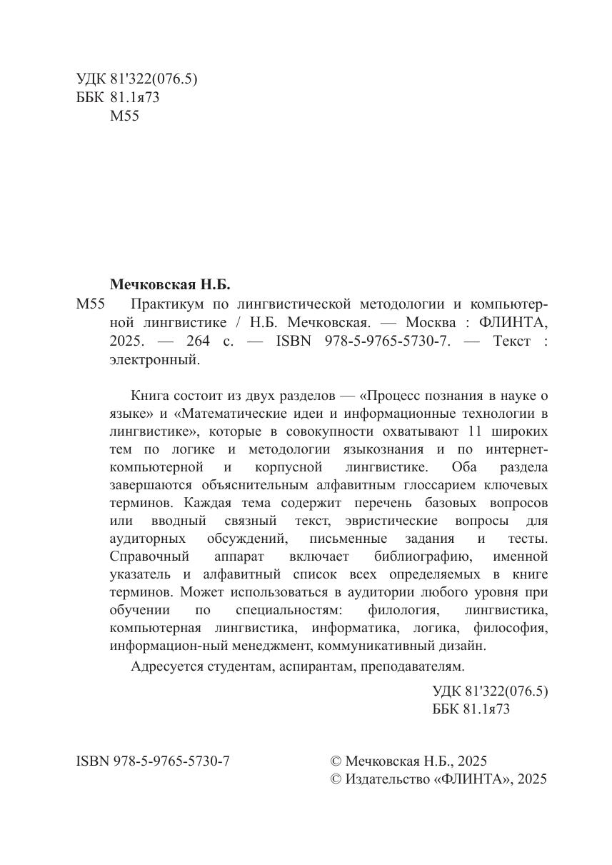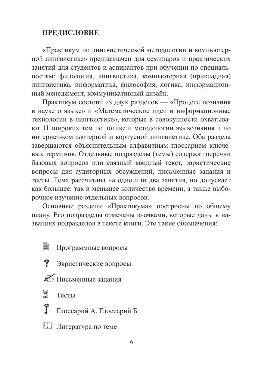 компьютерной и корпусной лингвистике. Оба раздела завершаются объяснительным алфавитным глоссарием ключевых терминов. Каждая тема содержит перечень базовых вопросов или вводный связный текст, эвристические вопросы для аудиторных обсуждений, письменные задания и тесты. Справочный аппарат включает библиографию, именной указатель и алфавитный список всех определяемых в книге терминов. Может использоваться в аудитории любого уровня при обучении по специальностям: филология, лингвистика, компьютерная лингвистика, информатика, логика, философия, информационный менеджмент, коммуникативный дизайн. Адресуется студентам, аспирантам, преподавателям.