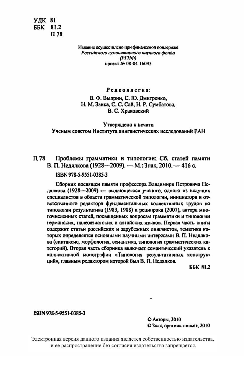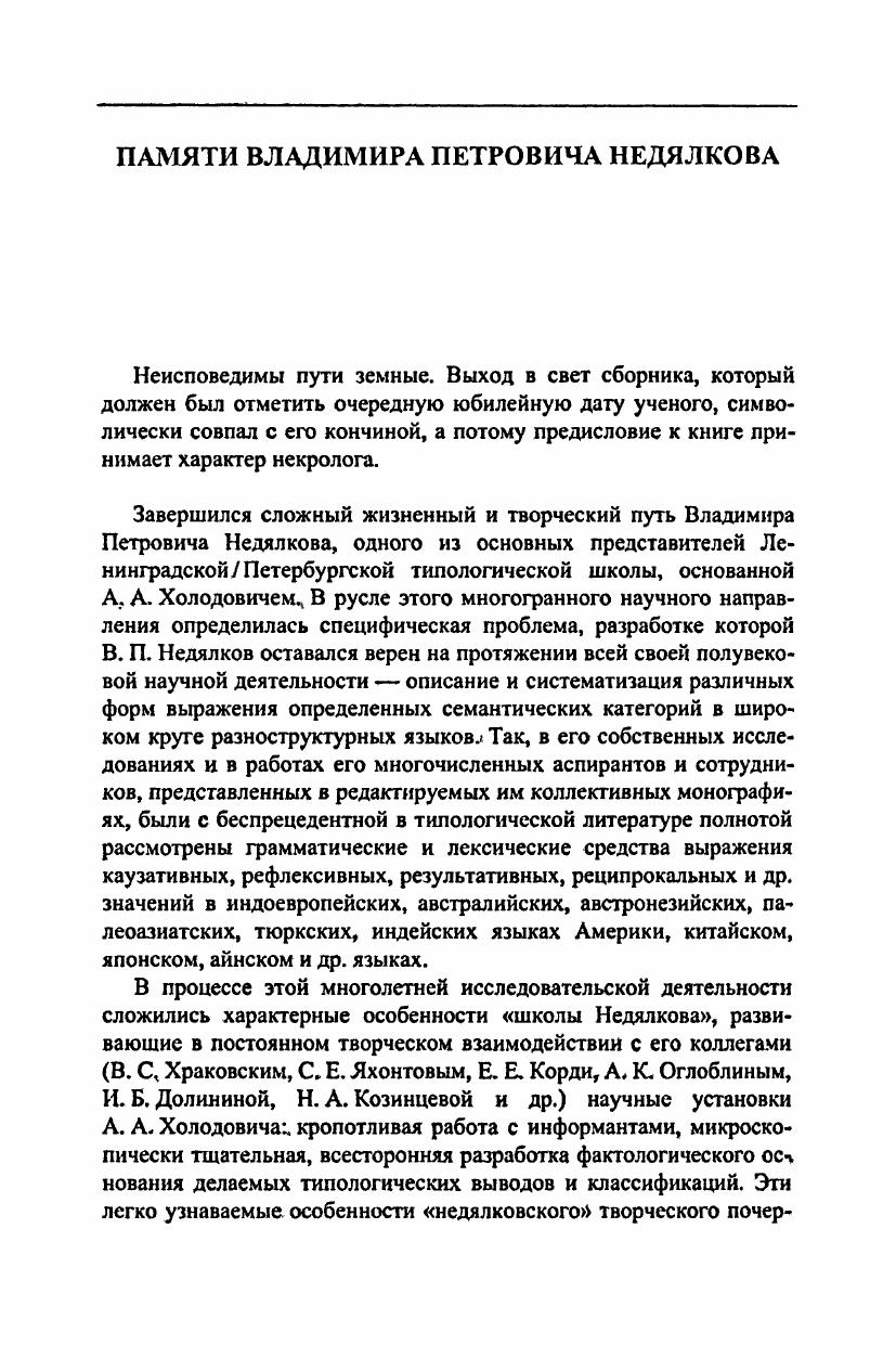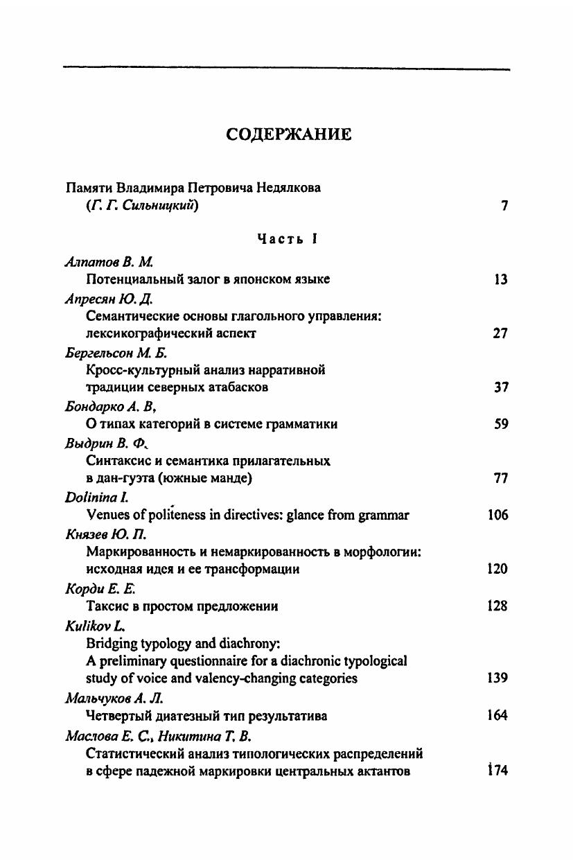 Сборник посвящен памяти профессора Владимира Петровича Недялкова (1928-2009) – выдающегося ученого, одного из ведущих специалистов в области грамматической типологии, инициатора и ответственного редактора фундаментальных коллективных трудов по типологии результатива (1983, 1988) и реципрока (2007), автора многочисленных статей, посвященных вопросам грамматики и типологии германских, палеоазиатских и алтайских языков. Первая часть книги содержит статьи российских и зарубежных лингвистов, тематика которых определяется основными научными интересами В. П. Недялкова (синтаксис, морфология, семантика, типология грамматических категорий). Вторая часть сборника включает семантический указатель к коллективной монографии «Типология результативных конструкций», главным редактором которой был В. П. Недялков.