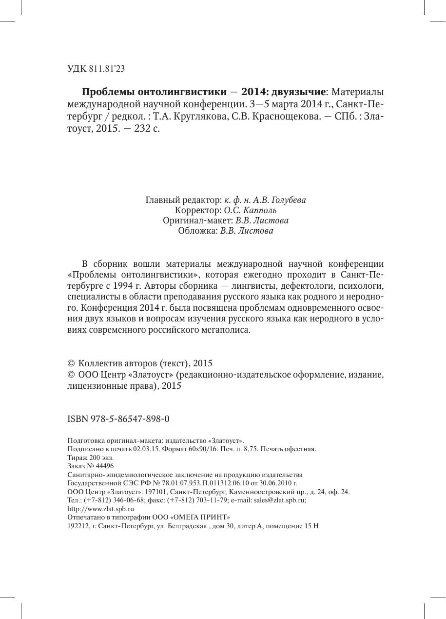 Материалымеждународной научной конференции. 3—5 марта 2014 г., Санкт-Петербург. В сборник вошли материалы международной научной конференции «Проблемы онтолингвистики», которая ежегодно проходит в Санкт-Петербурге с 1994 г. Авторы сборника — лингвисты, дефектологи, психологи, специалисты в области преподавания русского языка как родного и неродного. Конференция 2014 г. была посвящена проблемам одновременного освоения двух языков и вопросам изучения русского языка как неродного в условиях современного российского мегаполиса.