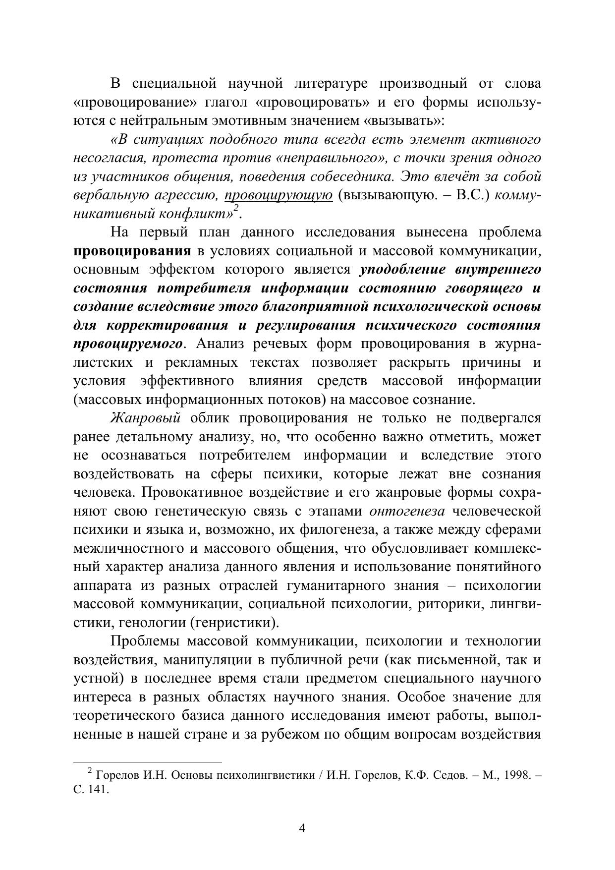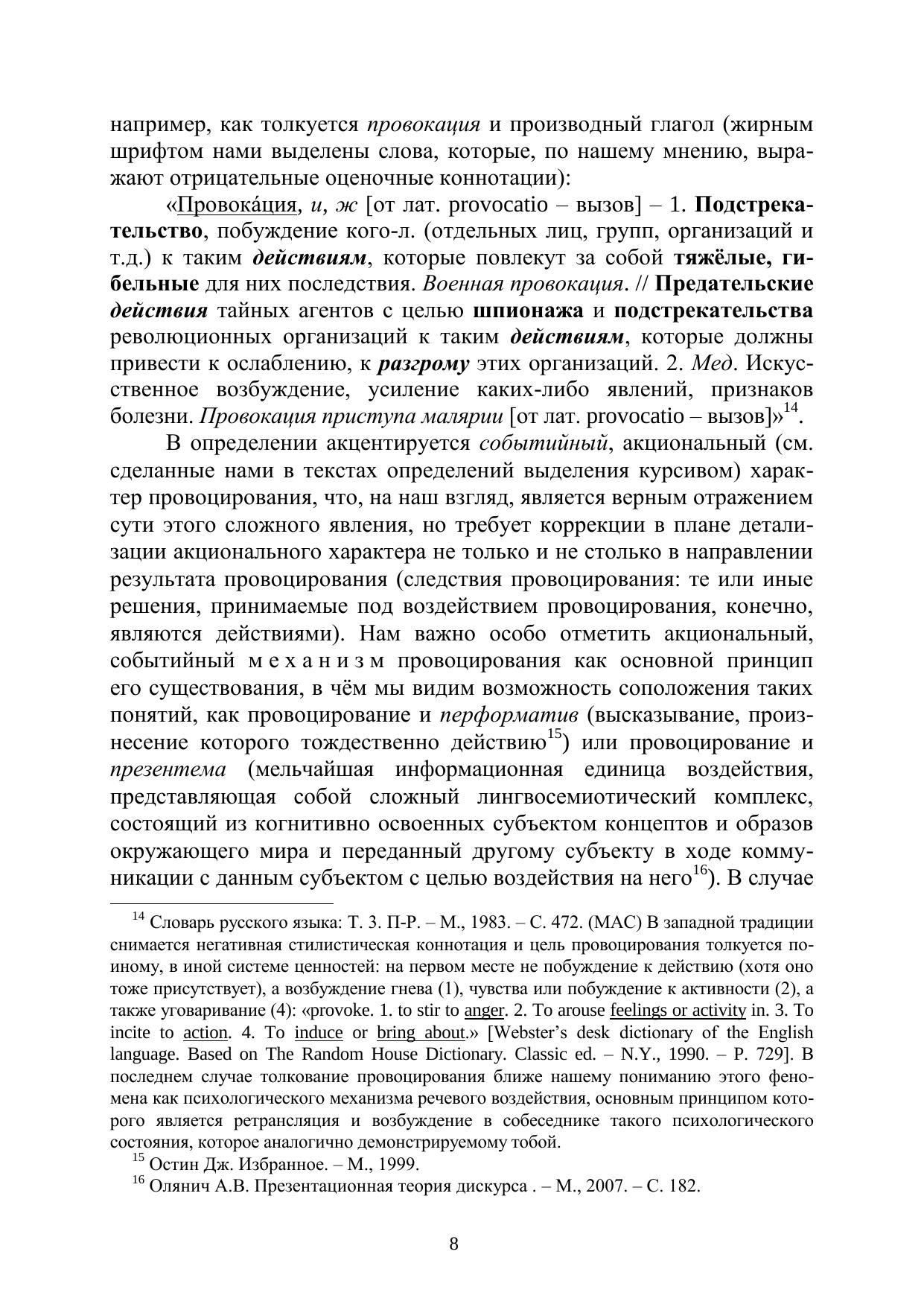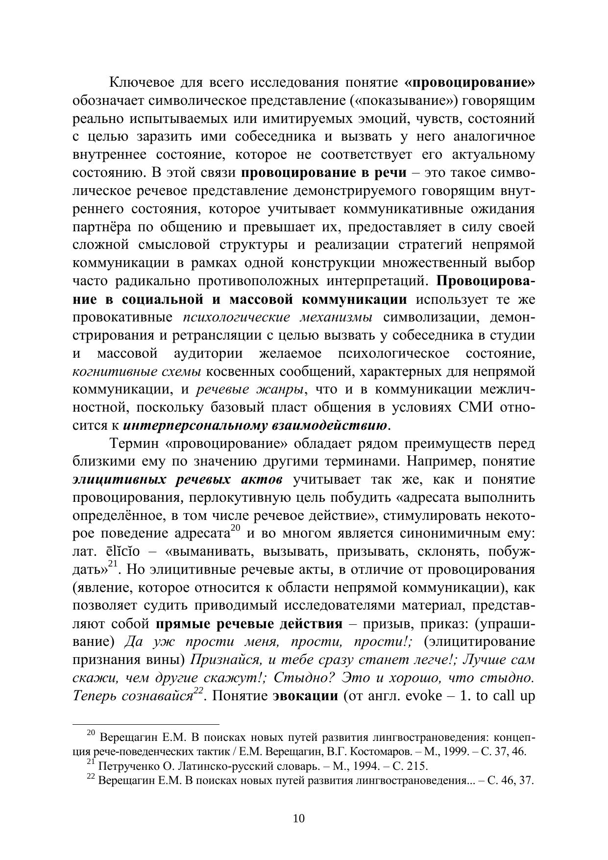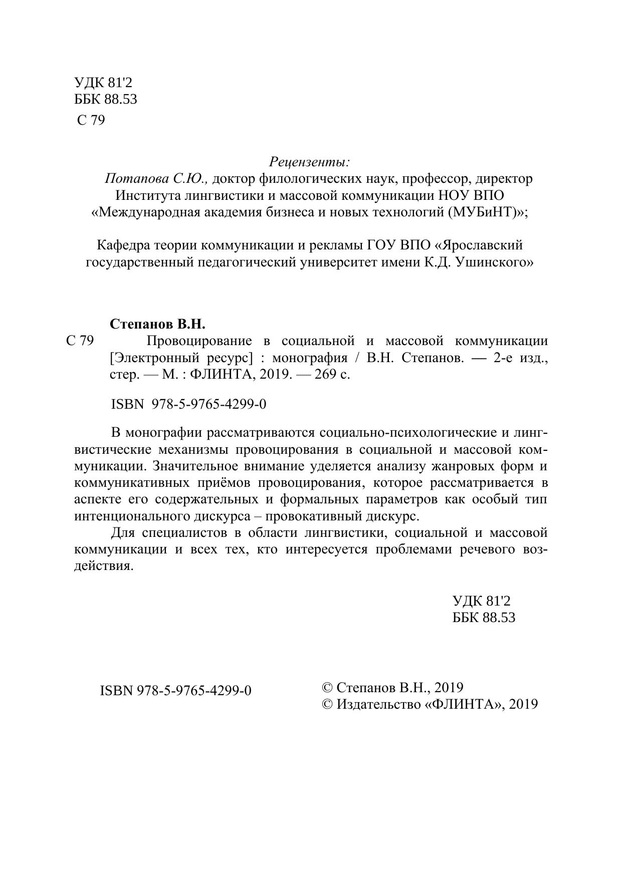 В монографии рассматриваются социально-психологические и лингвистические механизмы провоцирования в социальной и массовой коммуникации. Значительное внимание уделяется анализу жанровых форм и коммуникативных приѐмов провоцирования, которое рассматривается в аспекте его содержательных и формальных параметров как особый тип интенционального дискурса – провокативный дискурс. Для специалистов в области лингвистики, социальной и массовой коммуникации и всех тех, кто интересуется проблемами речевого воздействия.