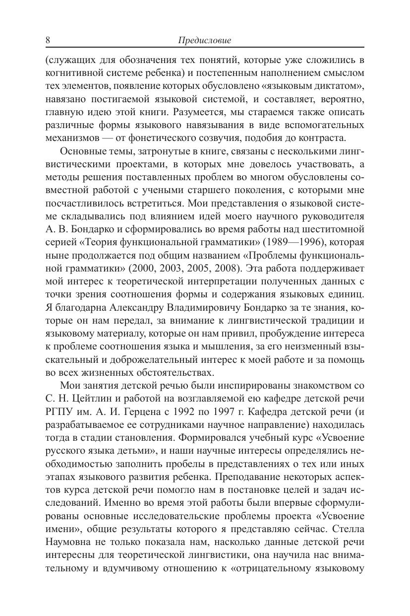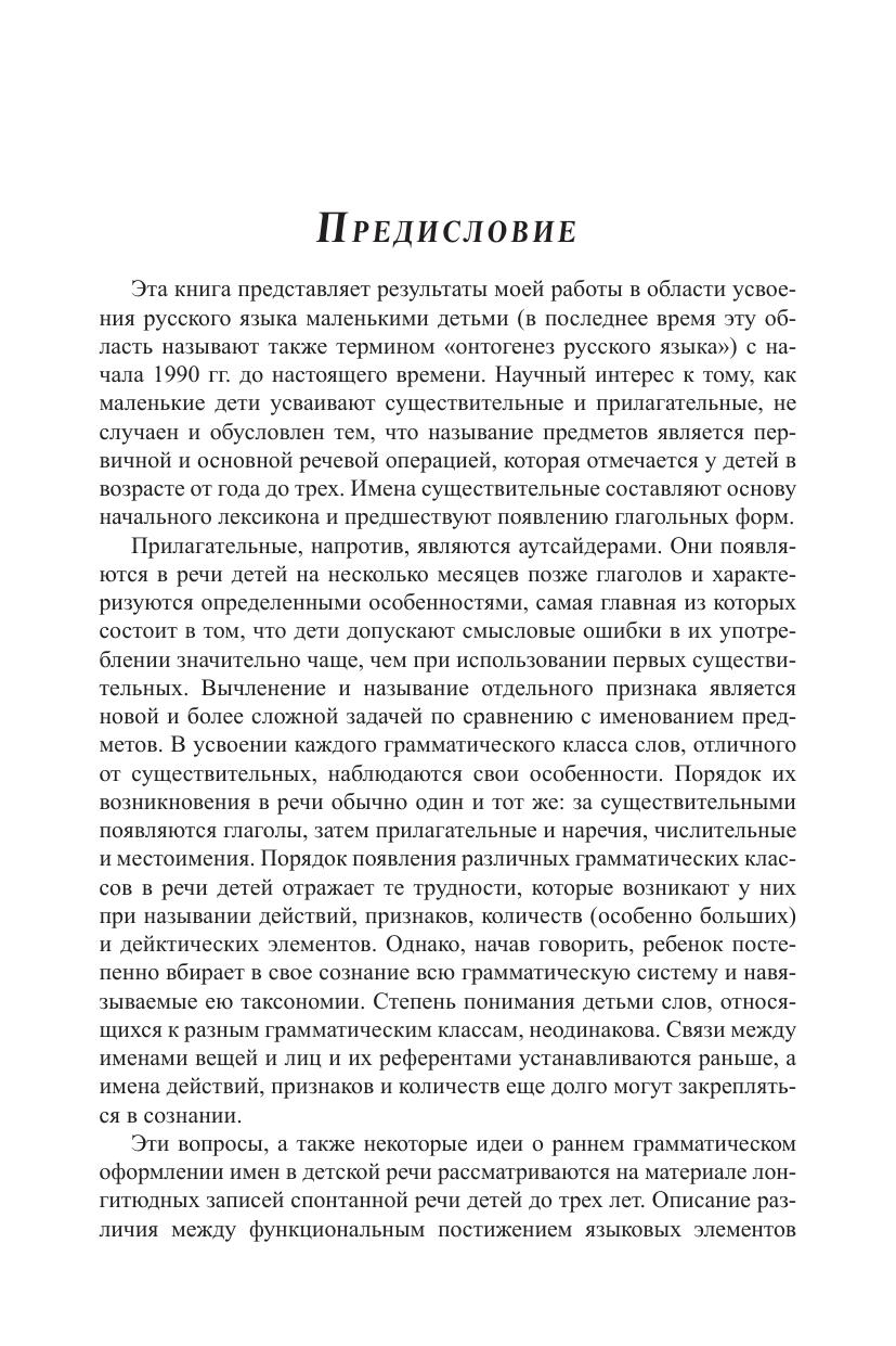 В монографии рассматриваются начальные этапы формирования именной системы русского языка в речи детей до трех лет. Анализируется материал магнитофонных записей спонтанной речи, дневников и специальных опросников для родителей. Процесс усвоения языка ребенком рассматривается с позиций функциональной грамматики и теории естественной морфологии. Большое внимание уделяется внутриязыковым вспомогательным механизмам, которые способствуют овладению основными навыками склонения. Книга адресована специалистам по усвоению первого и второго языков, теории грамматики и лингвистической типологии.