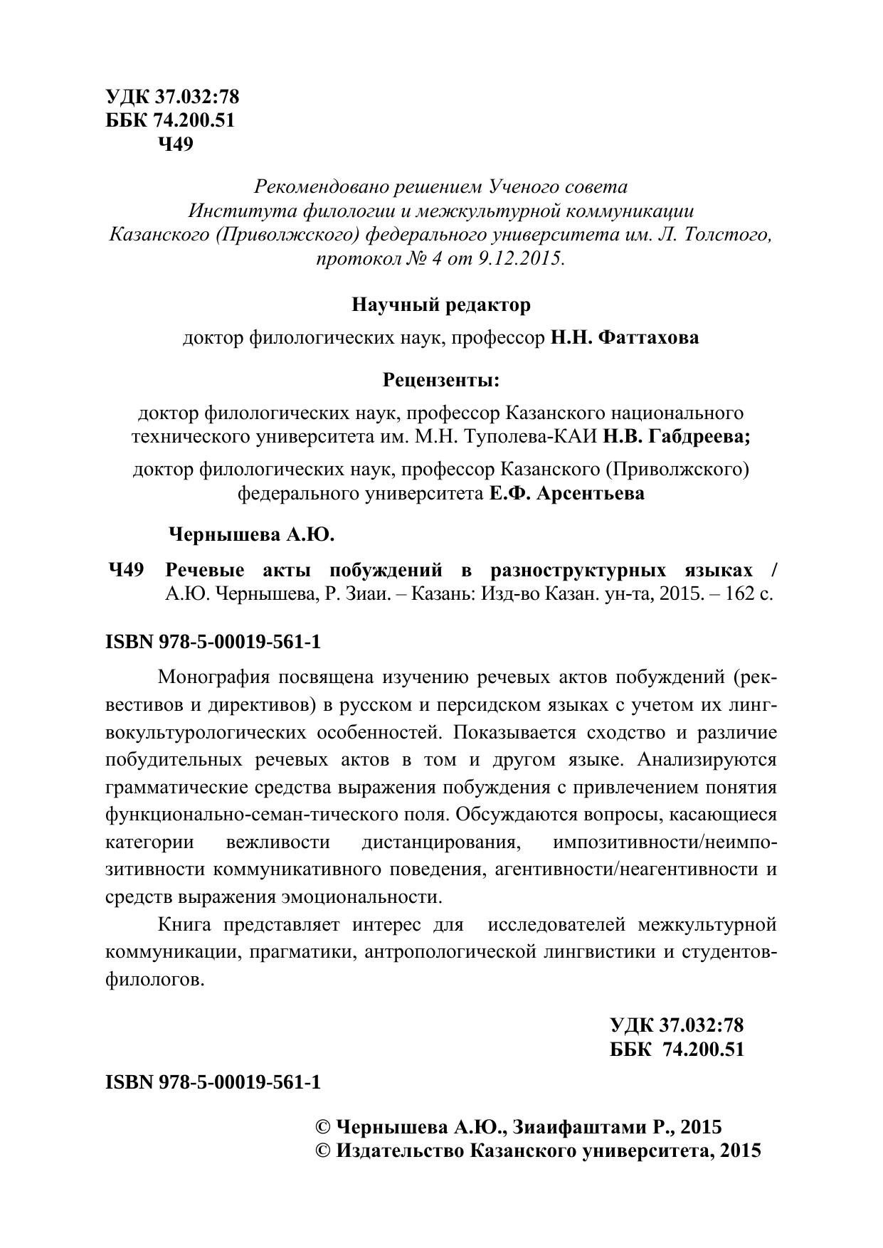Монография посвящена изучению речевых актов побуждений (реквестивов и директивов) в русском и персидском языках с учетом их лингвокультурологических особенностей. Показывается сходство и различие побудительных речевых актов в том и другом языке. Анализируются грамматические средства выражения побуждения с привлечением понятия функционально-семантического поля. Обсуждаются вопросы, касающиеся