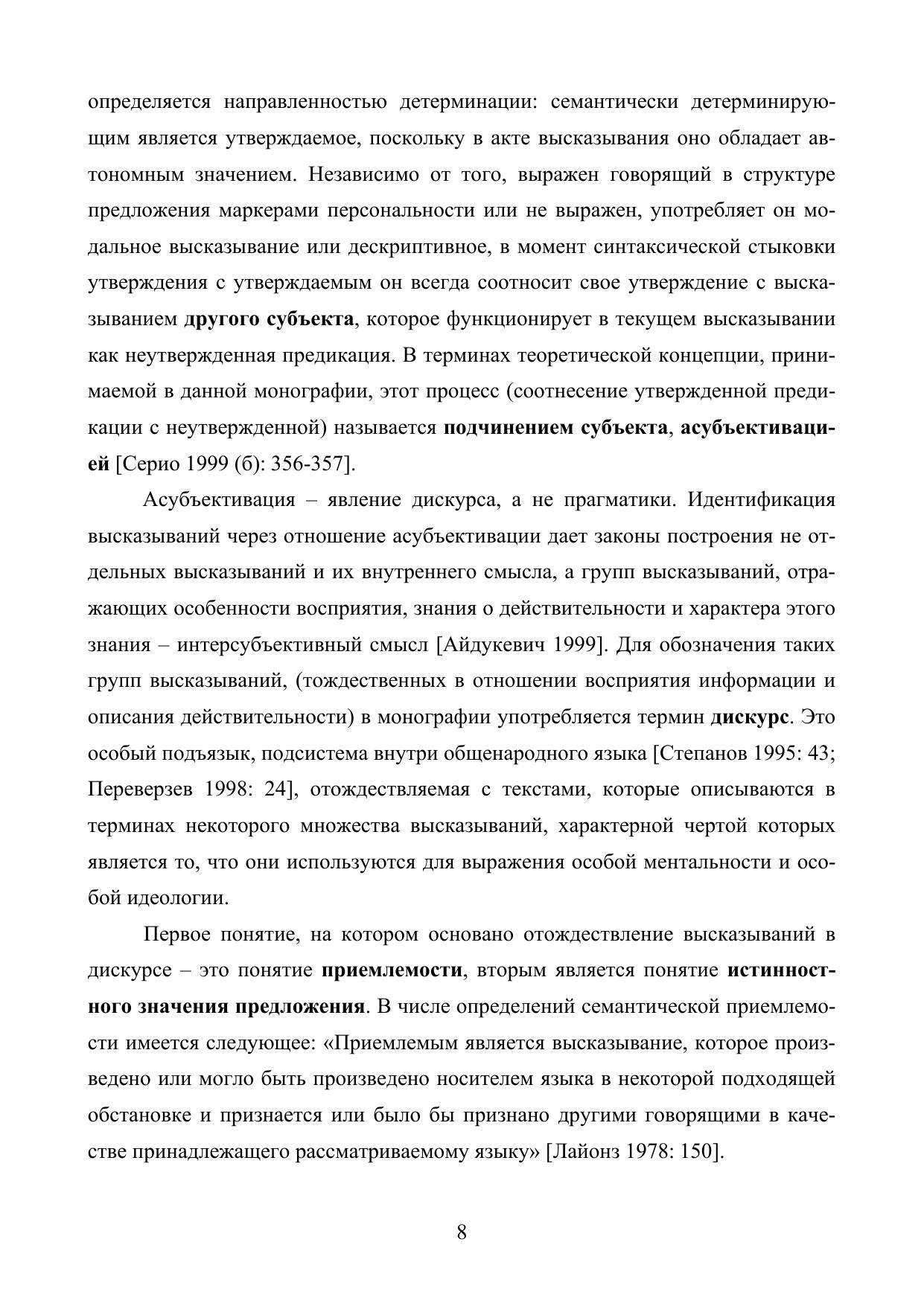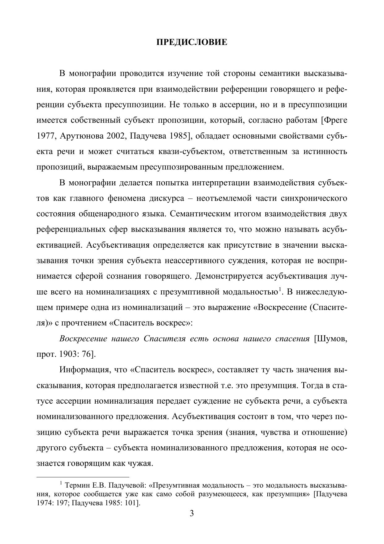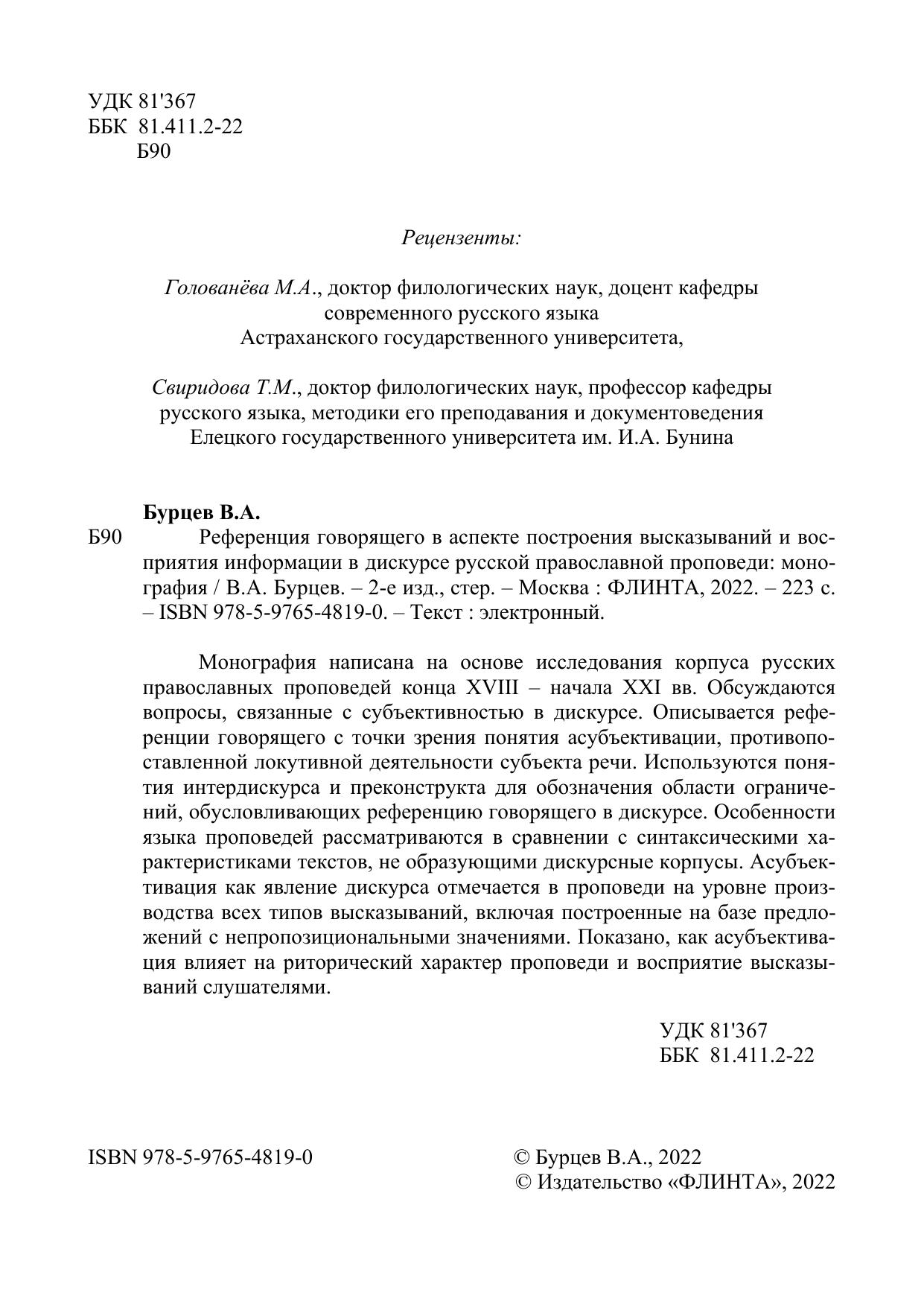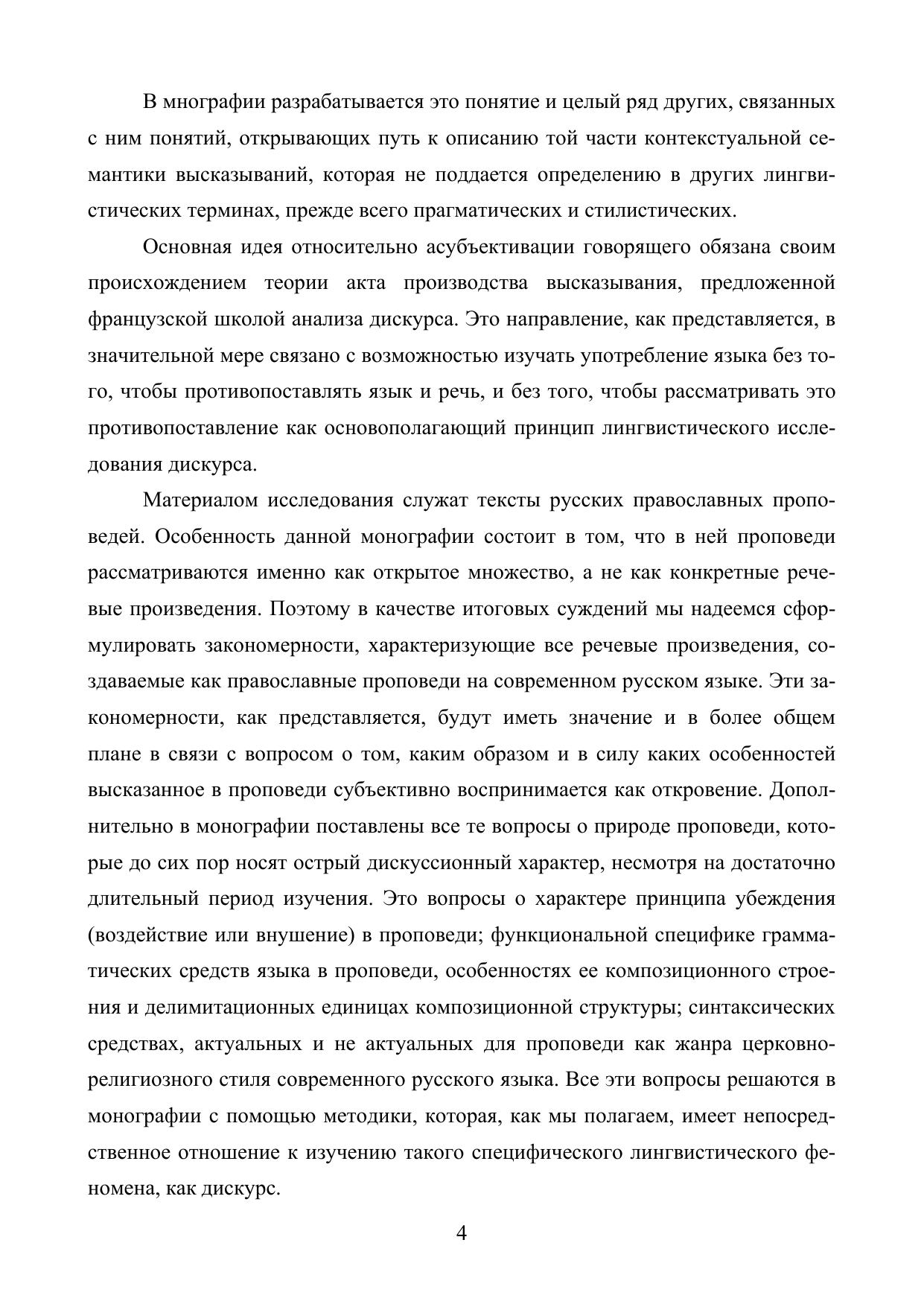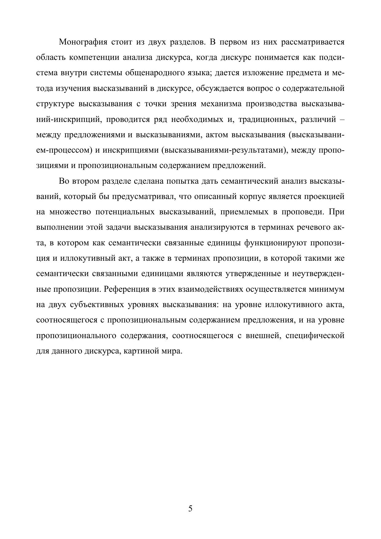 Монография написана на основе исследования корпуса русских православных проповедей конца ХVIII – начала XXI вв. Обсуждаются вопросы, связанные с субъективностью в дискурсе. Описывается референции говорящего с точки зрения понятия асубъективации, противопоставленной локутивной деятельности субъекта речи. Используются понятия интердискурса и преконструкта для обозначения области ограничений, обусловливающих референцию говорящего в дискурсе. Особенности языка проповедей рассматриваются в сравнении с синтаксическими характеристиками текстов, не образующими дискурсные корпусы. Асубъективация как явление дискурса отмечается в проповеди на уровне производства всех типов высказываний, включая построенные на базе предложений с непропозициональными значениями. Показано, как асубъективация влияет на риторический характер проповеди и восприятие высказываний слушателями.